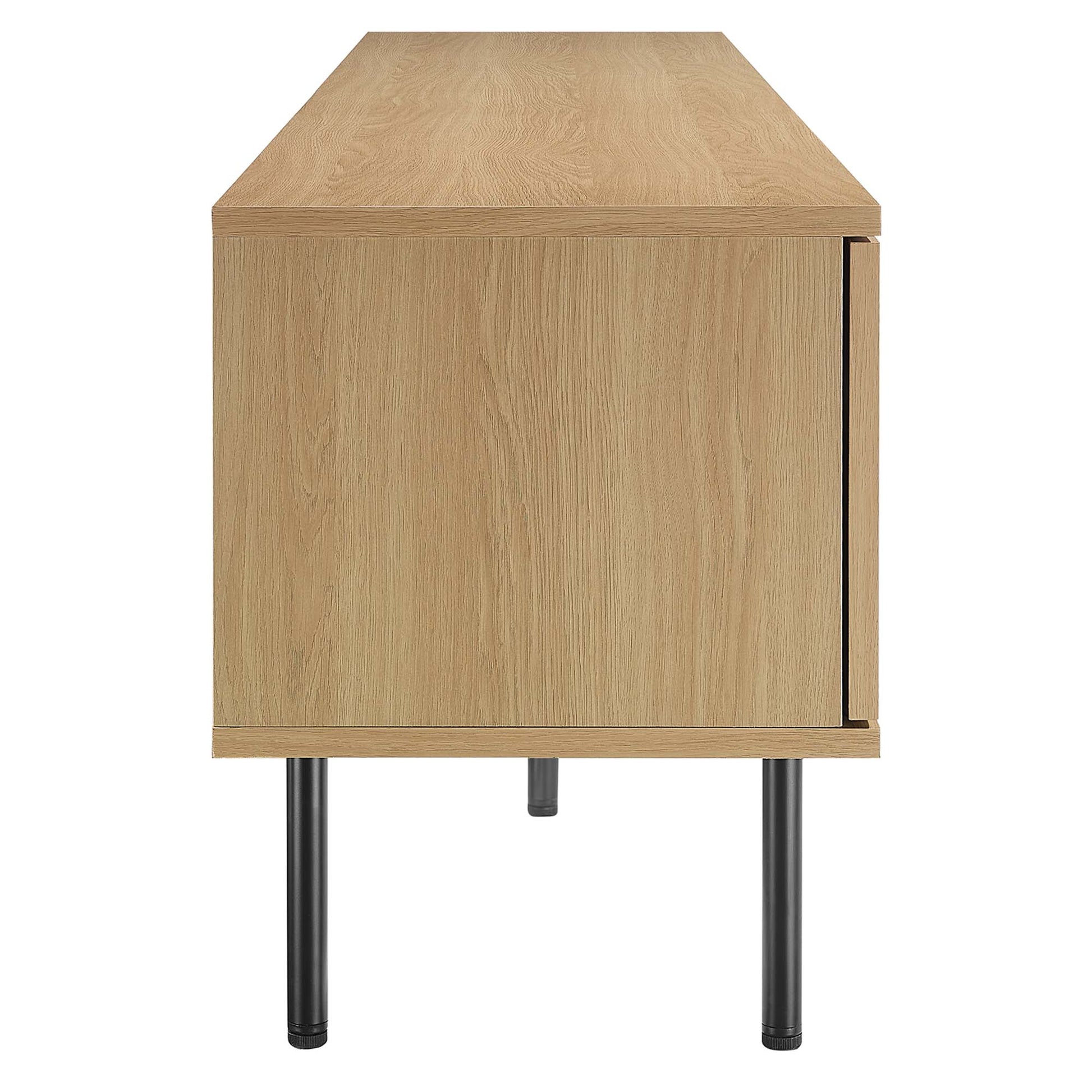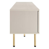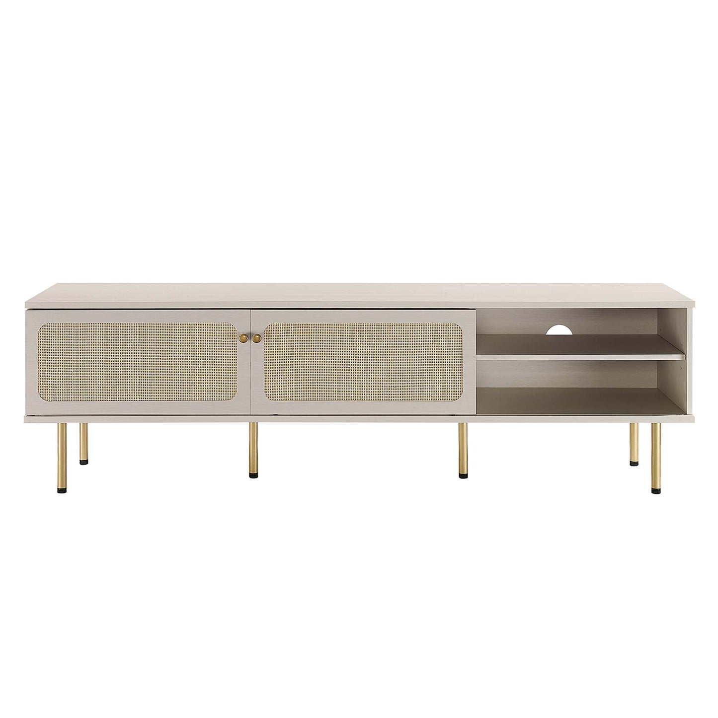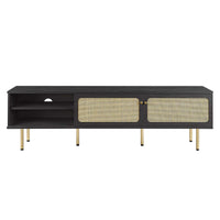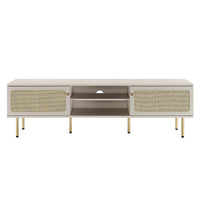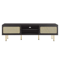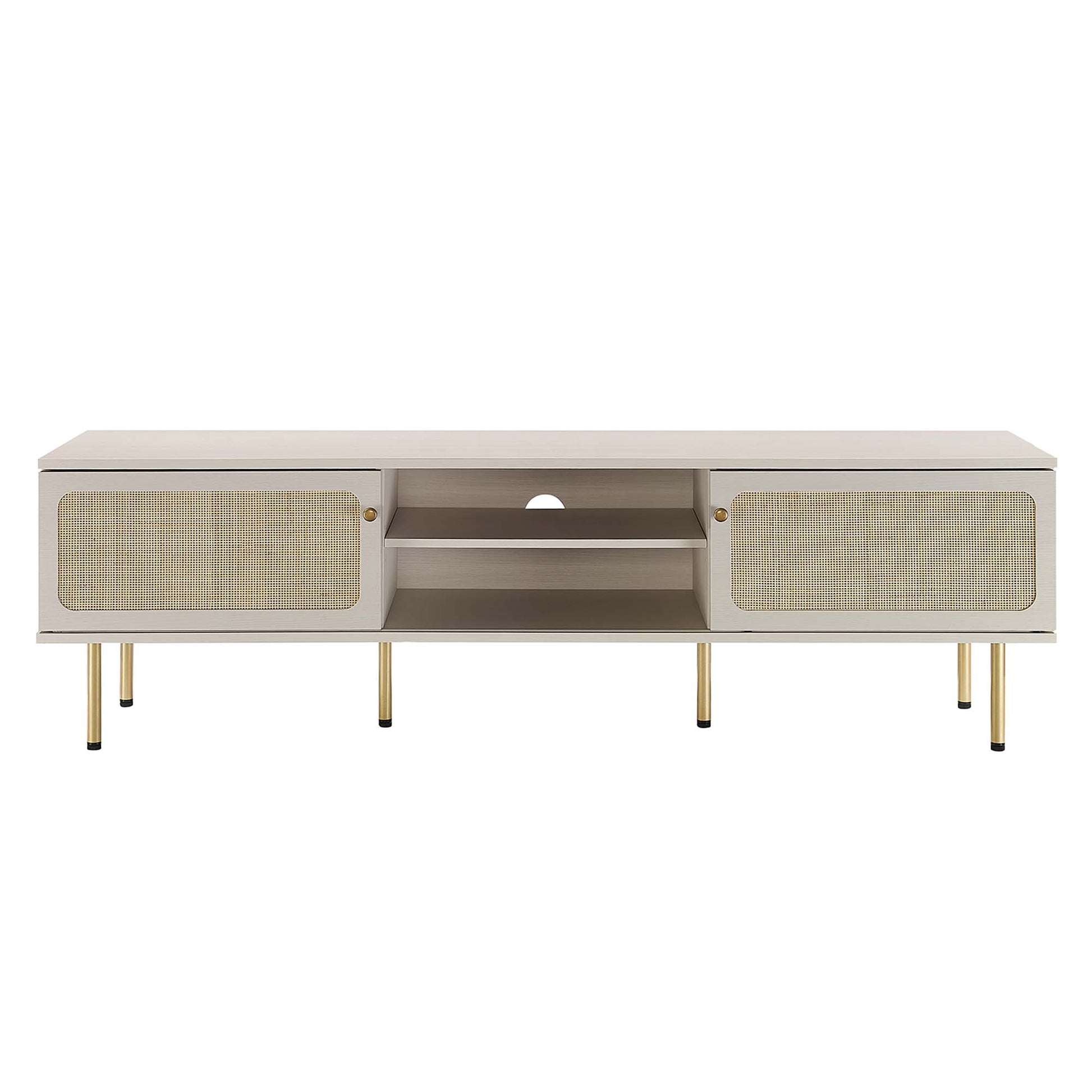 Bring trending organic aesthetics to your living space with the Cambria TV Stand. This entertainment center rests on cylindrical metal legs with non-marking foot caps and features a natural rattan weave along the front of two sliding doors that partially conceal the shelving area. A versatile addition to a living room, bedroom, home office, or lounge area, this media console is crafted with durable particleboard and features three cable management holes that also allow for flow-through ventilation. Keep visual space clean with the ample storage space for media essentials. This entertainment stand accommodates flat screen TVs up to 76". Assembly required. Weight Limit: 220 lbs.