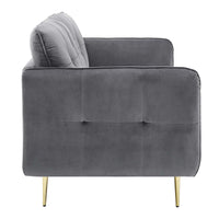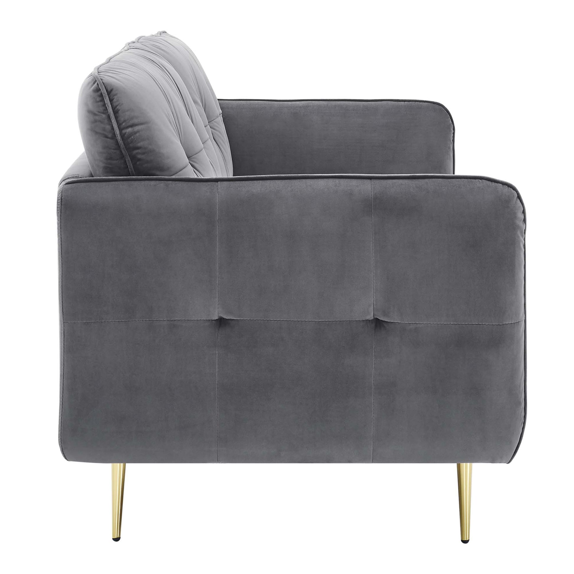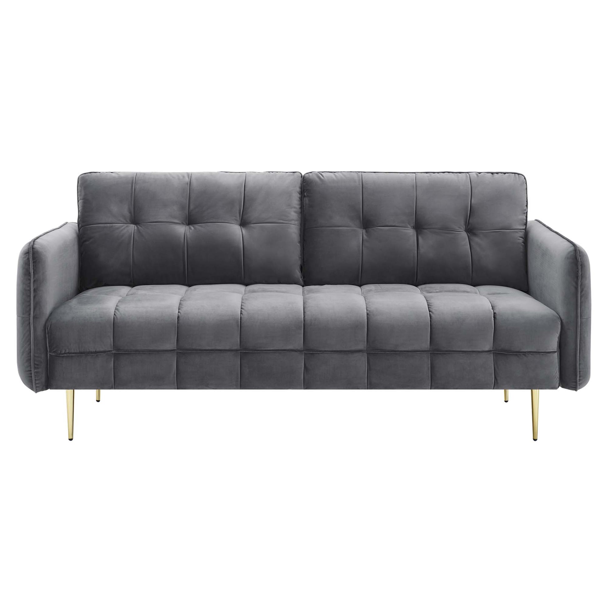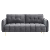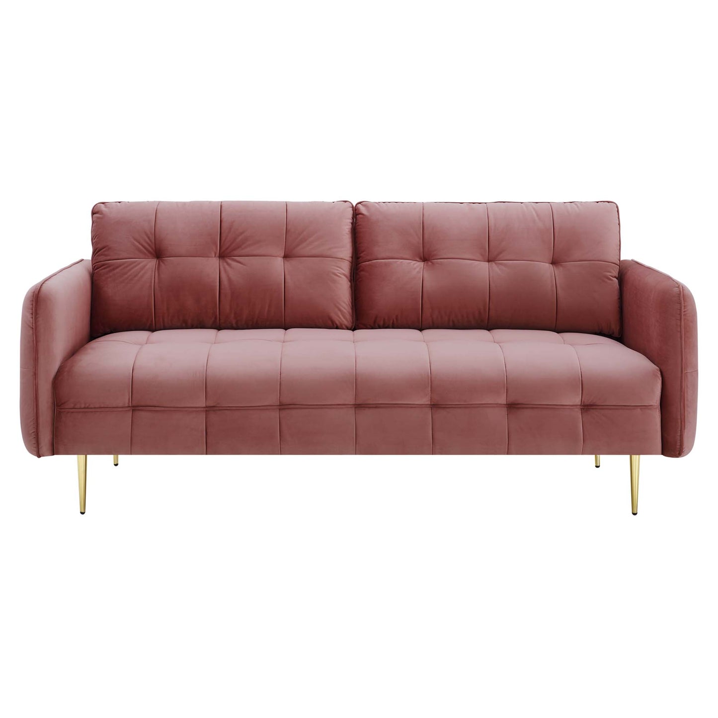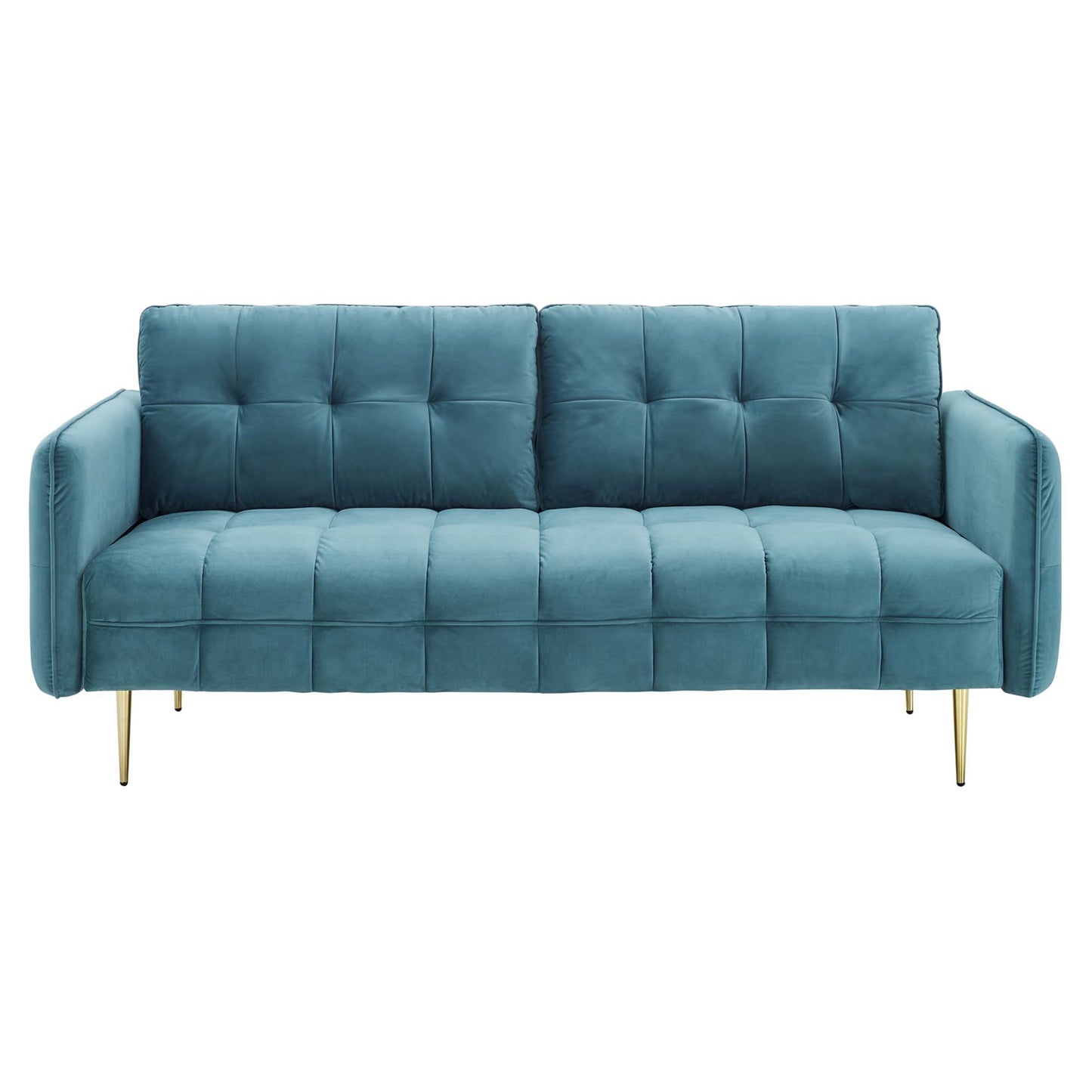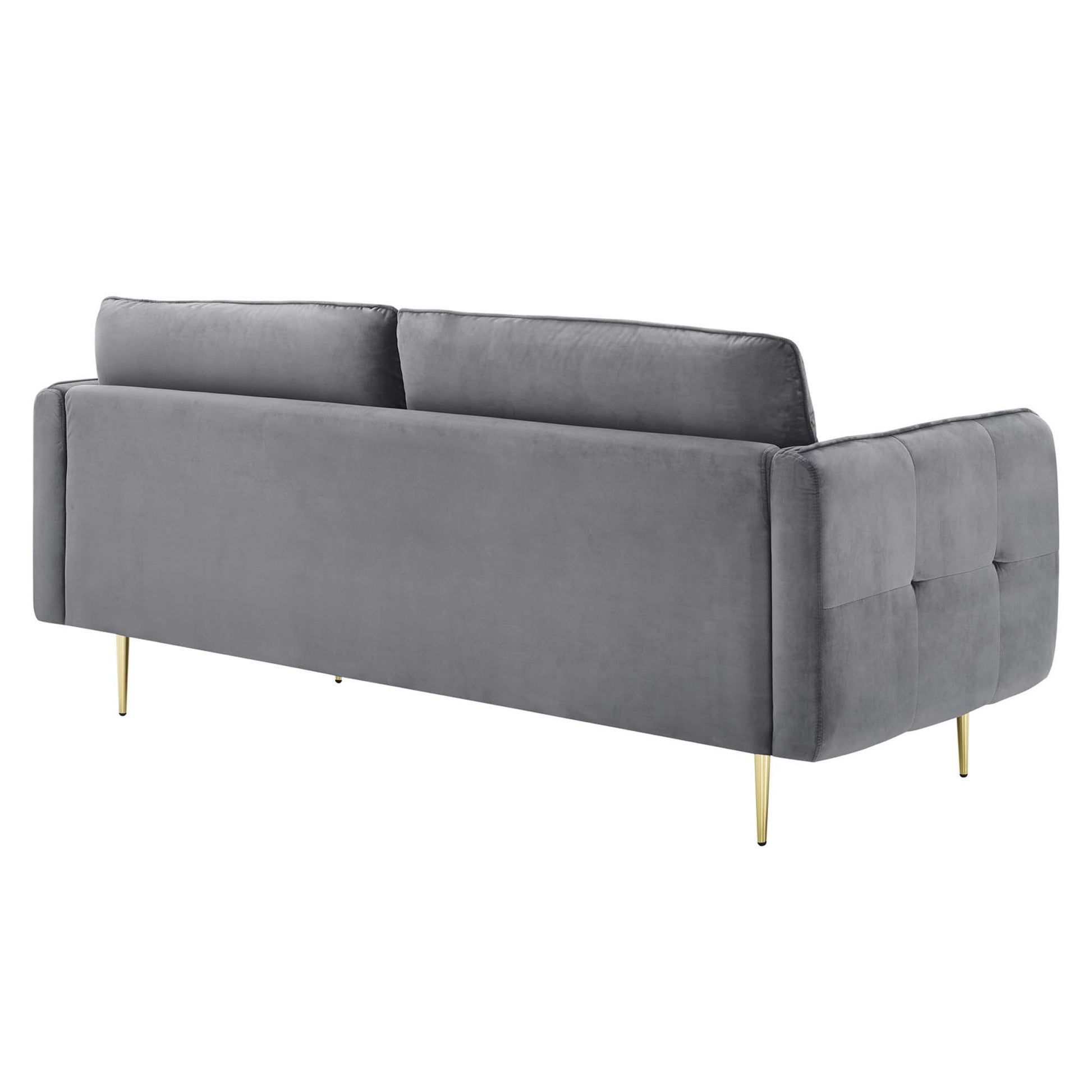 Heighten your living space with the Cameron Tufted Performance Velvet Sofa. Displaying square tufting and French piping detail, this upholstered sofa is rich in glam deco charm and mid-century modern inspiration. Covered in stain-resistant performance velvet, this tufted sofa features dense foam padding and a sinuous spring support system to create a premium seating experience for you and your guests. Sturdily constructed from solid wood, this velvet sofa sits atop polished gold legs with non-marking foot pins. Modernizing the traditional furniture shopping experience, this sofa-in-a-box ships directly to your doorstep in a conveniently portable box with easy-to-follow instructions. This retro modern sofa is an ideal addition to your living room, lounge room, or home office. Assembly required. Sofa Weight Capacity: 900 lbs.