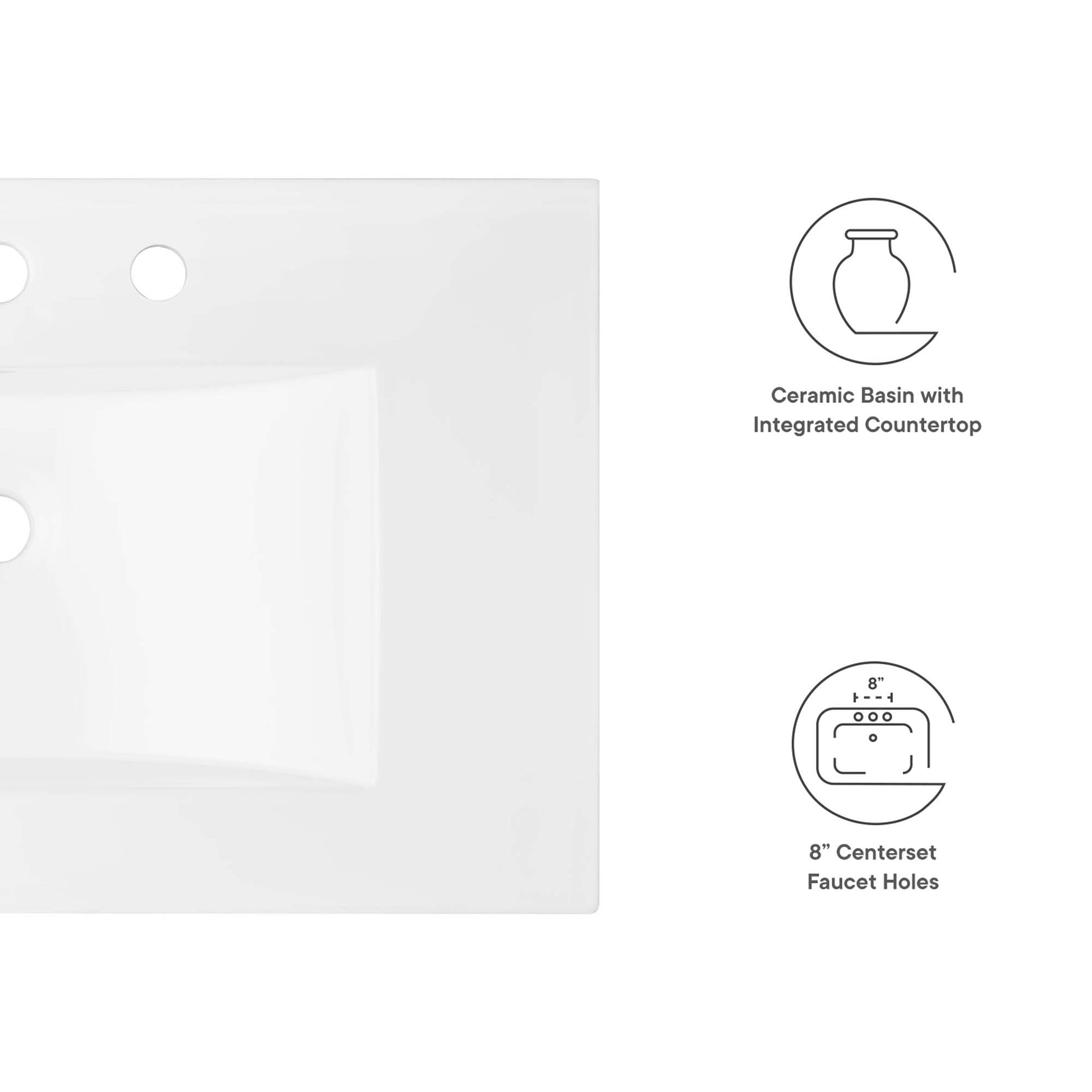 Wash, rinse, and brush in modern style with the Cayman 30" Sink. This ceramic sink boasts 8-inch centerset faucet holes, an integrated countertop, and a rectangular basin design, all coming together to create a modern and sophisticated look for your bathroom space. Elevate your daily routine with this contemporary sink that combines functionality and aesthetic appeal flawlessly.