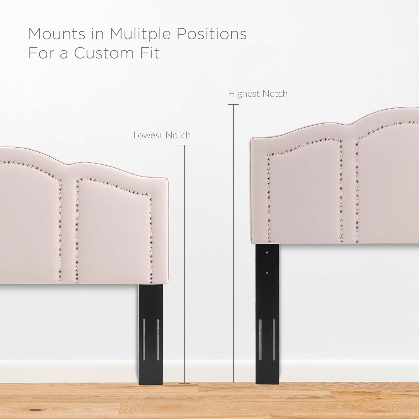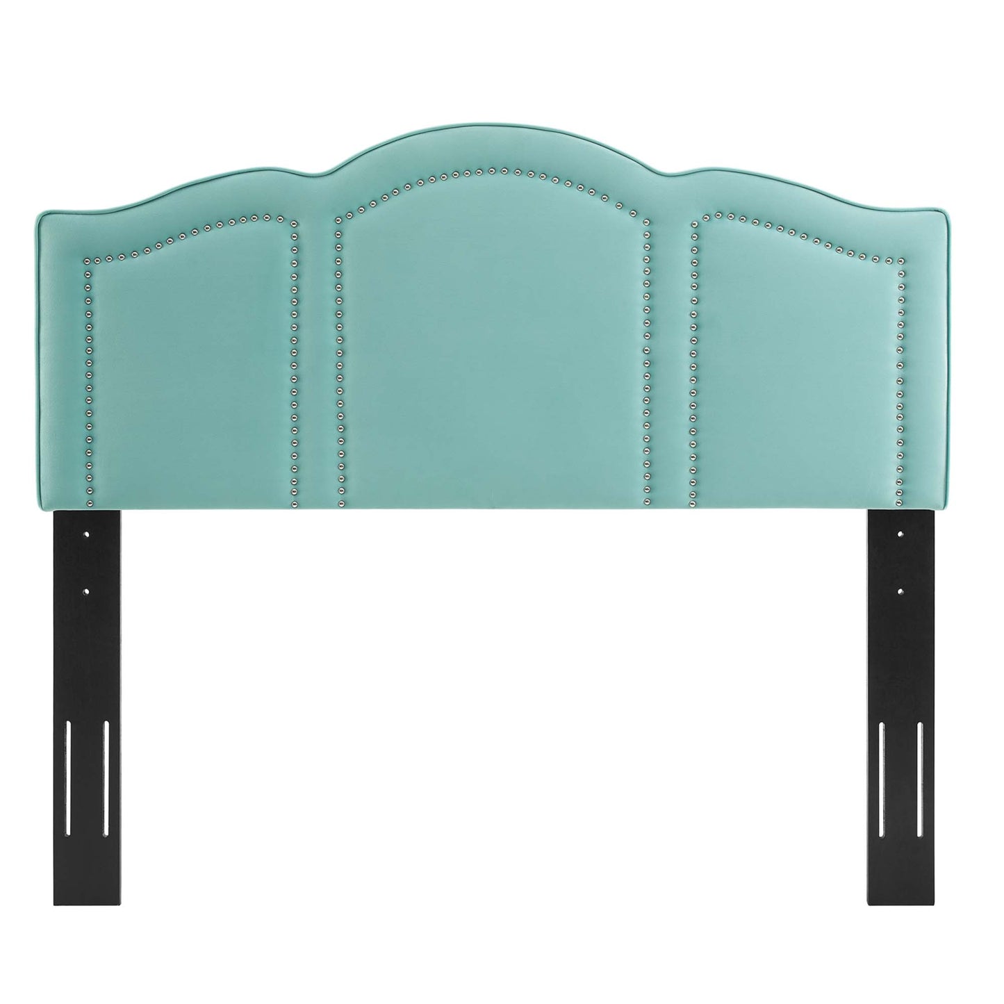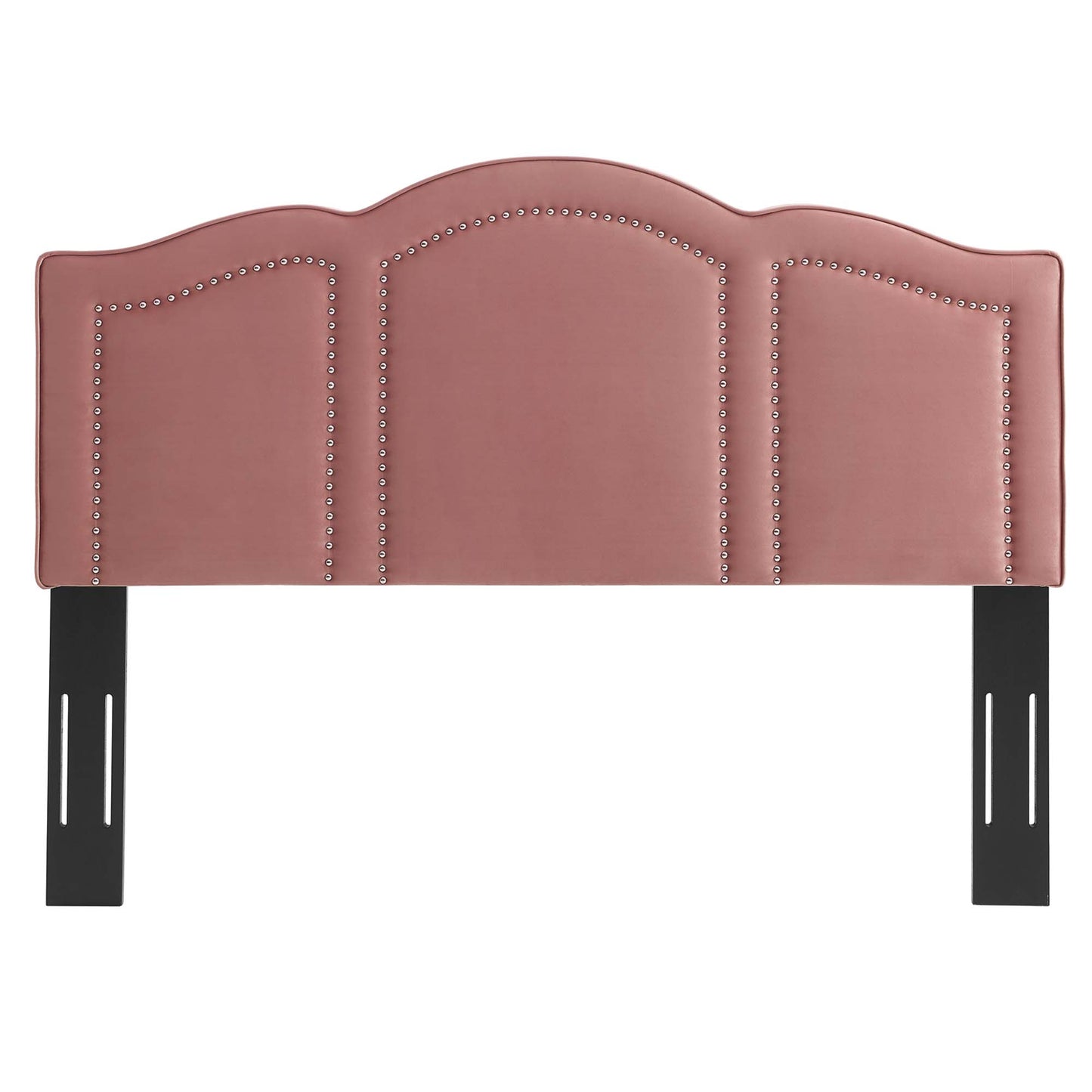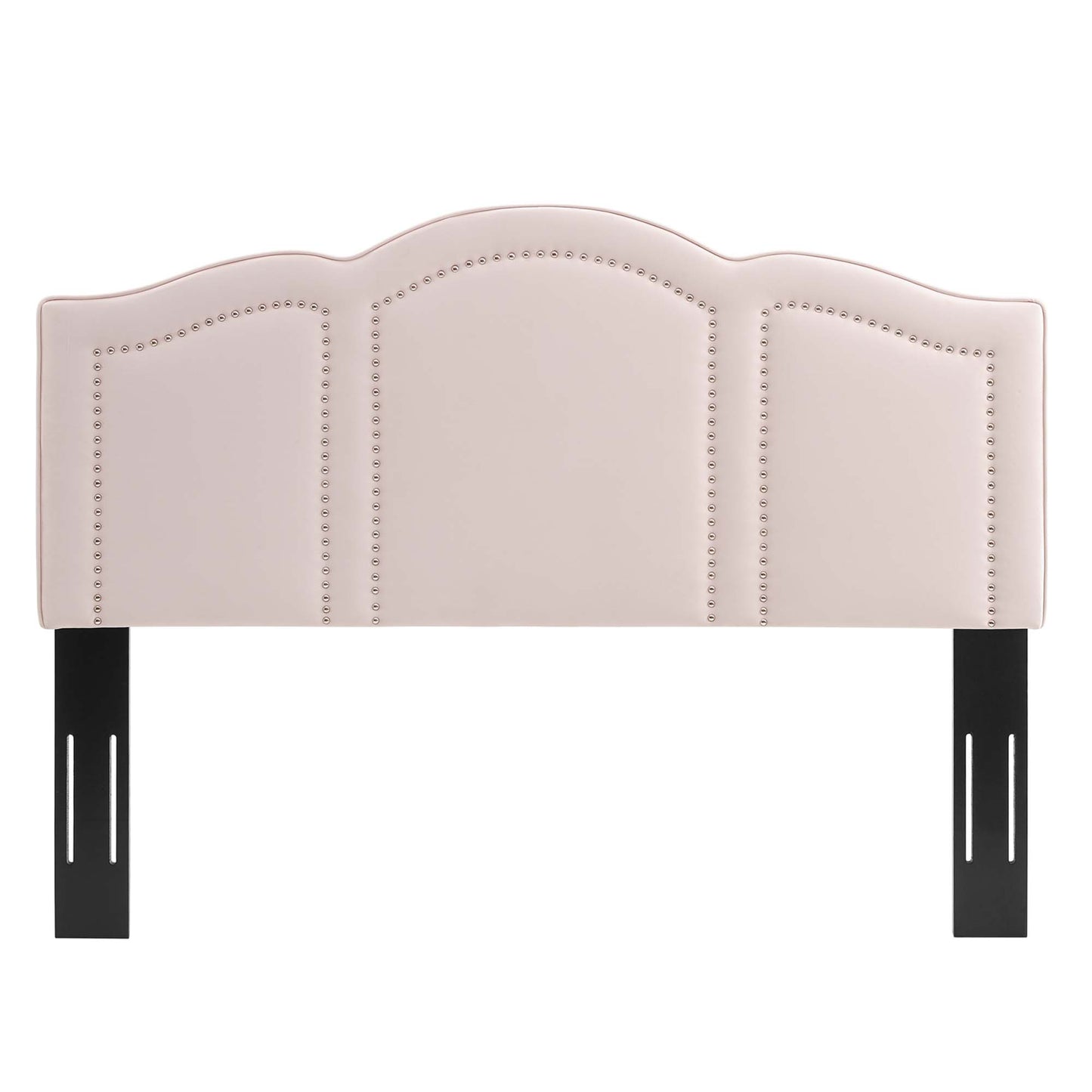 Reimagine the master bedroom or guest bedroom with the glam deco style of the Cecilia Performance Velvet King/California King Headboard. A focal point in the bedroom, this king/Cali king size headboard features classic nailhead trim creating arched window designs that pairs beautifully with its curved silhouette. Covered in soft, stain-resistant performance velvet, this upholstered headboard is padded in dense foam to offer supportive comfort while sitting up in bed reading, relaxing, or watching TV. The perfect backdrop for a variety of bedding and sham styles, this height-adjustable headboard fits king or California king size bed frames with its three mounting positions. Assembly required.
