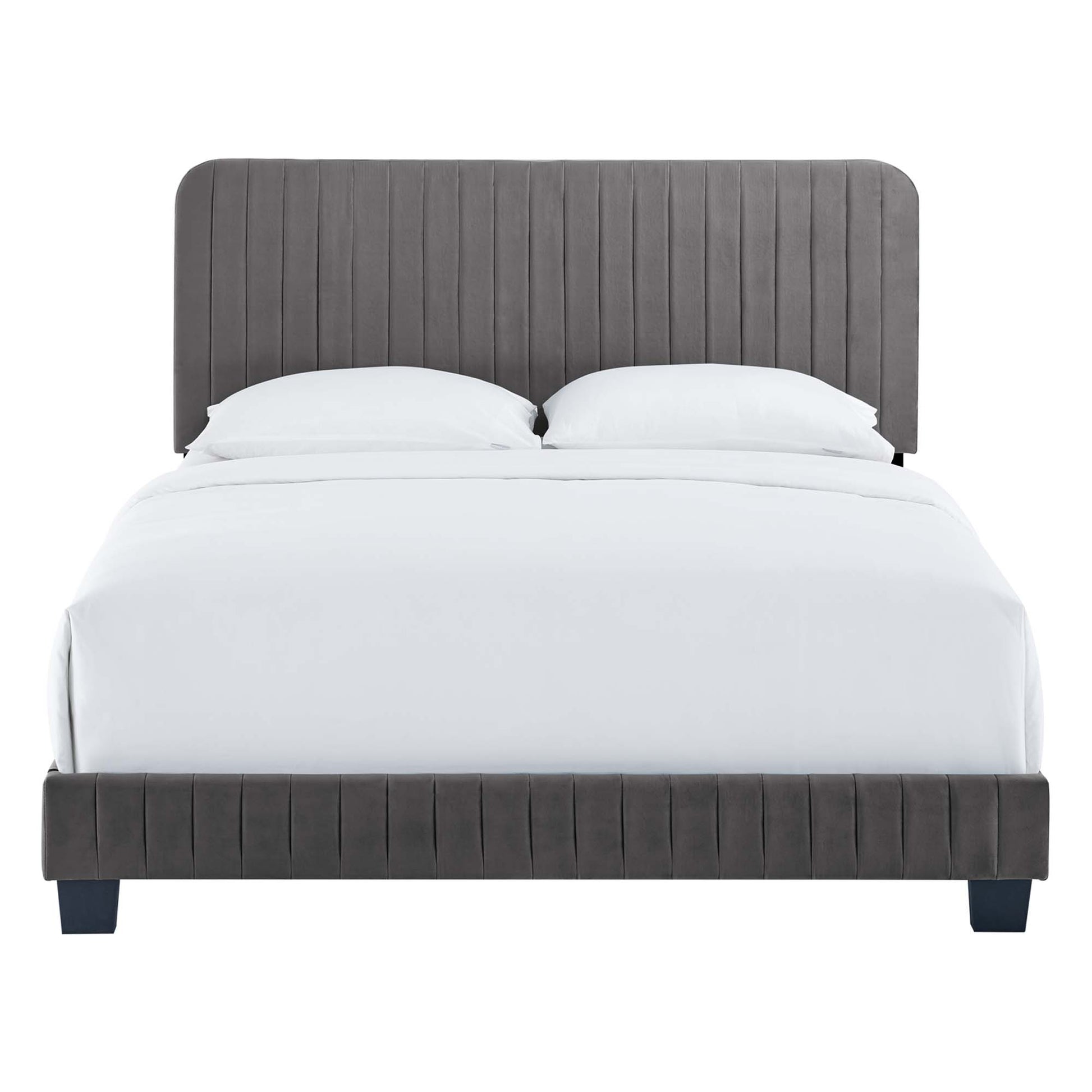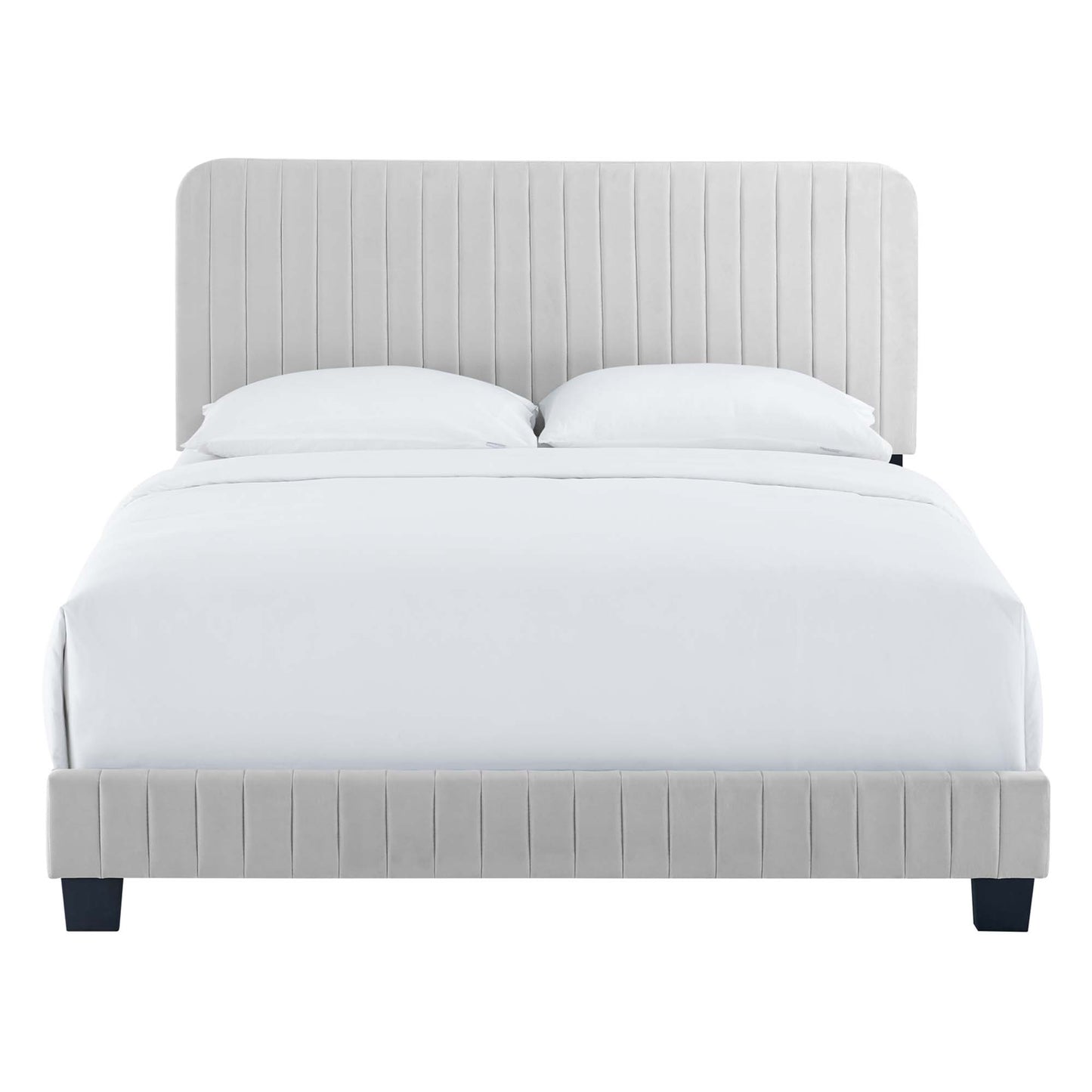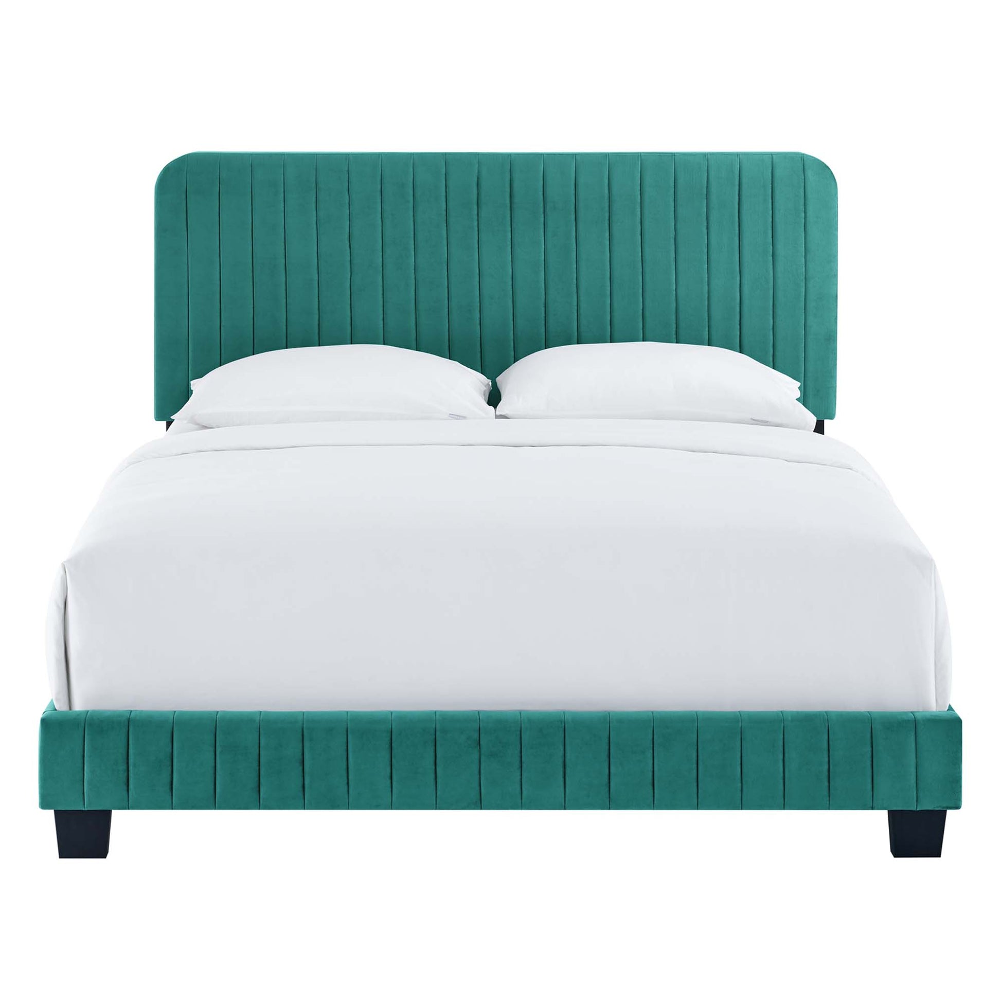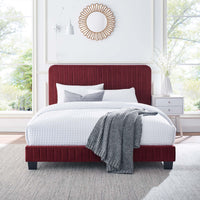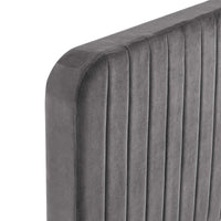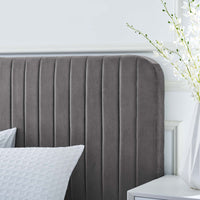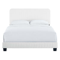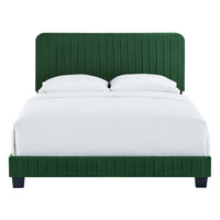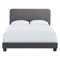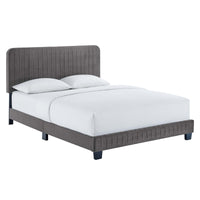 Elevate your master bedroom or guest bedroom style with the luxe texture and glam deco elegance of the Celine King Platform Bed. Adorned with channel tufted detail, the king size headboard of this upholstered bed is padded in dense foam to offer supportive comfort while sitting up resting, relaxing, reading, or watching TV. Upholstered in stain-resistant performance velvet, this platform bed eliminates the need for a box spring with a wood slat support system to allow for ample air circulation and a reinforced center beam and support legs for added durability. A sturdy mattress foundation, this king size platform bed accommodates a variety of mattress styles including innerspring, memory foam, and latex. Assembly required. Weight Limit: 800 lbs.