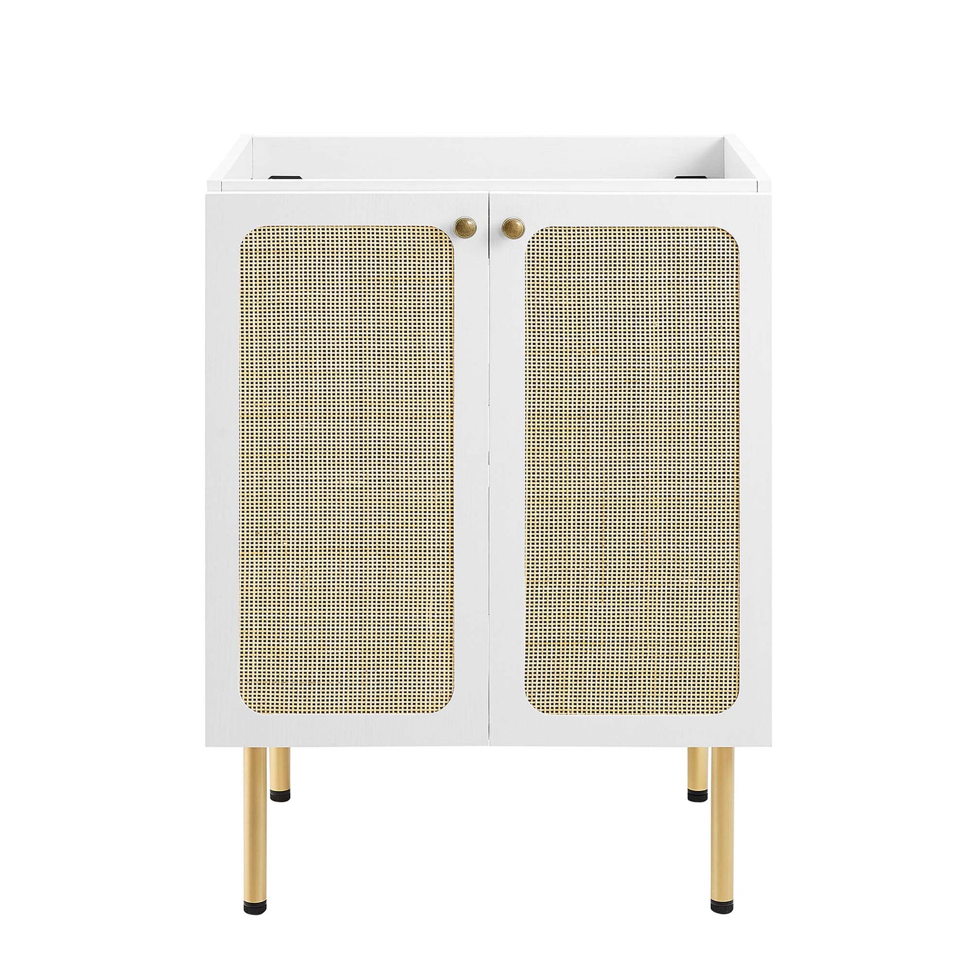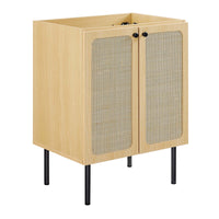 Refresh your washroom with the textured detail of the Chaucer 24" Bathroom Vanity Cabinet. Featuring beautiful rattan weaving on its doors, this vanity cabinet instantly updates any bathroom or powder room. A spacious adjustable top shelf and a fixed bottom shelf hidden behind its hinged doors offers ample storage space for toiletries, towels, and other bathroom essentials. Enriched by stylish round metal cabinet knobs and resting on sleek legs with adjustable feet for added stability, this bathroom cabinet is durably crafted with MDF, particleboard, and wood grain laminate to bring natural organic aesthetics to your decor. Assembly required. Fixtures and sink basin not included. Top Shelf Weight Capacity: 33 lbs. Bottom Shelf Weight Capacity: 66 lbs.