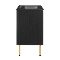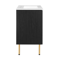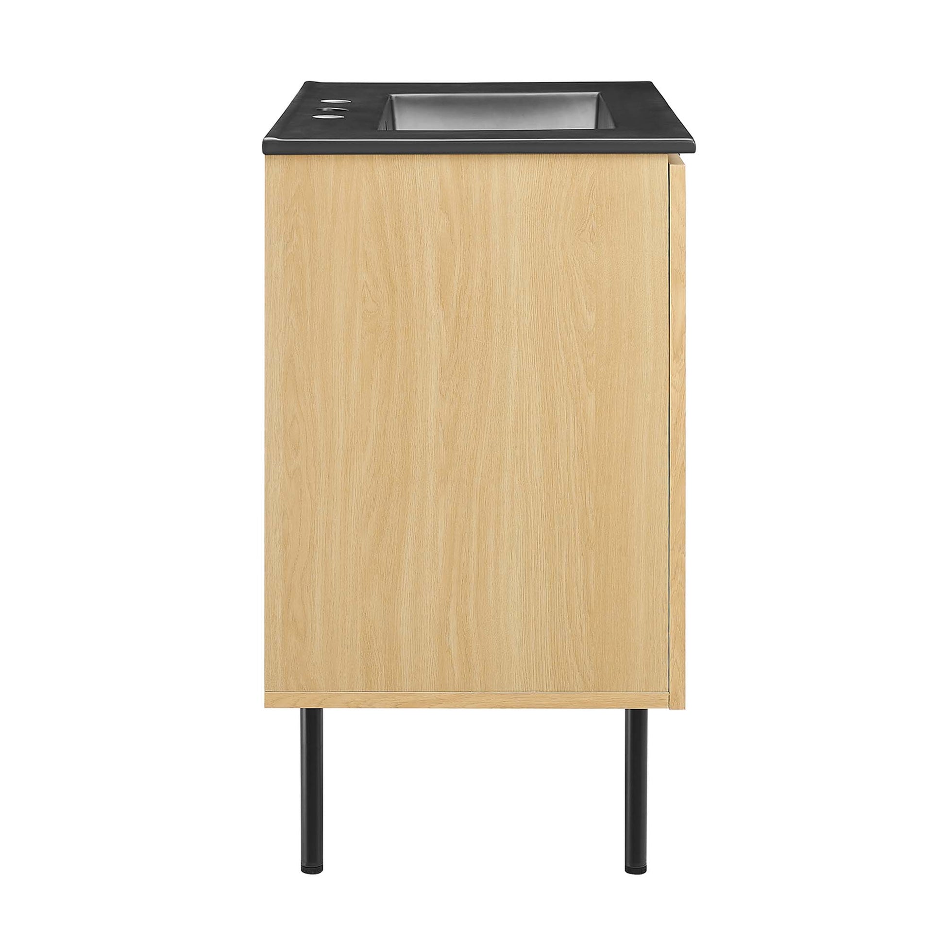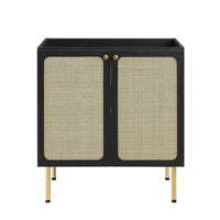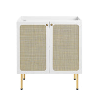 Refresh your washroom with the textured detail of the Chaucer 30" Bathroom Vanity. Featuring beautiful rattan weaving on its doors, this vanity cabinet instantly updates any bathroom or powder room. A spacious adjustable top shelf and a fixed bottom shelf hidden behind its hinged doors offers ample storage space for toiletries, towels, and other bathroom essentials. With a ceramic basin with 8" centerset holes and an integrated countertop, this vanity’s design highlights its sleek countertop for an added touch of elegance. Enriched by stylish round metal cabinet knobs and resting on sleek legs with adjustable feet for added stability, this bathroom cabinet is durably crafted with MDF, particleboard, and wood grain laminate to bring natural organic aesthetics to your decor. Assembly required. Fixtures not included. Top Shelf Weight Capacity: 40 lbs. Bottom Shelf Weight Capacity: 81 lbs.