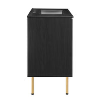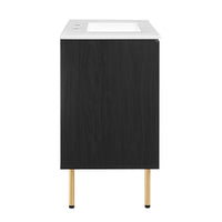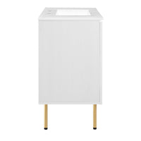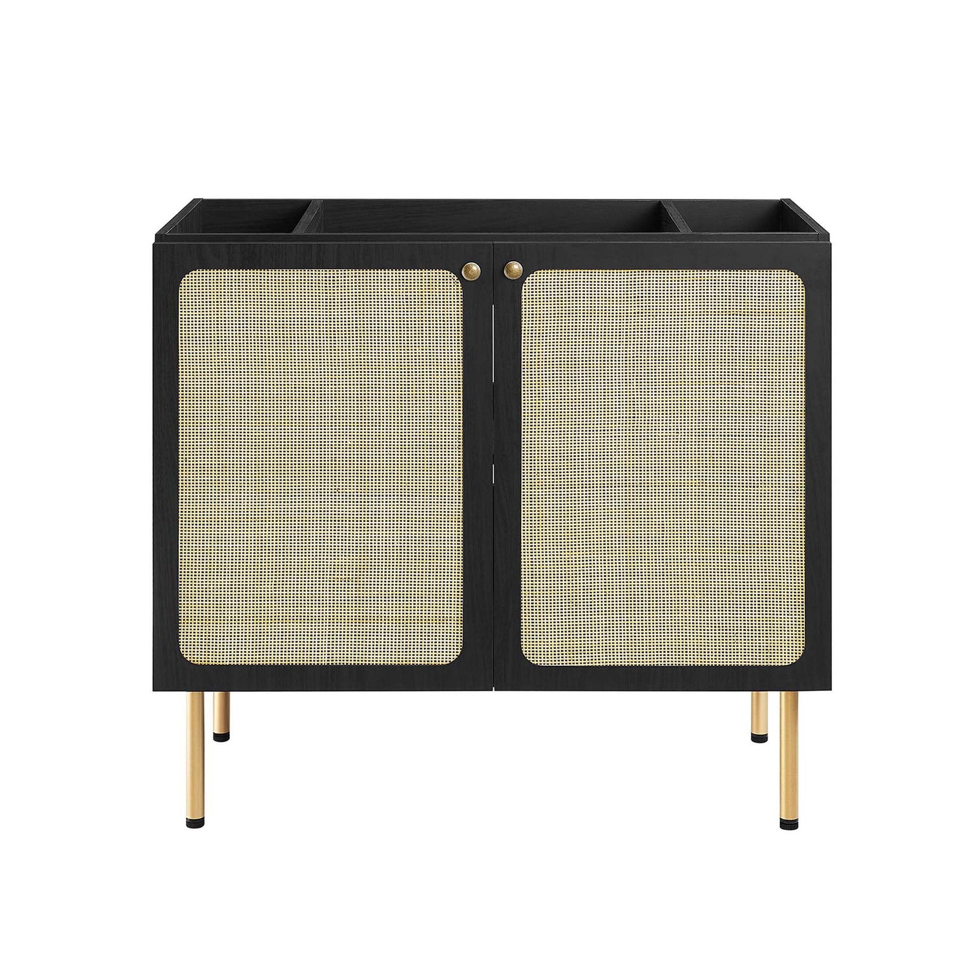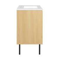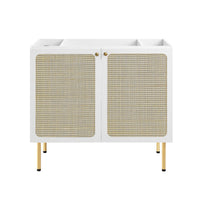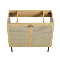 Refresh your washroom with the textured detail of the Chaucer 36" Bathroom Vanity. Featuring beautiful rattan weaving on its doors, this vanity cabinet instantly updates any bathroom or powder room. A spacious adjustable top shelf and a fixed bottom shelf hidden behind its hinged doors offers ample storage space for toiletries, towels, and other bathroom essentials. With a ceramic basin with 8" centerset holes and an integrated countertop, this vanity’s design highlights its sleek countertop for an added touch of elegance. Enriched by stylish round metal cabinet knobs and resting on sleek legs with adjustable feet for added stability, this bathroom cabinet is durably crafted with MDF, particleboard, and wood grain laminate to bring natural organic aesthetics to your decor. Assembly required. Fixtures not included. Top Shelf Weight Capacity: 48 lbs. Bottom Shelf Weight Capacity: 99 lbs.