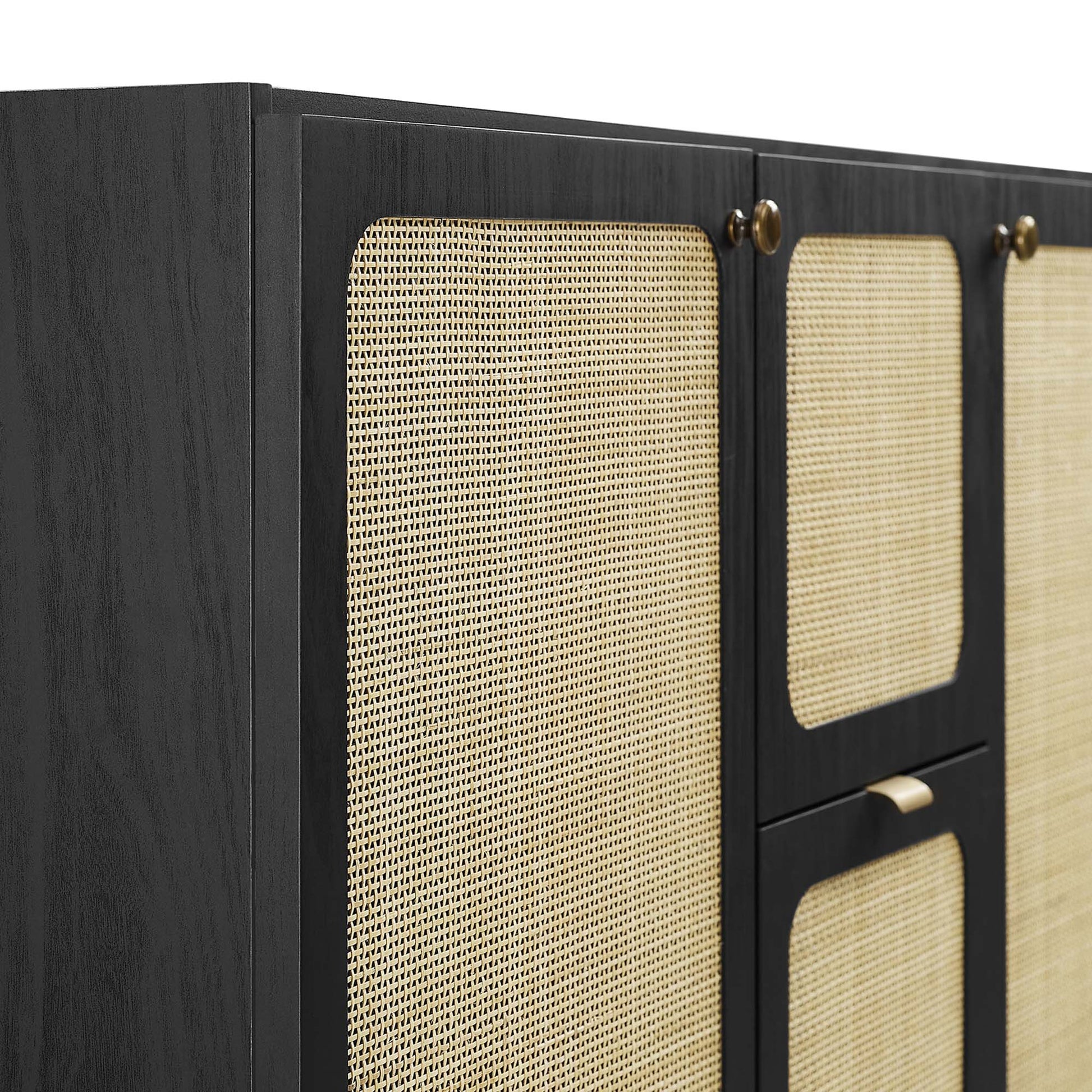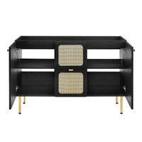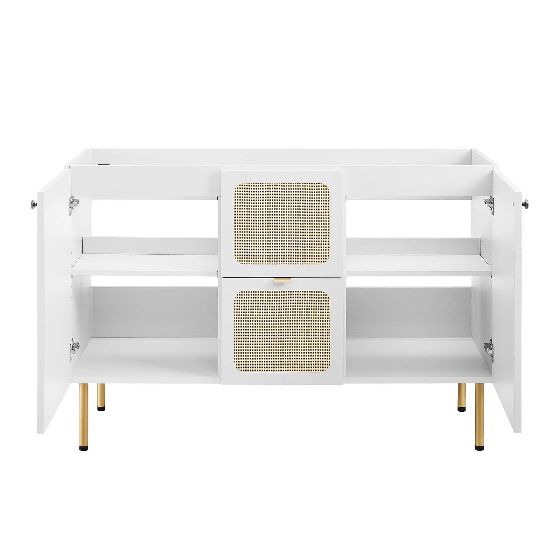 Refresh your washroom with the textured detail of the Chaucer 48" Bathroom Vanity Cabinet. Featuring beautiful rattan weaving on its doors, this vanity cabinet instantly updates any bathroom or powder room. A spacious bottom drawer and a decorative top drawer sit between two hinged doors, each opening to reveal an adjustable top shelf and a fixed bottom shelf, offering ample storage space for toiletries, towels, and other bathroom essentials. Enriched by stylish round metal cabinet knobs on its cabinet doors and a finger edge pull handle on its drawer, this vanity rests on sleek legs with adjustable feet for added stability. Durably crafted with MDF, particleboard, and wood grain laminate this bathroom vanity brings natural organic aesthetics to your decor. Assembly required. Fixtures and sink basin not included. Top Shelf Weight Capacity: 24 lbs. Bottom Shelf Weight Capacity: 46 lbs.