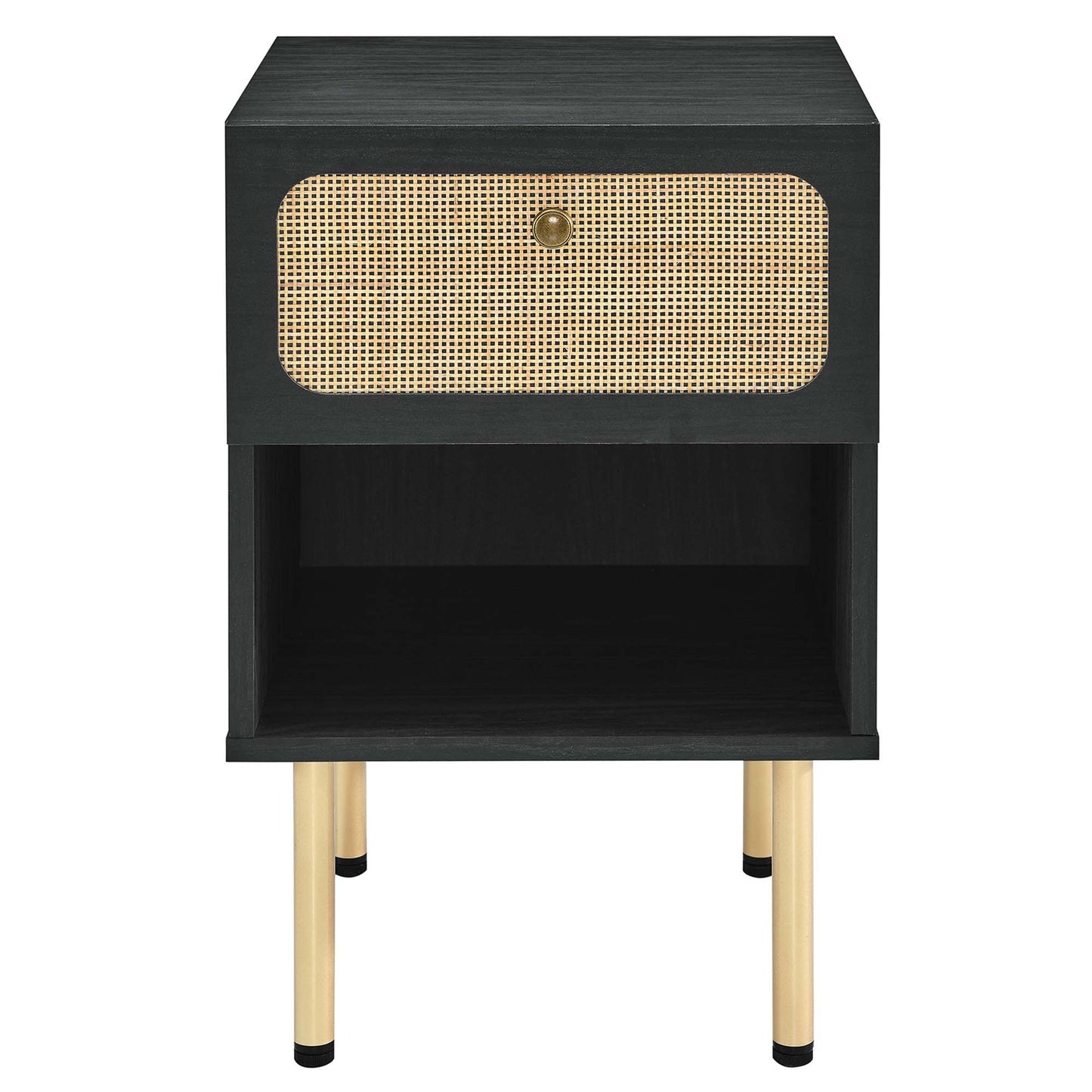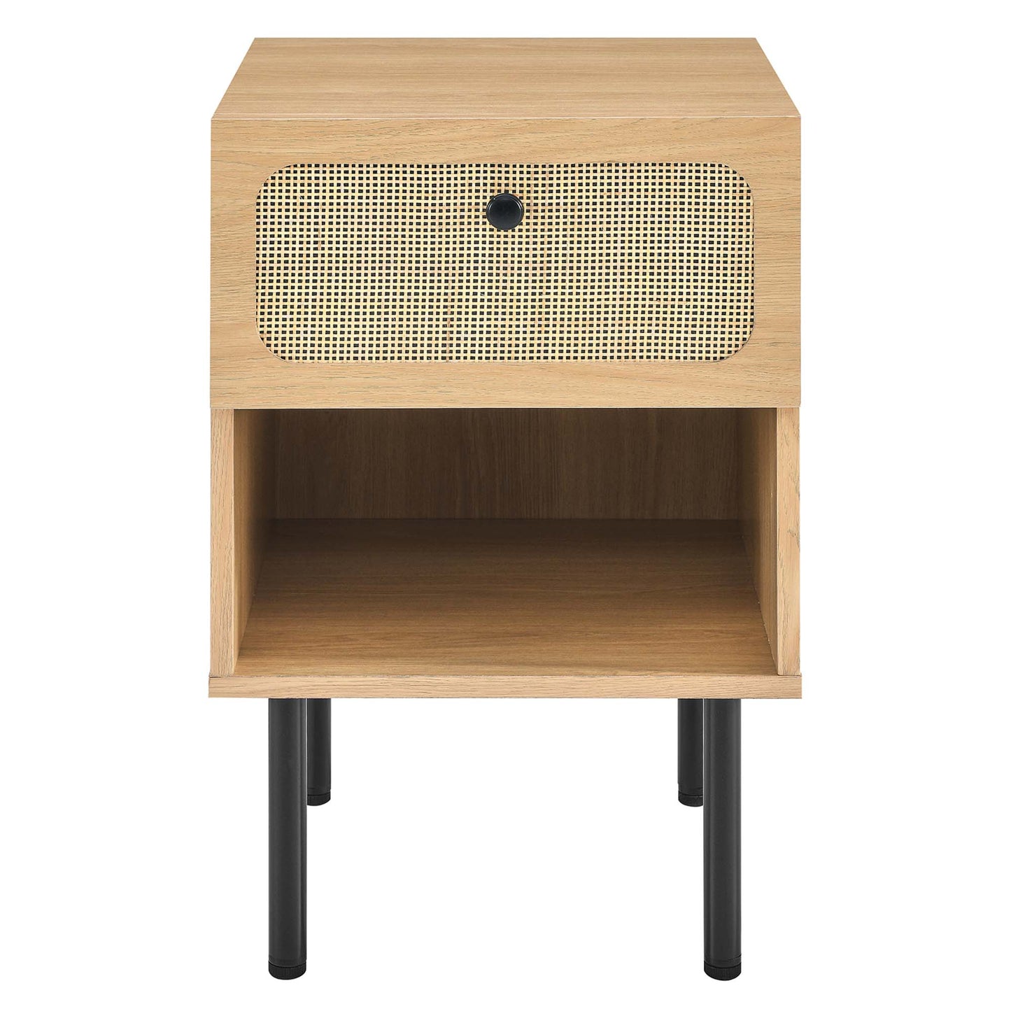 Refresh a bedroom with the textured detail of the Chaucer Nightstand. Featuring beautiful oval rattan weaving on the drawer front, this nightstand updates a primary bedroom or guest room while also making a statement in a living space as an accent table. A spacious full-extension drawer and open shelf offer ample storage space for all your bedtime essentials. Resting on adjustable feet with non-marking pads, this bedside table is durably crafted with particleboard and a wood grain laminate to bring natural organic aesthetics to your bedroom decor. Assembly required