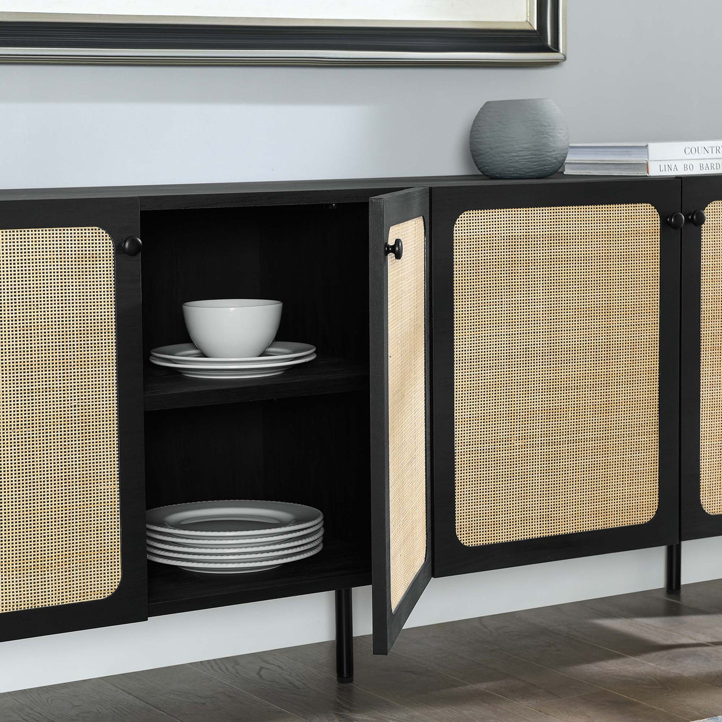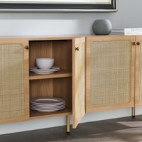 Refresh your living space with the textured detail of the Chaucer Sideboard. Featuring beautiful rattan weaving on the doors, this credenza updates a living room, entryway, dining room, hallway or lounge area. A spacious shelving area hidden behind the hinged doors offers ample storage space for linens, home décor, china, silverware, barware, and more. Resting on sleek legs with adjustable feet for added stability, this buffet table is durably crafted with particleboard and wood grain laminate to bring natural organic aesthetics to your décor. Assembly required. Shelf Weight Capacity: 44 lbs. Please Note: When placing the TV directly on the unit, we recommend anchoring it in place.