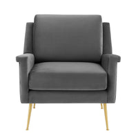 Redefine your living space with the modern design and glam deco style of the Chesapeake Performance Velvet Accent Armchair. Featuring a tailored profile and subtle flared silhouette, this velvet chair refreshes a living room, entryway, den, office, or bedroom sitting area. Offering a luxurious seating experience, this accent chair is upholstered in stain-resistant performance velvet and padded with dense foam for ultimate comfort. Resting atop brushed gold stainless steel legs, this living room armchair is crafted with solid wood and plywood and supports up to 300 lbs.