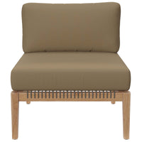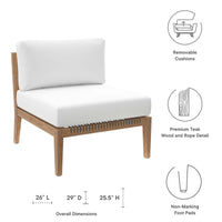 Bask in warm weather as you lounge on the Clearwater Outdoor Patio Furniture Collection. Bringing contemporary aesthetics to a backyard, porch, patio, deck, or poolside, this outdoor armless chair features woven rope webbing underneath the foam padded cushions that grants breezy, coastal charm. Rest and relax amidst comfortable cushions with removable all-weather covers for easy cleaning. The base of this patio armless chair is crafted with grade A premium teak wood that boasts a beautiful, rich wood grain and is naturally weather-resistant. Includes non-marking foot glides to protect flooring. Weight Capacity: 498 lbs.