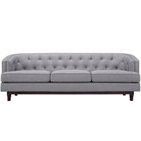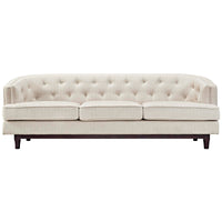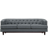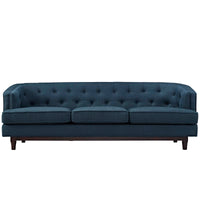 Sale the tide of elegance with Coast. Buoyed with exquisite deep button tufting and fine trim, Coast comes upholstered in polyester with a walnut stained wood leg base with non-marking foot glides. Solidly made with exceptional support, Coast features dense foam cushioning, removable seat covers for easy cleaning and generous seating space. Combining mid-century style with ageless nobility, the Coast sofa is perfect for modern and eclectic living rooms, lounge spaces, and reception areas.
