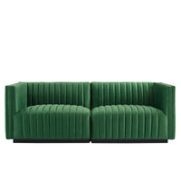 Modern appeal surrounds the Conjure Channel Tufted Performance Velvet Upholstered Loveseat. Luxuriously soft, stain-resistant performance velvet upholstery covers dense foam padding and an individually wrapped spring coil system for a supportive living room loveseat that will become the go-to lounge spot for family and friends. Vertical channel tufting and subtle French piping adds depth to this vintage inspired two-seater sofa that effortlessly becomes the focal point in your living room. Solidly constructed from wood and plywood, this loveseat features non-marking foot caps and boasts a matte black base. Versatile and elegant, this sectional loveseat is ideally suited for a variety of decor styles in your living room, lounge, or home office. Each Seat Weight Capacity: 331 lbs.