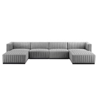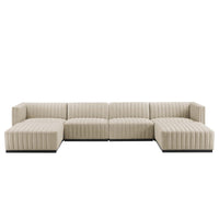 Modern appeal surrounds the Conjure Channel Tufted Upholstered Fabric 6-Piece Sectional Sofa. Soft and durable fabric upholstery covers dense foam padding and an individually wrapped spring coil system for a supportive living room sofa that will become the go-to lounge spot for family and friends. Vertical channel tufting and subtle French piping adds depth to this vintage inspired sectional sofa that effortlessly becomes the focal point in your living room. Solidly constructed from wood and plywood, this sofa features non-marking foot caps and boasts a matte black base. Versatile and elegant, this sectional sofa is ideally suited for a variety of decor styles in your living room, lounge, or home office. Each Seat Weight Capacity: 331 lbs.