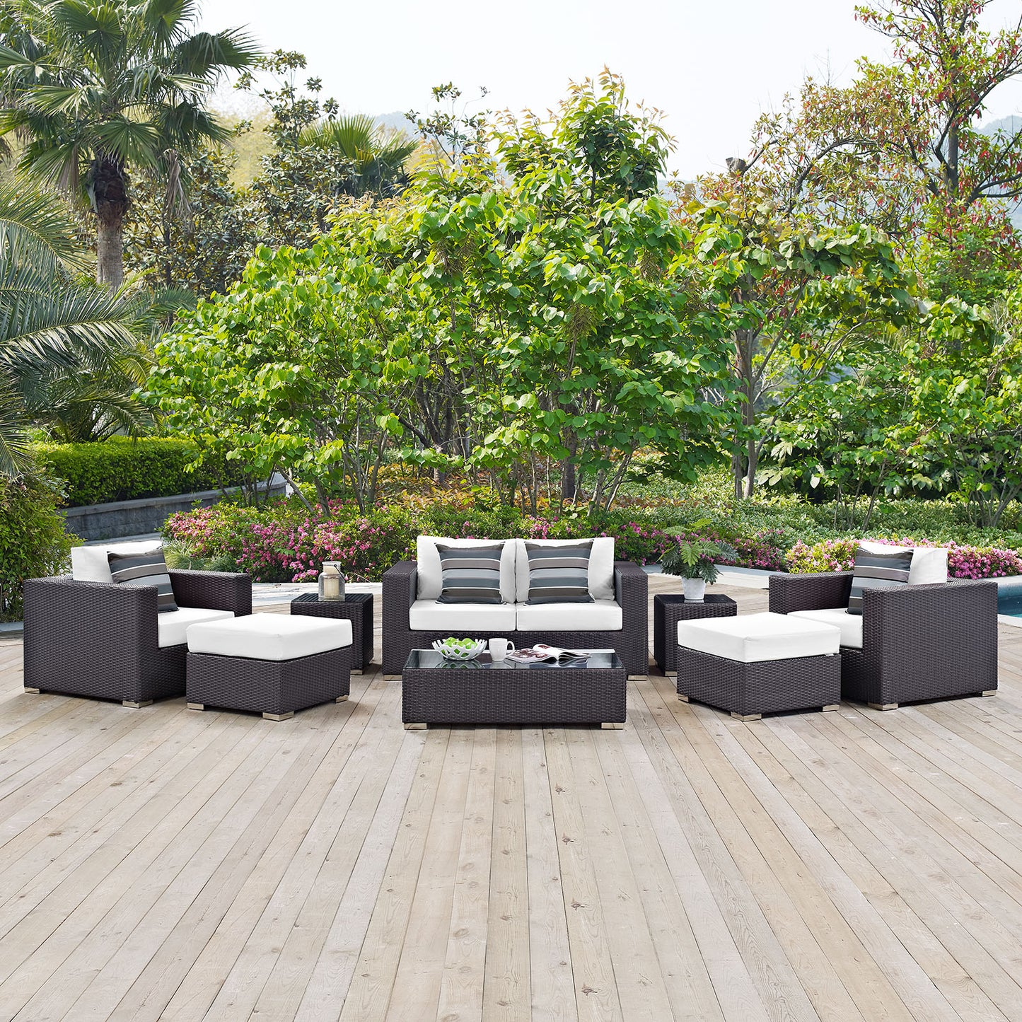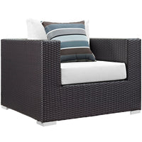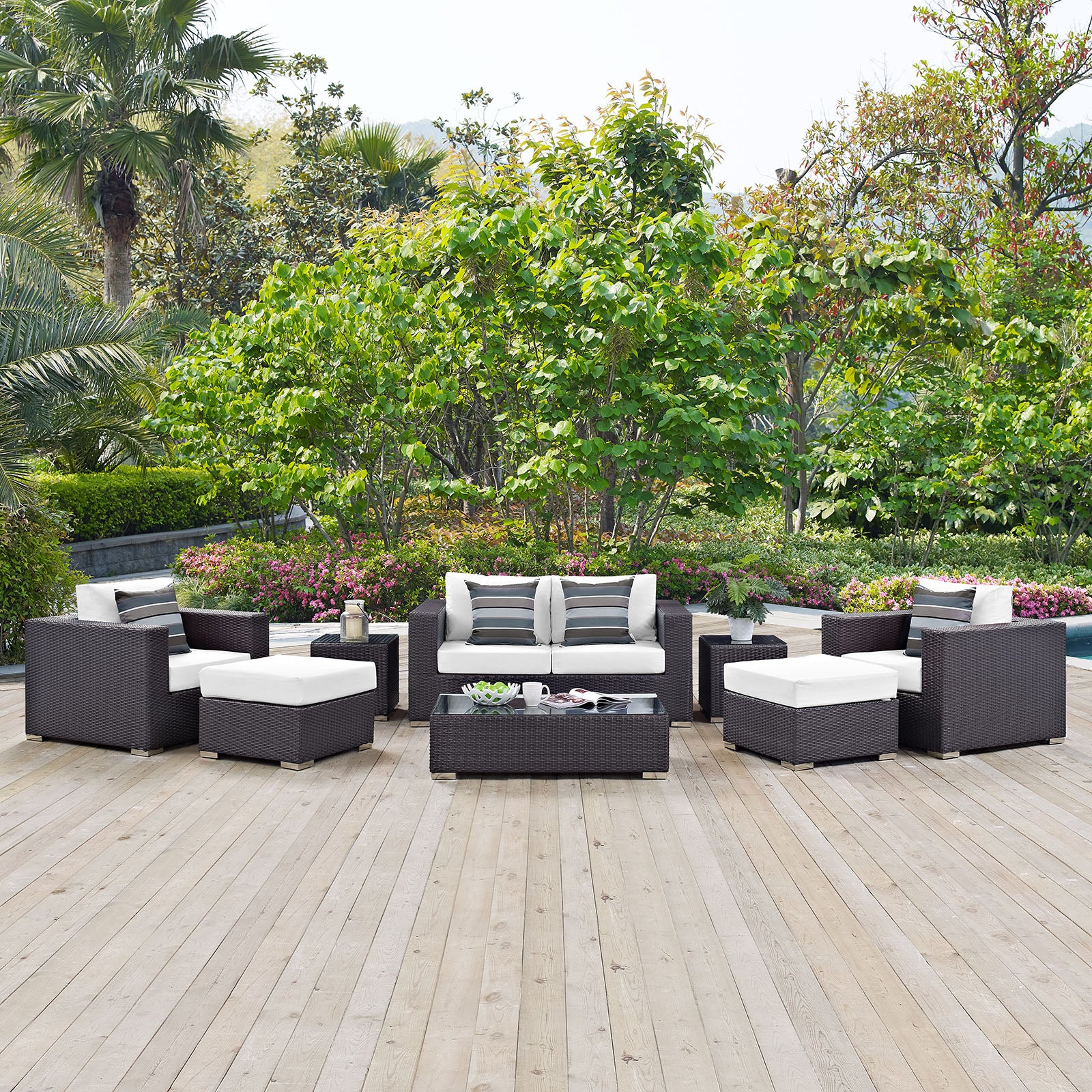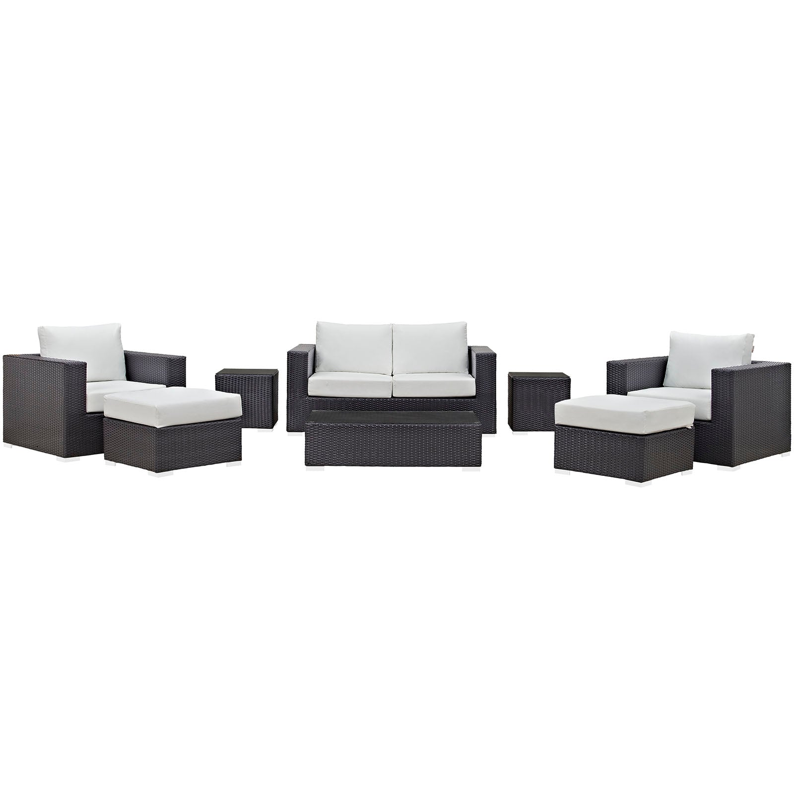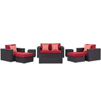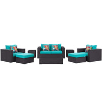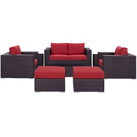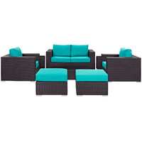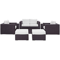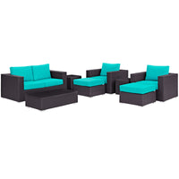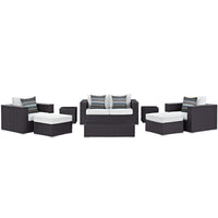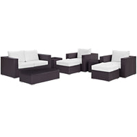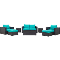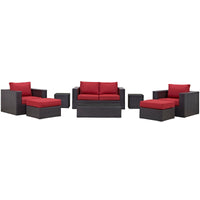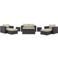 Gather stages of sensitivity with the Convene Outdoor Sectional series. Made with a synthetic rattan weave and a powder-coated aluminum frame, Convene is a versatile outdoor furniture set that shifts and combines according to the spontaneous needs of the moment. Outfitted with all-weather fabric cushions, leave a positive impression on friends and family while enhancing your patio, backyard, or poolside repast in this series of palpable distinction. This installment of the series is an Outdoor Patio Sectional Sofa Set.