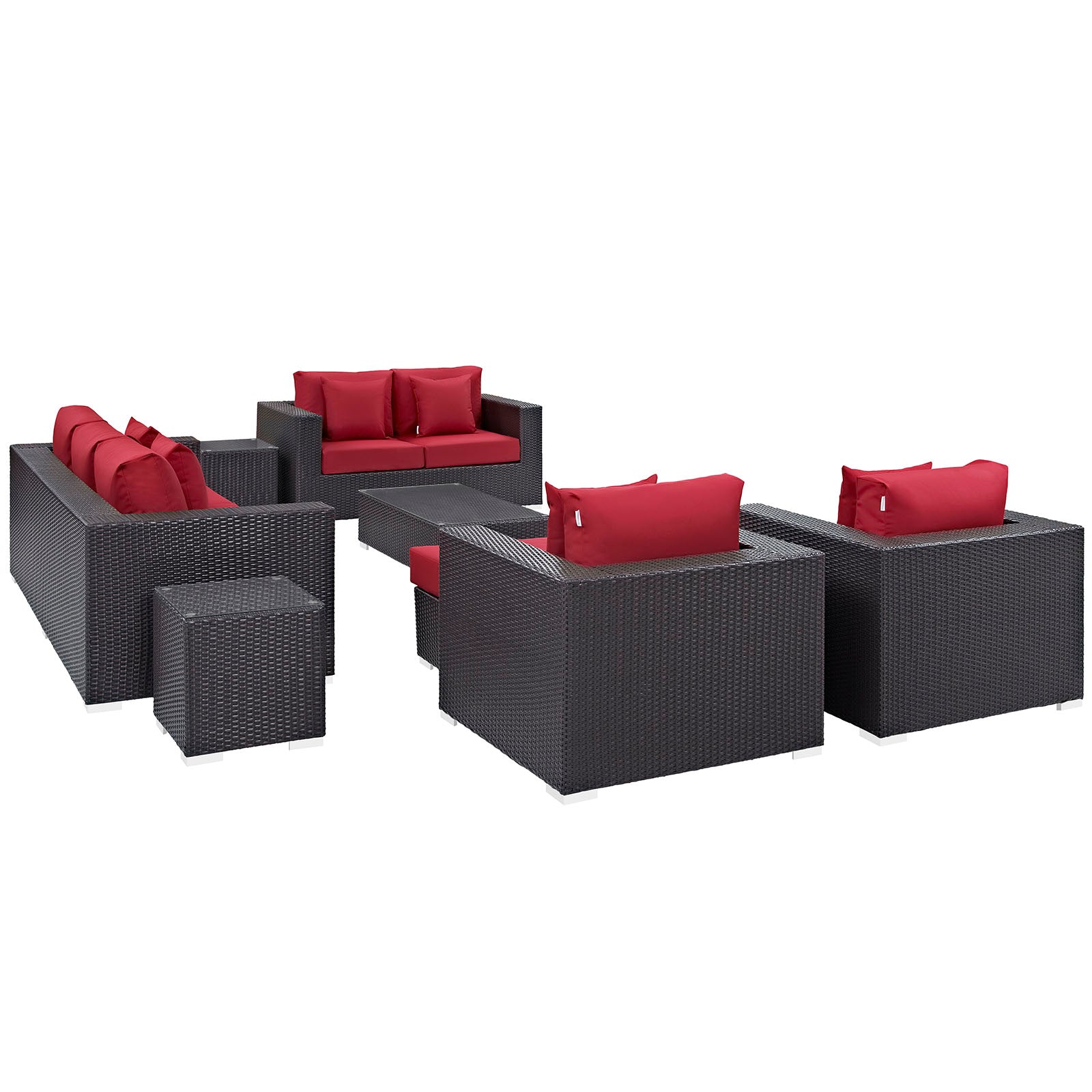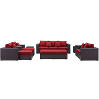 Gather stages of sensitivity with the Convene Outdoor Sectional series. Made with a synthetic rattan weave and a powder-coated aluminum frame, Convene is a versatile outdoor furniture set that shifts and combines according to the spontaneous needs of the moment. Outfitted with all-weather fabric cushions, leave a positive impression on friends and family while enhancing your patio, backyard, or poolside repast in this series of palpable distinction. This installment of the series is an Outdoor Patio Sectional Sofa Set.