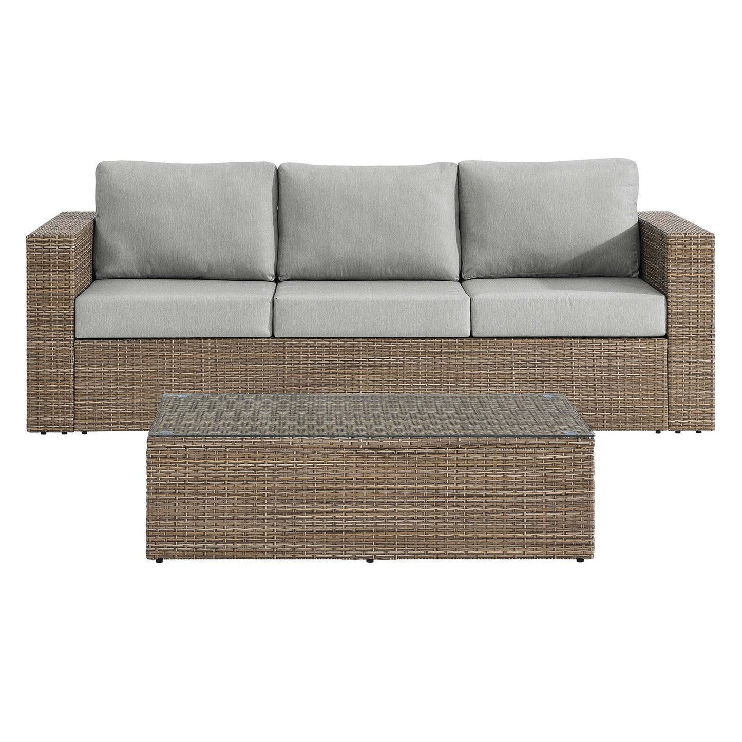 Surround yourself with warm weather and good company with the Convene Outdoor Collection. Made with synthetic rattan weave and powder-coated aluminum frames, this outdoor sofa and coffee table set leaves a positive impression on your guests while enhancing your patio, backyard, porch, or poolside with modern style and appreciated texture. A lasting all-weather addition to your outdoor space, this patio sofa is complete with dense foam padded cushions with water-resistant zippered covers and non-marking foot pads to protect your flooring. The outdoor coffee table features an easy-to-clean tempered glass top. Assembly required. Easy to follow instructions included. Set Includes: 1 Sofa, 1 Coffee Table