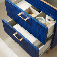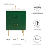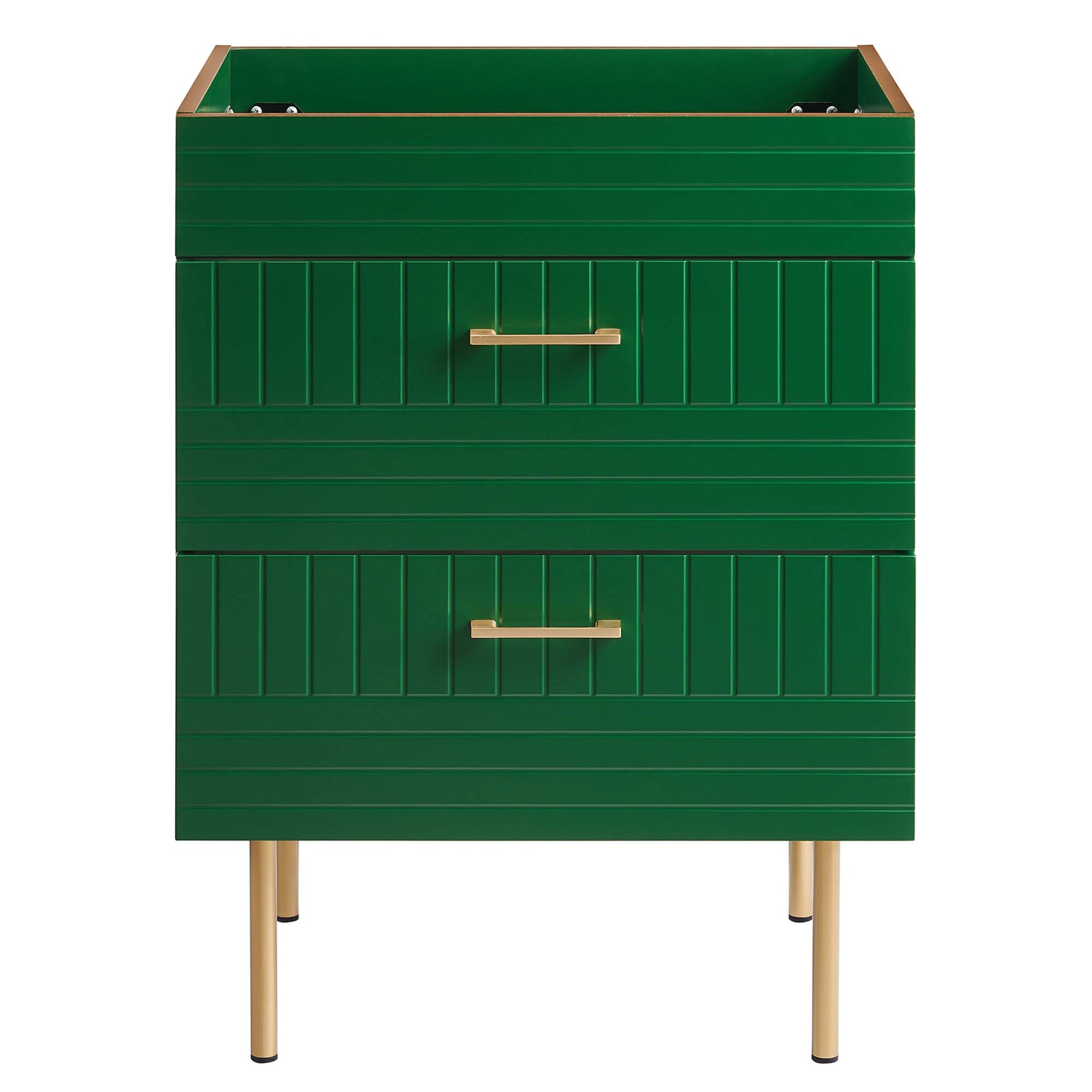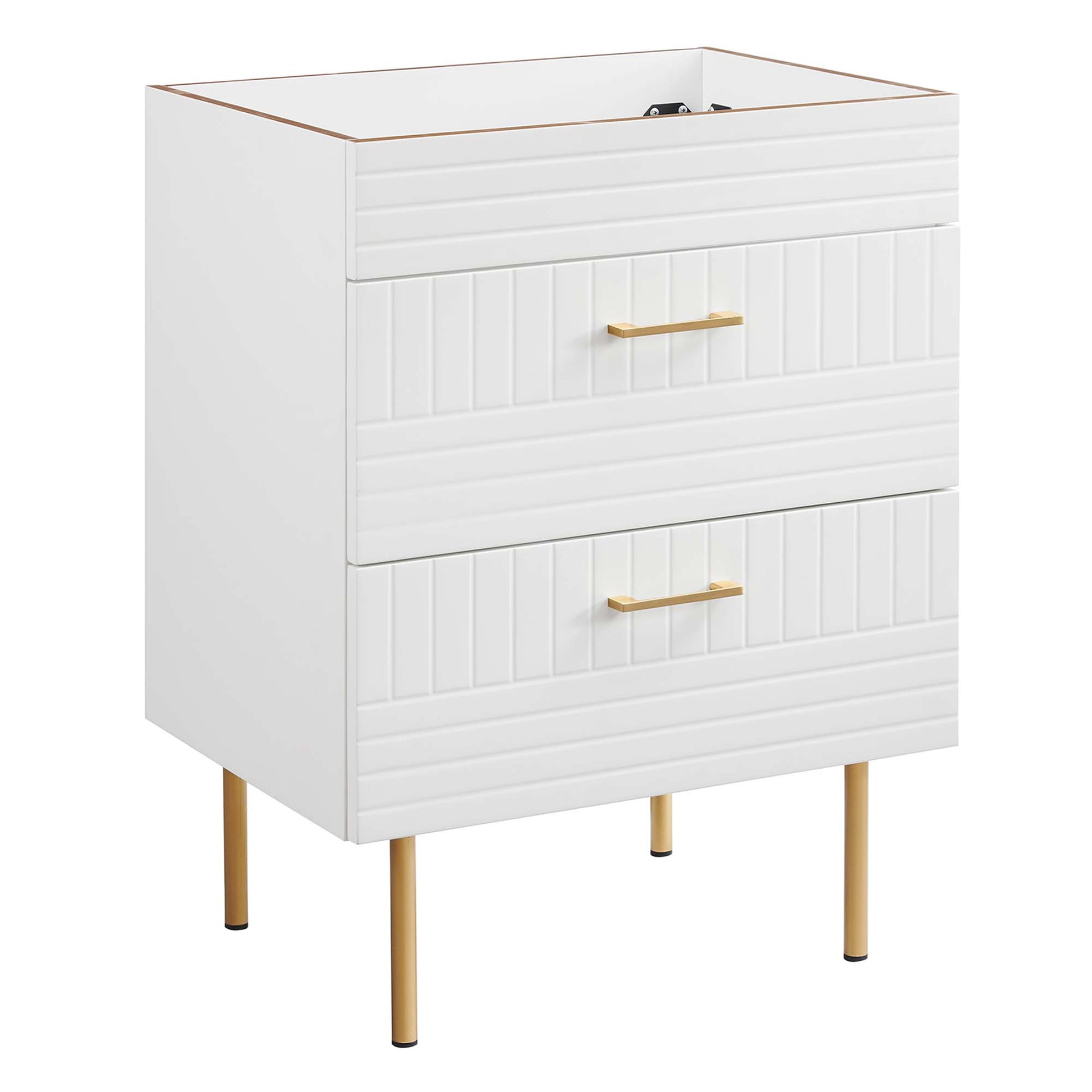 Refresh your bathroom space with the contemporary style of the Daybreak 24" Bathroom Vanity. Featuring a modern silhouette, sophisticated matte finish, and brushed gold metal hardware, this vanity is durably crafted with a blend of rubberwood, MDF, and particleboard to create a lasting vanity for your bathroom. Raised off the ground by gold metal legs, this bathroom vanity is complete with ample storage in its drawers to accommodate bathroom essentials and a cut-out design in the top drawer for plumbing. Includes non-marking foot caps. Assembly required. Sink basin and fixtures not included.