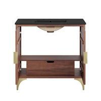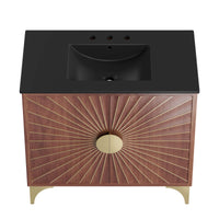 Bring refreshing energy into your bathroom space with the Daylight 36" Bathroom Vanity. Beautifully crafted with solid mango wood and a rich wood stain, this bathroom cabinet features a sun ray design made possible through intricate powder-coated brass details and hardware. This vanity cabinet is a complete addition to a bathroom with a ceramic sink basin and an integrated countertop with 8" centerset holes. Resting on a brass base with arched details and non-marking foot caps, this bathroom vanity offers ample storage space for bathroom essentials with the spacious open shelf and pull-out drawer. Fixtures not included. Assembly required.