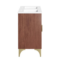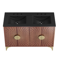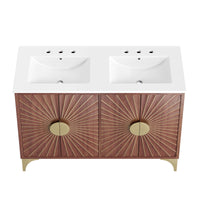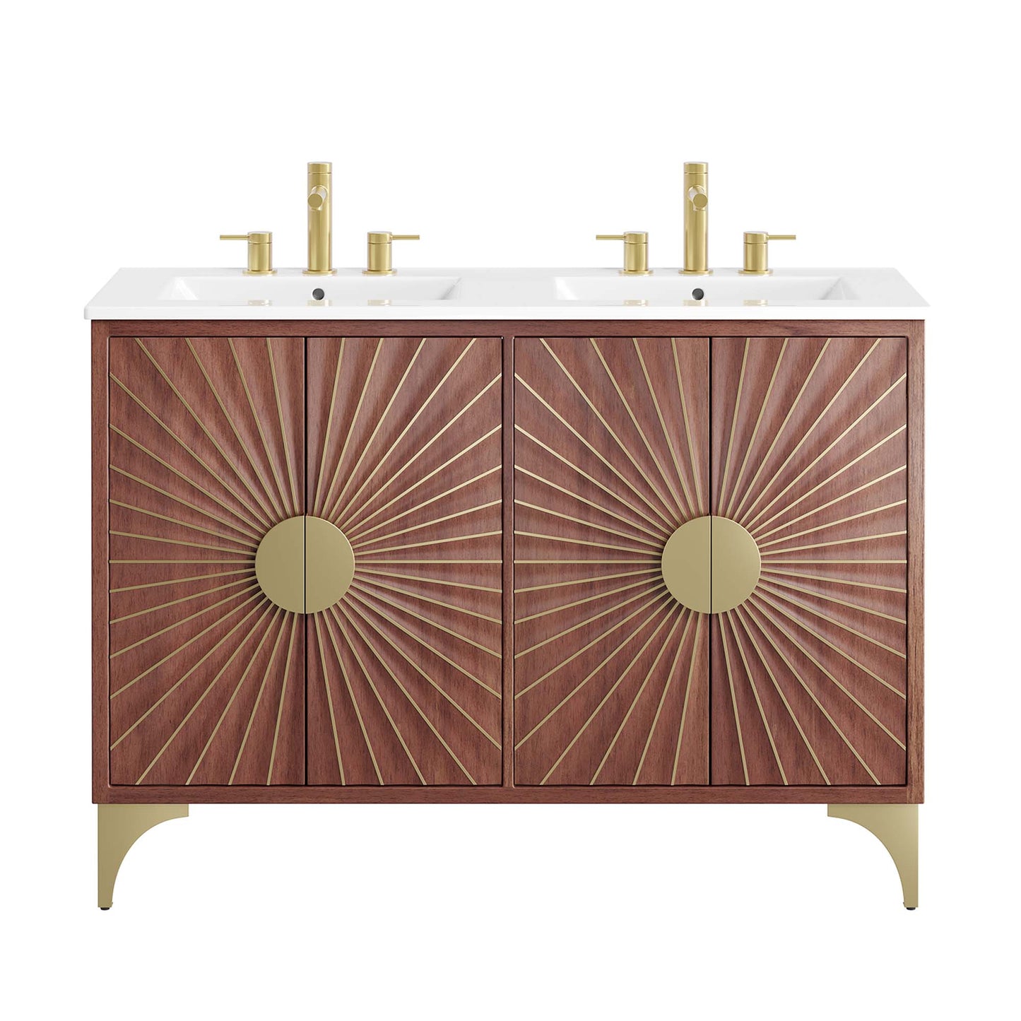 Bring refreshing energy into your bathroom space with the Daylight 48" Double Sink Bathroom Vanity. Beautifully crafted with solid mango wood and a rich wood stain, this bathroom cabinet features a sun ray design made possible through intricate powder-coated brass details and hardware. This vanity cabinet is a complete addition to a bathroom with a ceramic double sink basin and an integrated countertop with 8" centerset holes. Resting on a brass base with arched details and non-marking foot caps, this bathroom vanity offers ample storage space for bathroom essentials with the spacious open shelf and pull-out drawer. This dual sink has 8” between basins and 24” between basin drain holes. Fixtures not included. Assembly required.