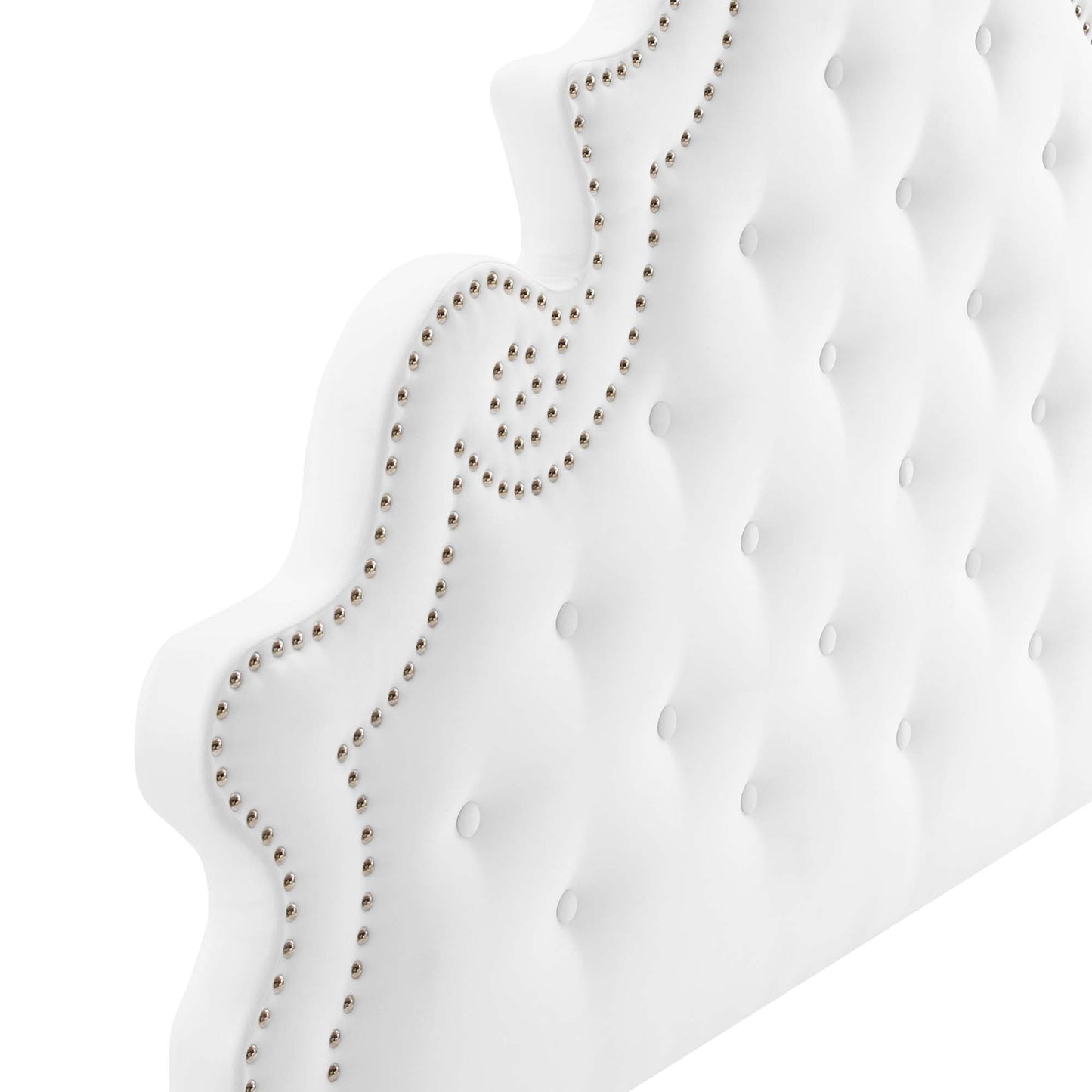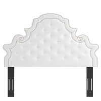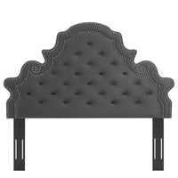 Elaborate details exude regal luxury and vintage glamour on the Diana Tufted Performance Velvet Full/Queen Headboard. Featuring classic button tufting and nailhead trim framing the avant garde silhouette, this full/queen headboard is a stunning addition to a master bedroom or guest bedroom. Upholstered in soft, stain-resistant performance velvet, this padded headboard offers supportive comfort while sitting up in bed reading, relaxing, or watching TV. With various mounting positions, this height-adjustable headboard fits full or queen bed frames. Assembly required.