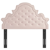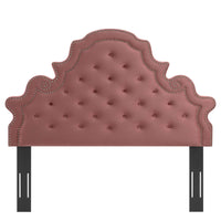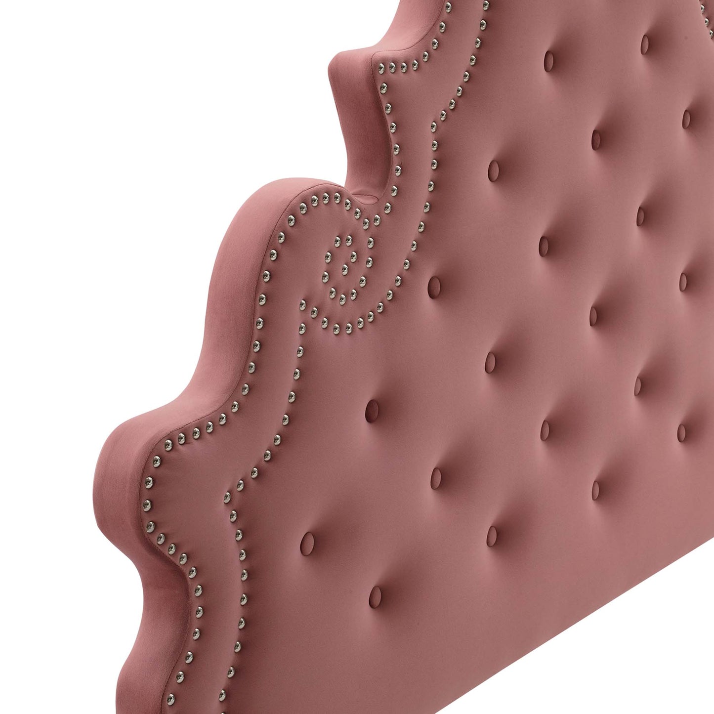 Elaborate details exude regal luxury and vintage glamour on the Diana Tufted Performance Velvet King/California King Headboard. Featuring classic button tufting and nailhead trim framing the avant garde silhouette, this king/Cali king headboard is a stunning addition to a master bedroom or guest bedroom. Upholstered in soft, stain-resistant performance velvet, this padded headboard offers supportive comfort while sitting up in bed reading, relaxing, or watching TV. With various mounting positions, this height-adjustable headboard fits European king or California king bed frames. Assembly required.