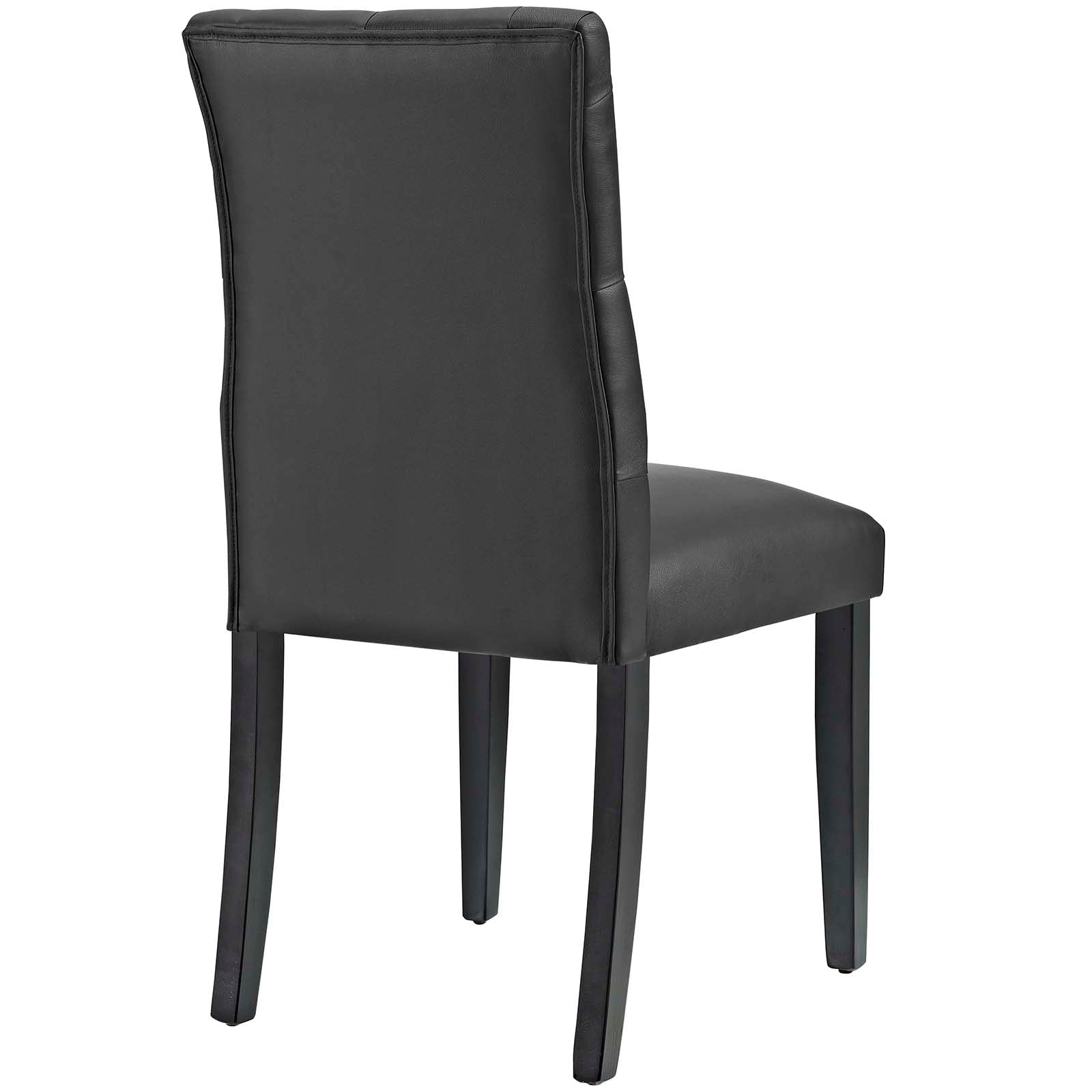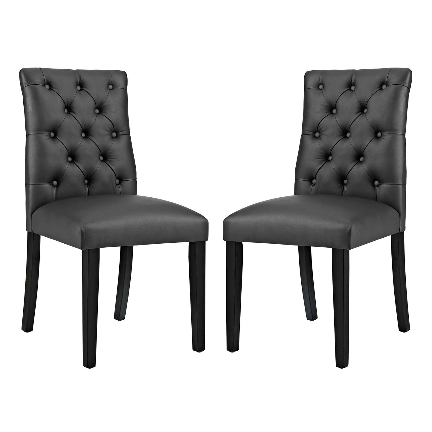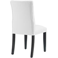 Bestow elegance with the Duchess Dining Chair. Chic and luxurious, Duchess features a stylish curvy form, richly tufted button back, dense foam padding, fine vinyl upholstery, and wood legs topped with non-marking foot caps. Resonate grace and charm with a dining chair perfect for the modern home.