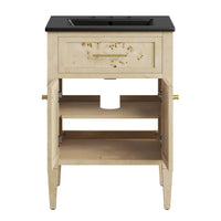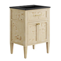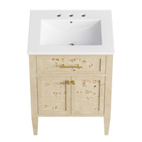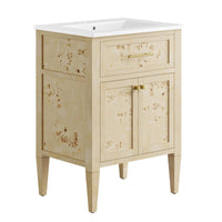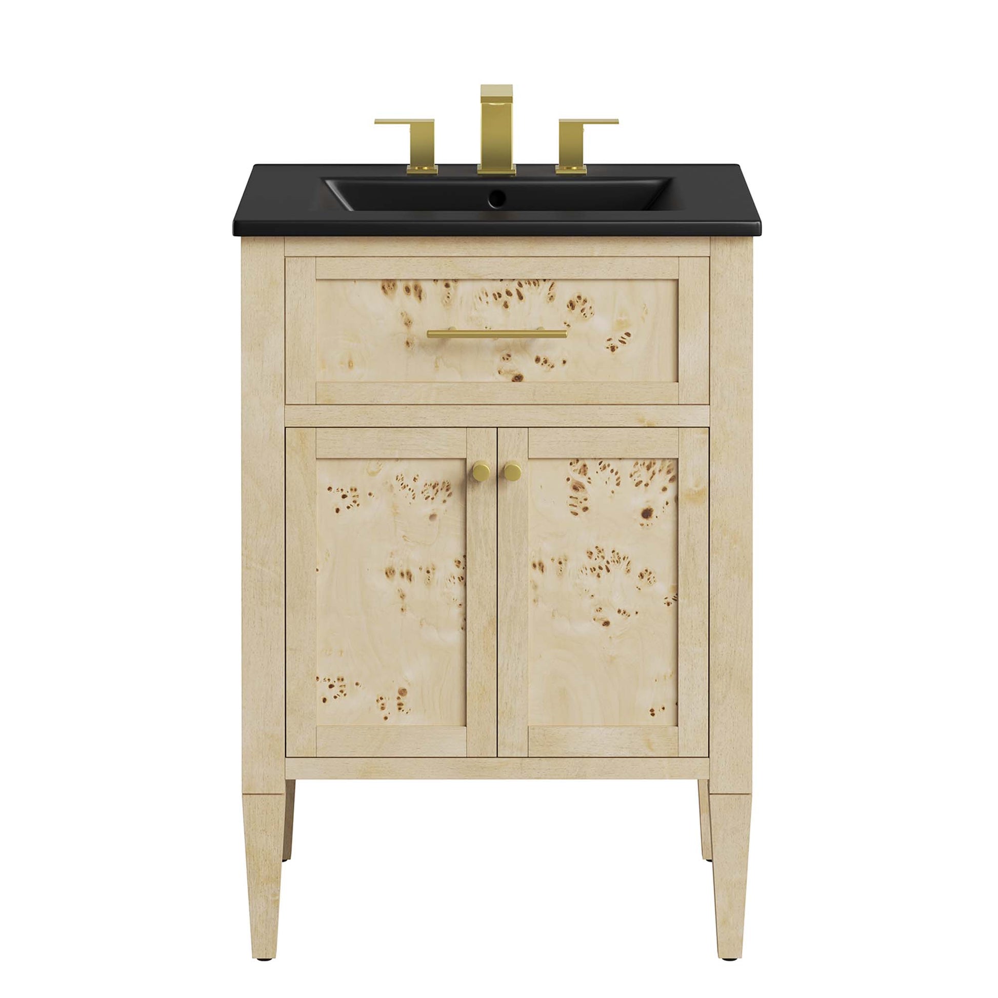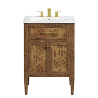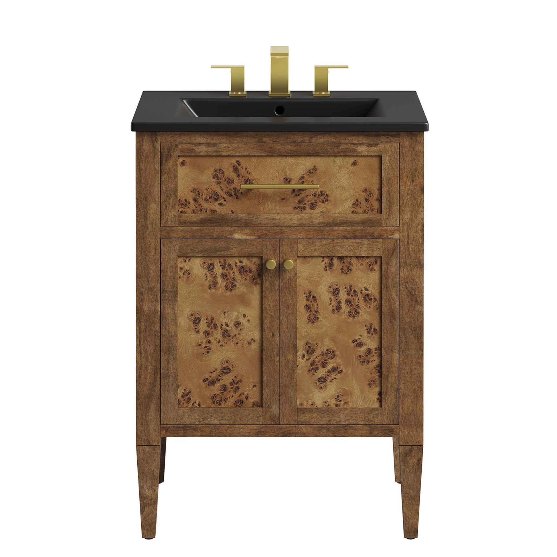 Discover the epitome of organic aesthetics and practicality with the Elysian 24" Burl Wood Bathroom Vanity. Each vanity cabinet is uniquely crafted from exquisite mango wood, further adorned with a rich burl wood veneer, radiating a distinctive charm and character. This bathroom vanity's centerpiece is an elegant ceramic sink basin, thoughtfully designed with an integrated countertop and 8" centerset holes ready for your choice of fixtures (not included). A fixed top drawer and tapered wood legs add to the sleek design, while the spacious shelving beneath–complete with a convenient plumbing cutout–offers ample storage space for all your bathroom essentials. While assembly is required, this vanity includes easy-to-follow assembly instructions.