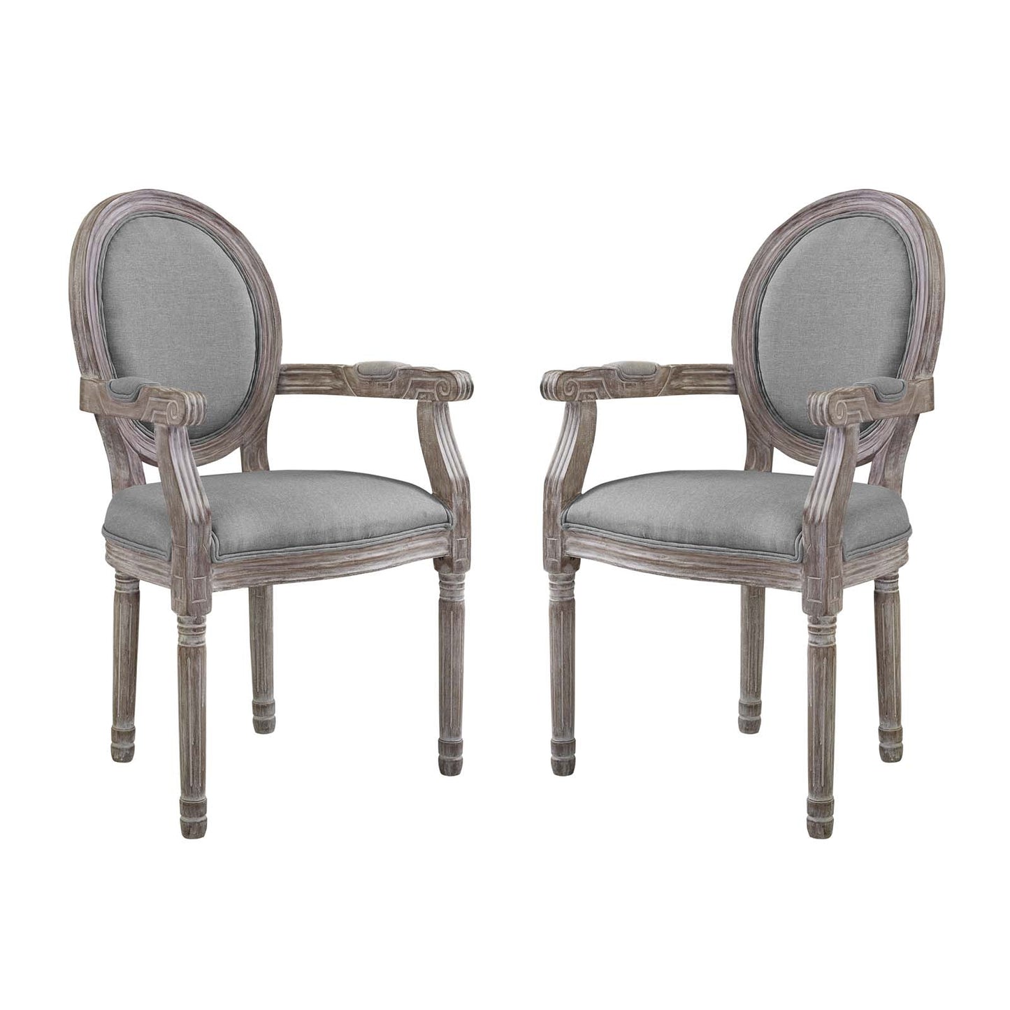Revel in the whispered opulence of the Emanate Dining Armchair. Featuring a fluted wood frame, dense foam upholstered fabric seat and scooped armrests, this oval back dining or accent chair elegantly blends old world charm with modern intrigue. Designed with a weathered vintage French look and an undeniable appeal, Emanate supports up to 331 pounds and comes with foot pads to preserve flooring. Comes fully assembled.