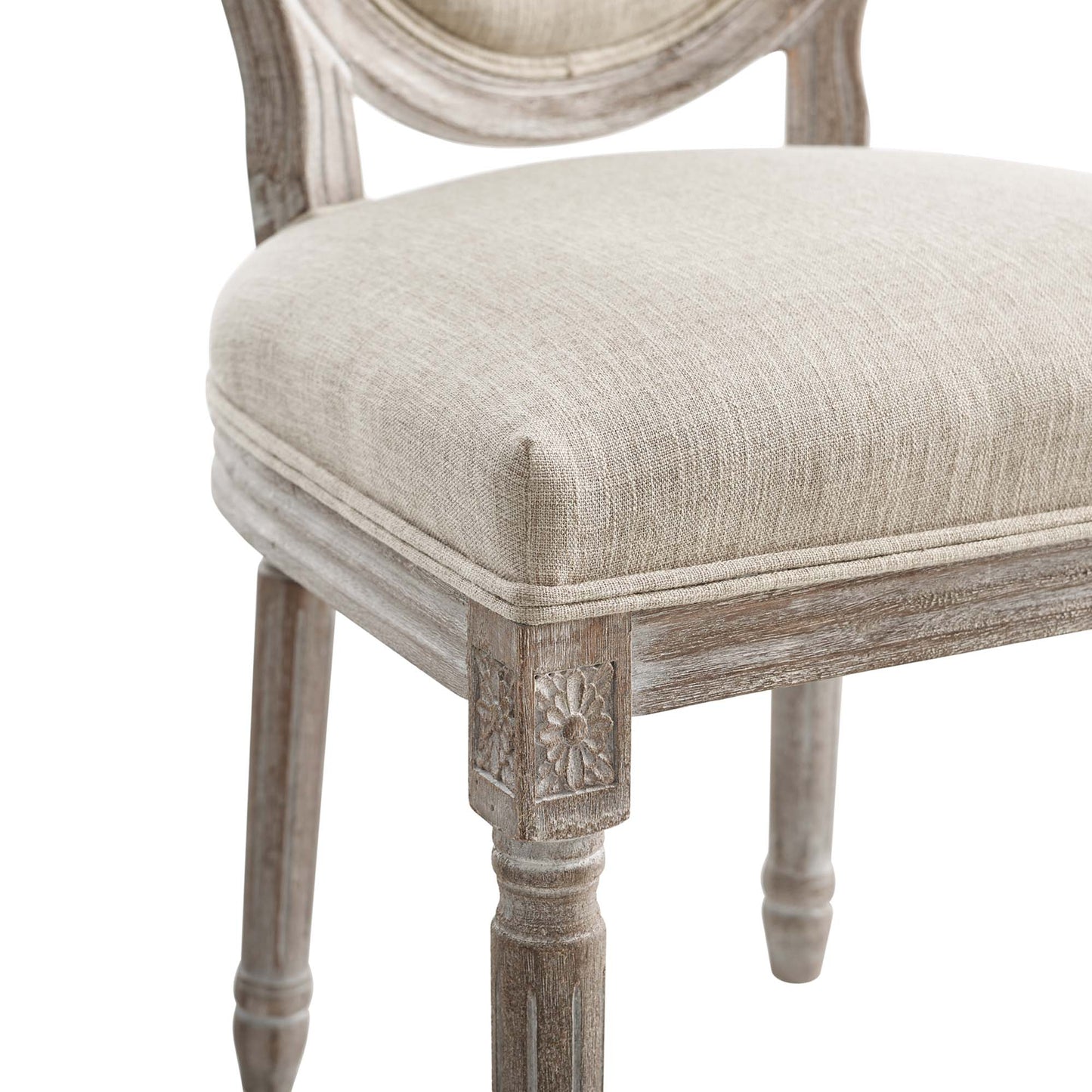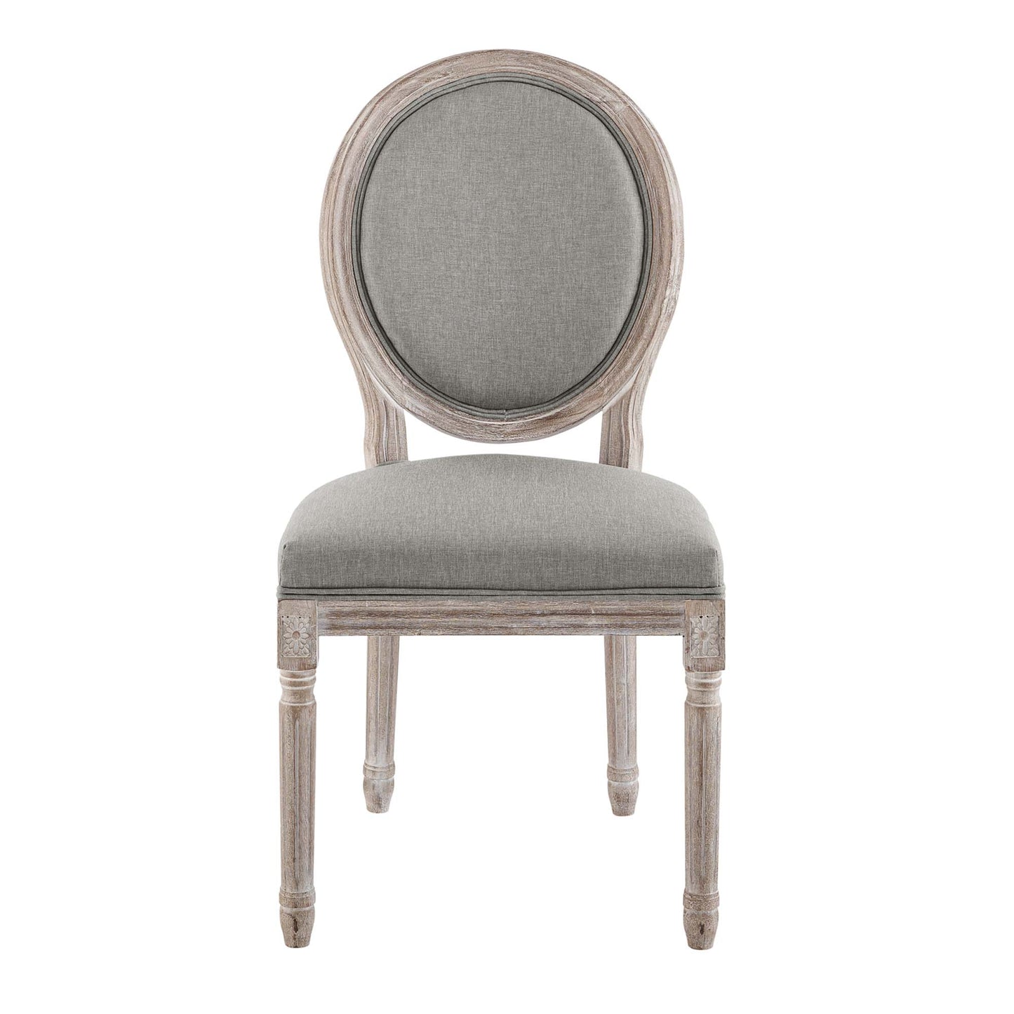Revel in the whispered opulence of the Emanate Dining Side Chair. Featuring a fluted wood frame, dense foam upholstered fabric seat with elegant welting, this oval back dining or accent chair elegantly blends old world charm with modern intrigue. Designed with a weathered vintage French look and an undeniable appeal, Emanate supports up to 331 pounds and comes with foot pads to preserve flooring. Comes fully assembled.