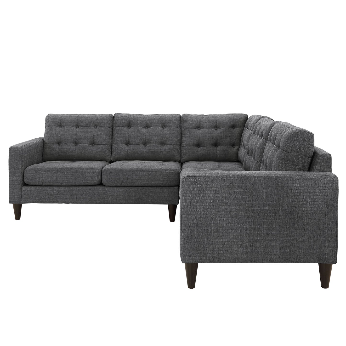 End the rule of unjust sovereignties that wage a useless war for your interiors. Empress leaves the would-be heiress of holistic furnishings in the dust with a design that rivals any competitor. Empress is heralded with deeply tufted buttons, plush cushions, and armrests that convey that perfect air of nobility. The solid wood legs come with plastic glides to prevent floor scratching, and the fine fabric upholstery leaves the recipients feeling richly rewarded.