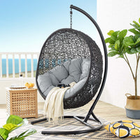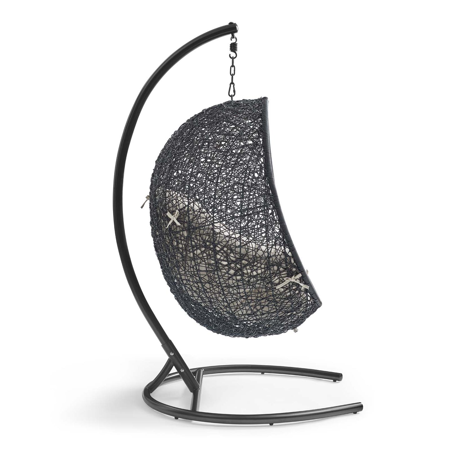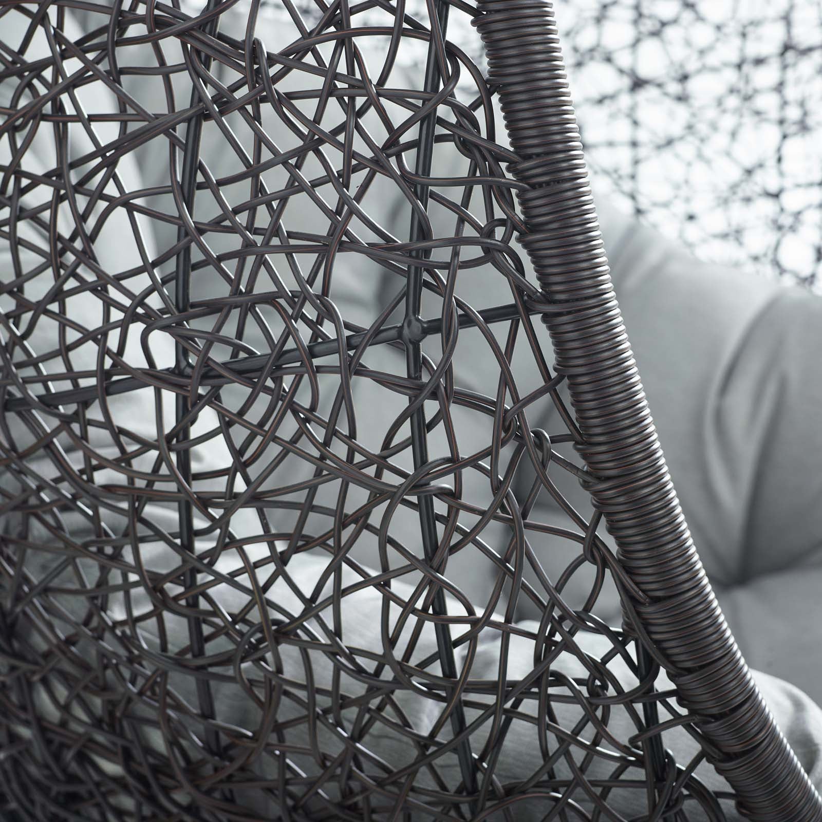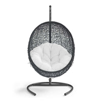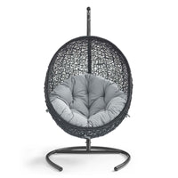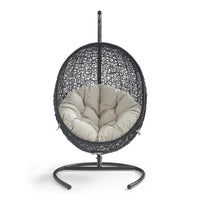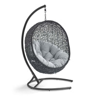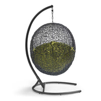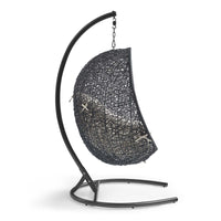 Embark on moments of metamorphosis and rebirth with an exotic hanging outdoor swing chair. Transform the mundane to heightened states of consciousness with Encase Outdoor Swing Chair. This hanging swing chair is comprised of a sturdy espresso metal stand and rattan seat. Surround yourself with plush fabric cushions to complete entry into a relaxed state in the Encase Hanging Chair.