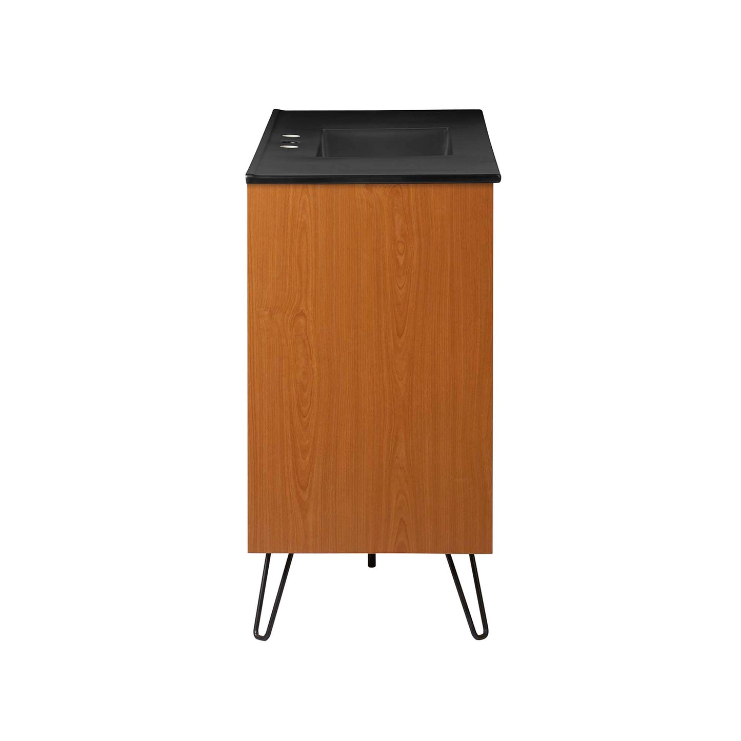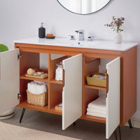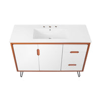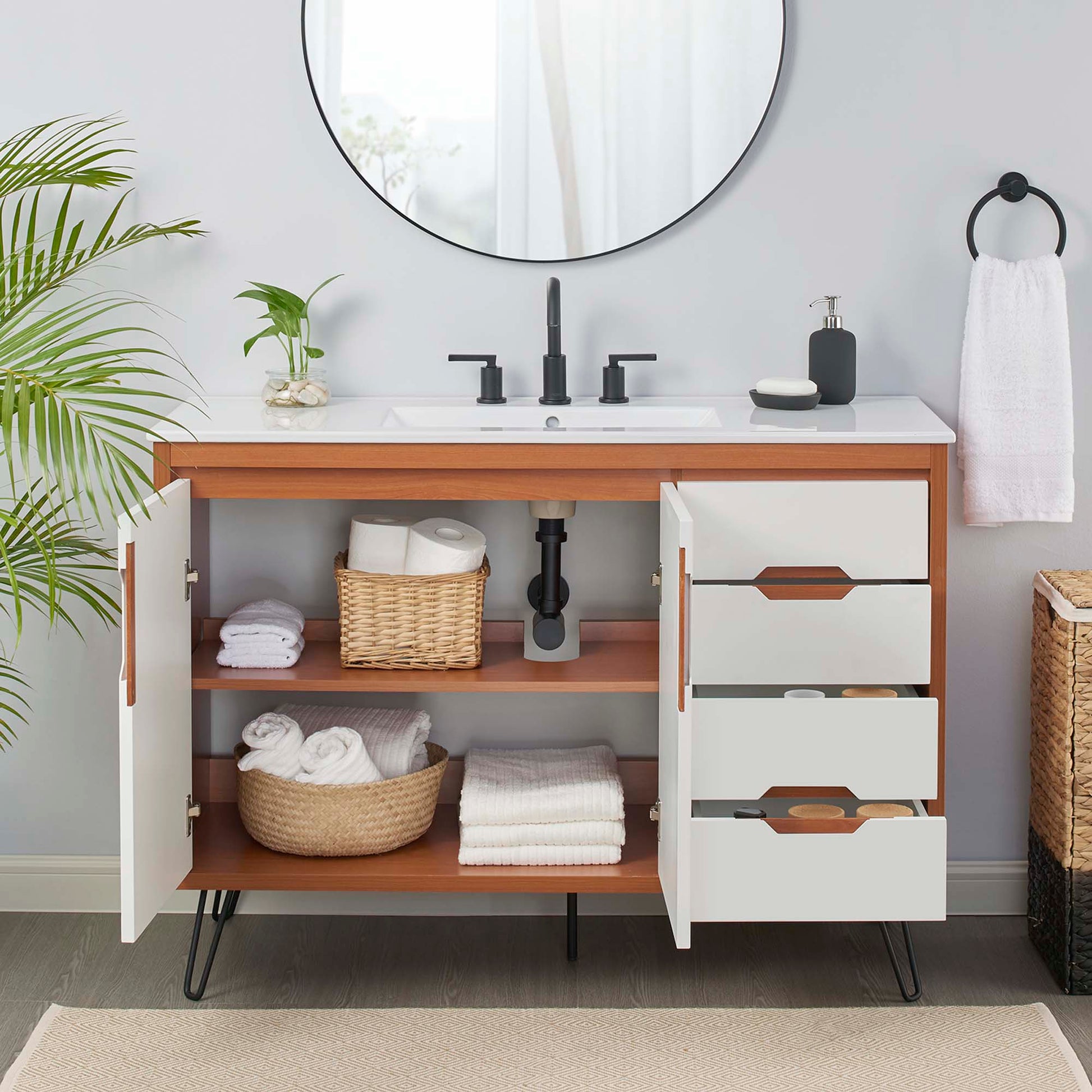 Instill mid-century modern energy in your bathroom decor with the Energize 48" Bathroom Vanity. Resting on four metal hairpin legs, this bathroom vanity cabinet features a durable particleboard and MDF construction and a ceramic sink basin with 8-inch centerset holes and an integrated countertop. Behind soft-close doors with cutaway designs for easy open and close functionality is a spacious shelved storage area to keep all your bathroom essentials organized and concealed. The sleek look aligns with Scandinavian modern style for a dynamic vanity designed for a multitude of decor styles from modern to contemporary. Fixtures not included. Assembly required.