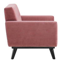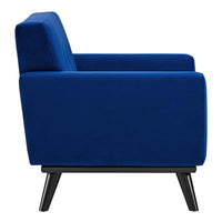 Gently sloping curves and plush seat cushion create a favorite lounging spot. Whether relaxing after a long day at work, settling in with coffee and brunch, or entering a spirited discussion with friends, the Engage Armchair is a welcome presence in your home. Three tufted buttons create eye-catching appeal, adding depth that brings your sitting décor to center stage. Four black wood legs and frame supply a solid base to the comfortable, stain-resistant performance velvet upholstery.