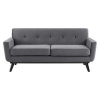 Gently sloping curves and plush seat cushion create a favorite lounging spot. Whether relaxing after a long day at work, settling in with coffee and brunch, or entering a spirited discussion with friends, the Engage Loveseat is a welcome presence in your home. Three tufted buttons create eye-catching appeal, adding depth that brings your sitting décor to center stage. Four black wood legs and frame supply a solid base to the comfortable, stain-resistant performance velvet upholstery.