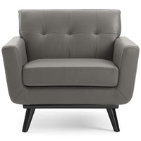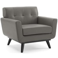 Gently sloping curves and plush removable seat cushions create a favorite living room accent chair. Whether lounging in solitude or entering a spirited discussion with friends, the Engage mid-century modern top-grain leather upholstered living room lounge accent armchair is a welcome presence in your home. Three buttons create eye-catching appeal, adding depth to a sleek retro modern accent chair that brings your sitting décor to center stage. Four splayed wood legs and frame supply a solid base to the comfortable quality leather chair for your living room, lounge room, office or other seating area. Chair Weight Capacity: 441 lbs.