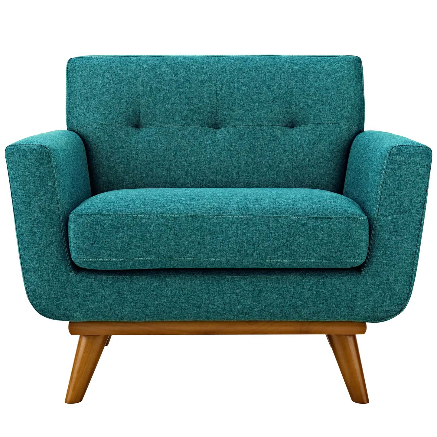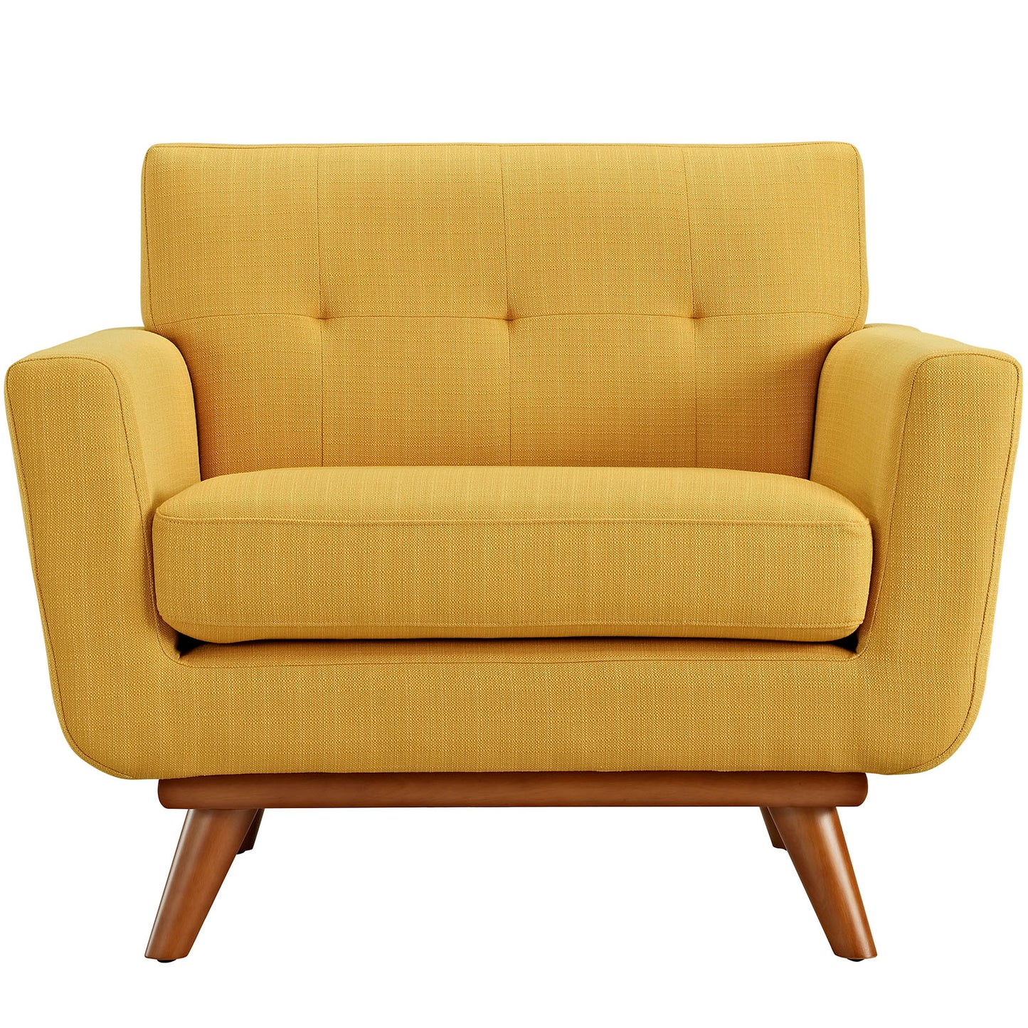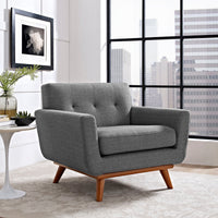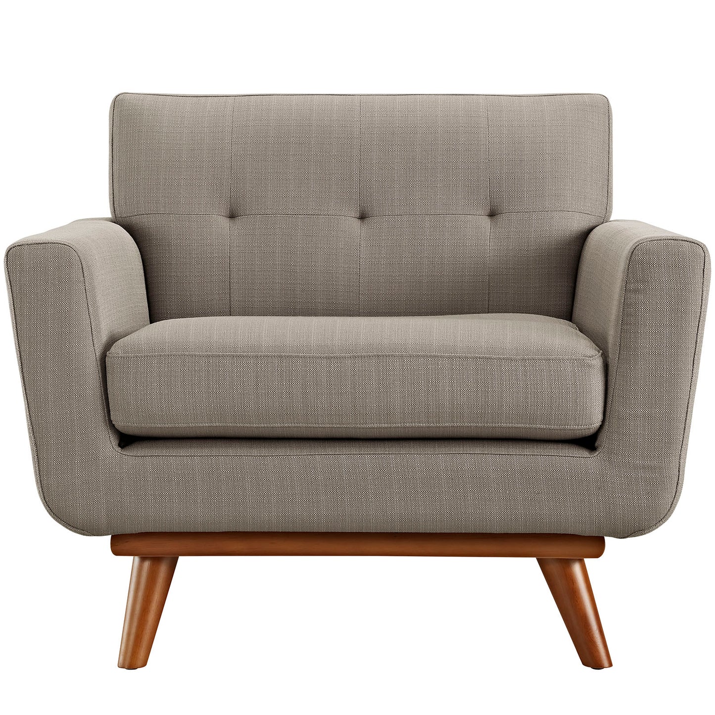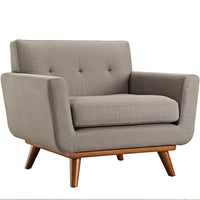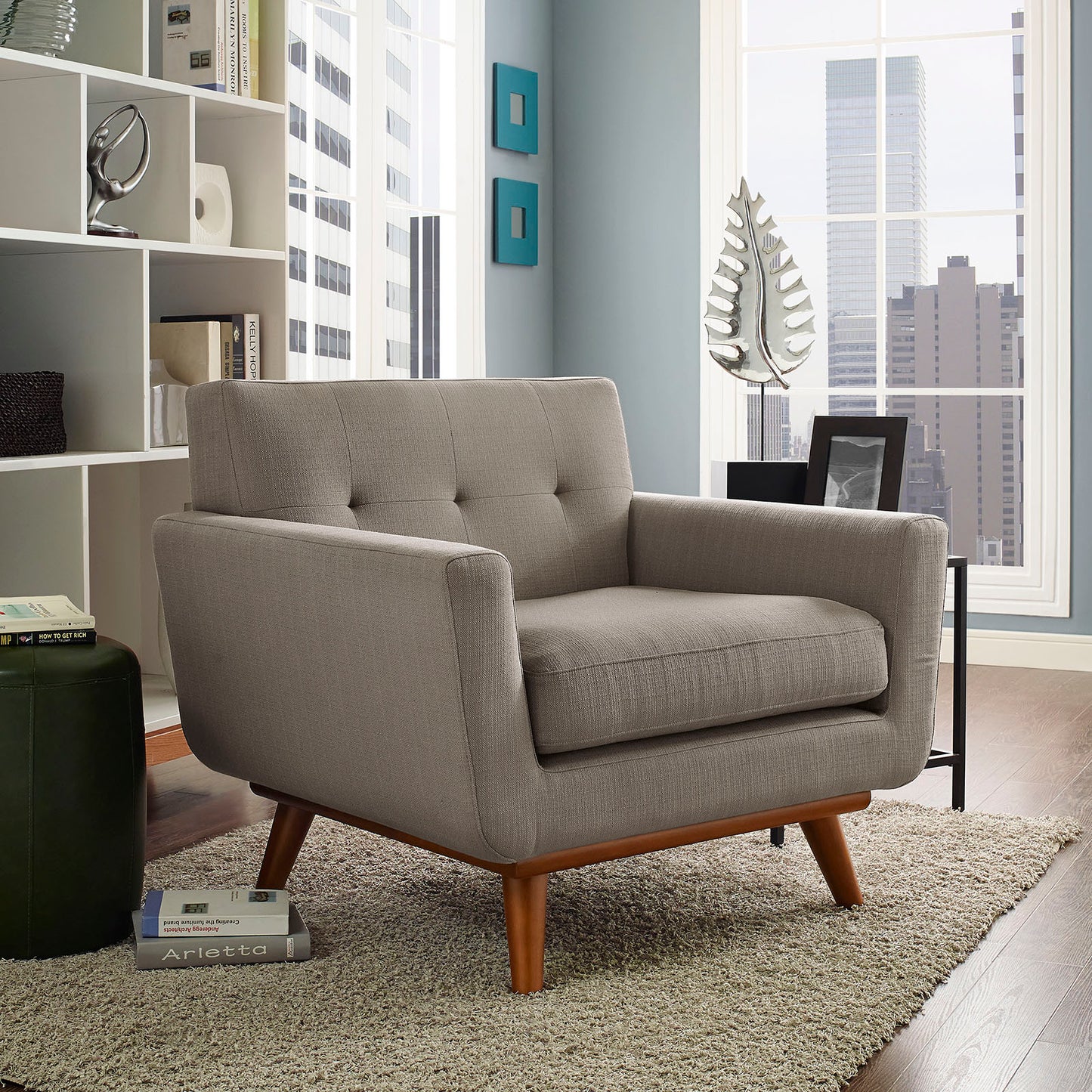Gently sloping curves and plush seat cushion create a favorite lounging spot. Whether relaxing after a long day at work, settling in with coffee and brunch, or entering a spirited discussion with friends, the Engage Armchair is a welcome presence in your home. Three tufted buttons create eye-catching appeal, adding depth that brings your sitting décor to center stage. Four cherry color rubberwood legs and frame supply a solid base to the comfortable upholstered material.