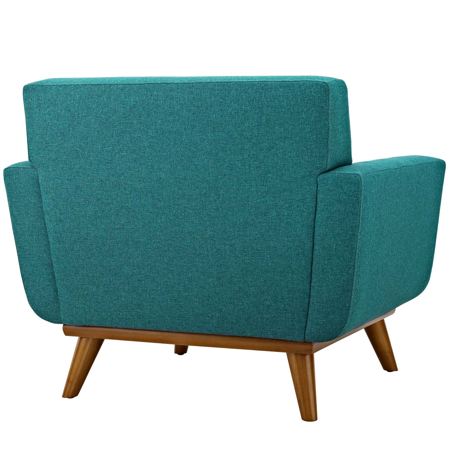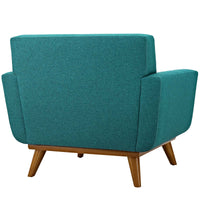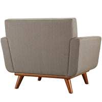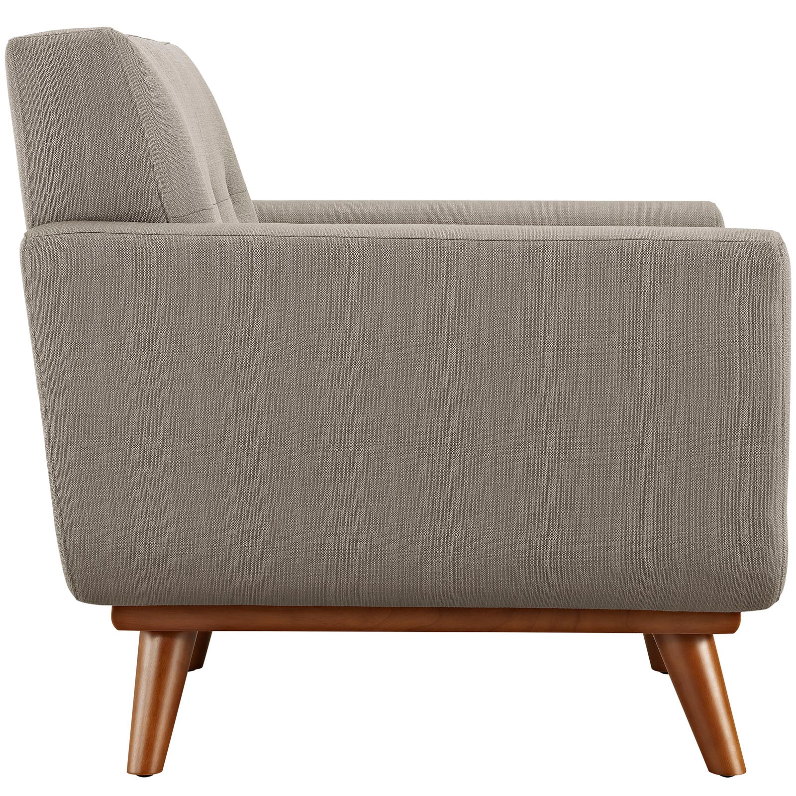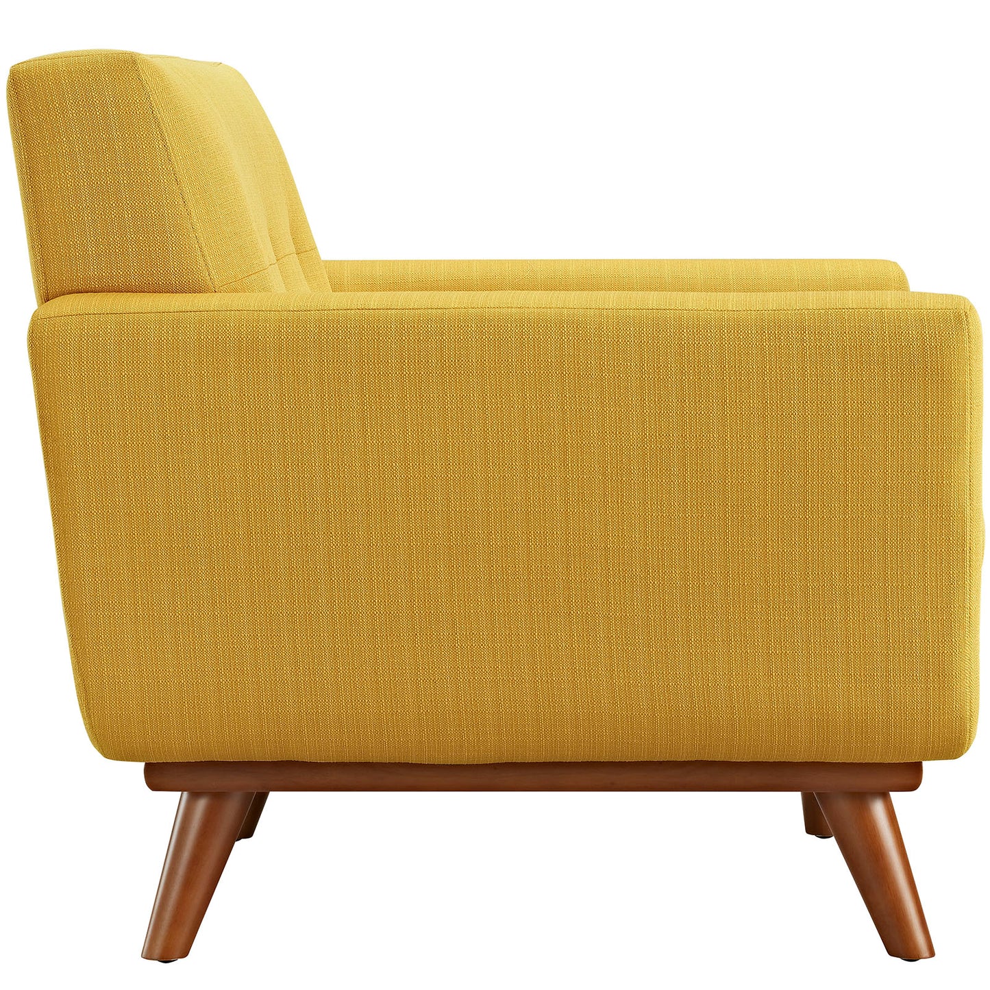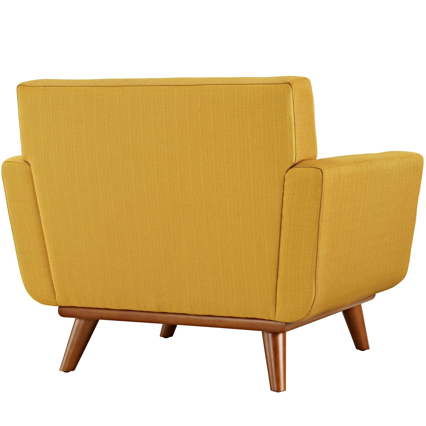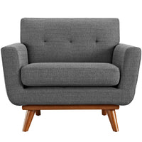 Gently sloping curves and plush seat cushion create a favorite lounging spot. Whether relaxing after a long day at work, settling in with coffee and brunch, or entering a spirited discussion with friends, the Engage Armchair is a welcome presence in your home. Three tufted buttons create eye-catching appeal, adding depth that brings your sitting décor to center stage. Four cherry color rubberwood legs and frame supply a solid base to the comfortable upholstered material.