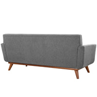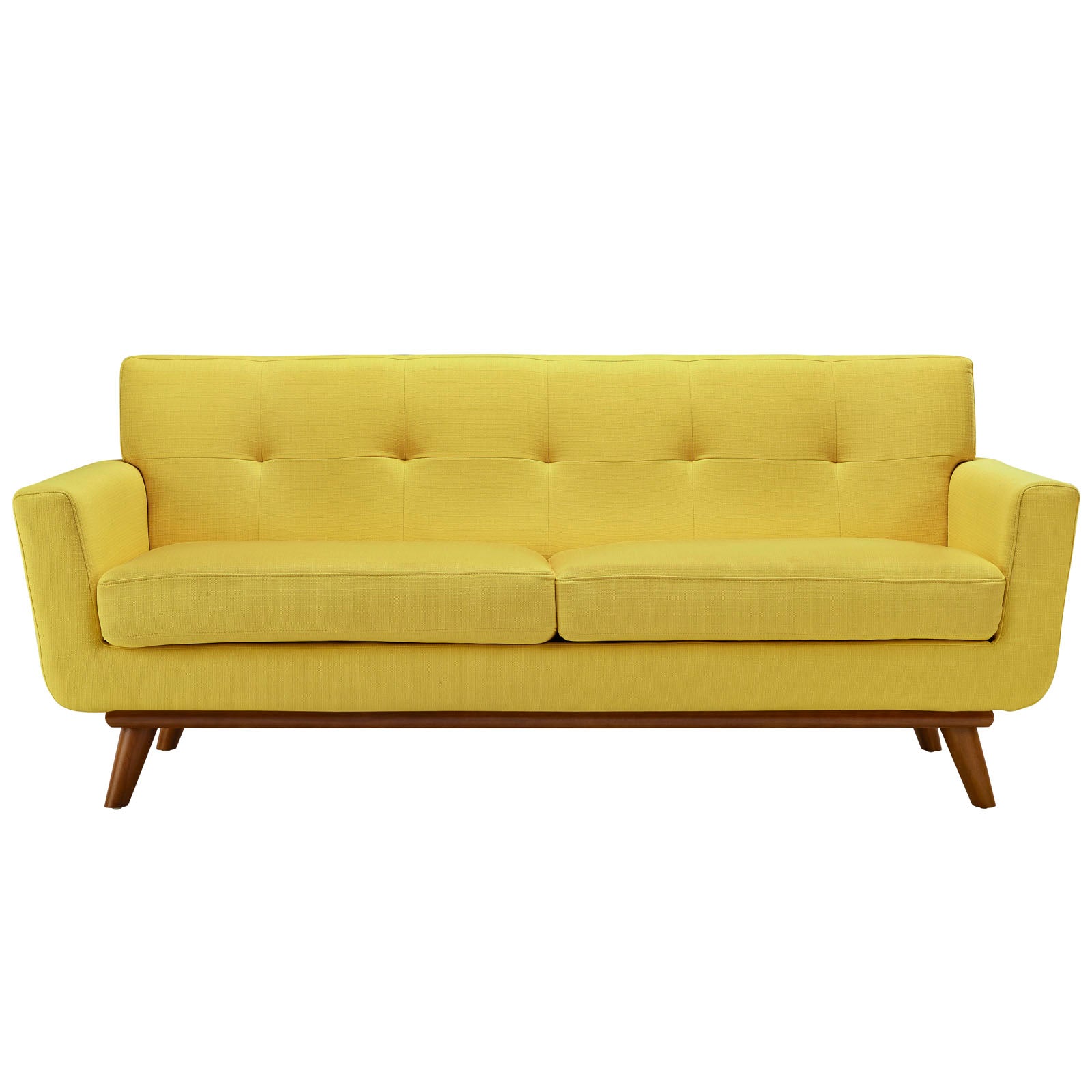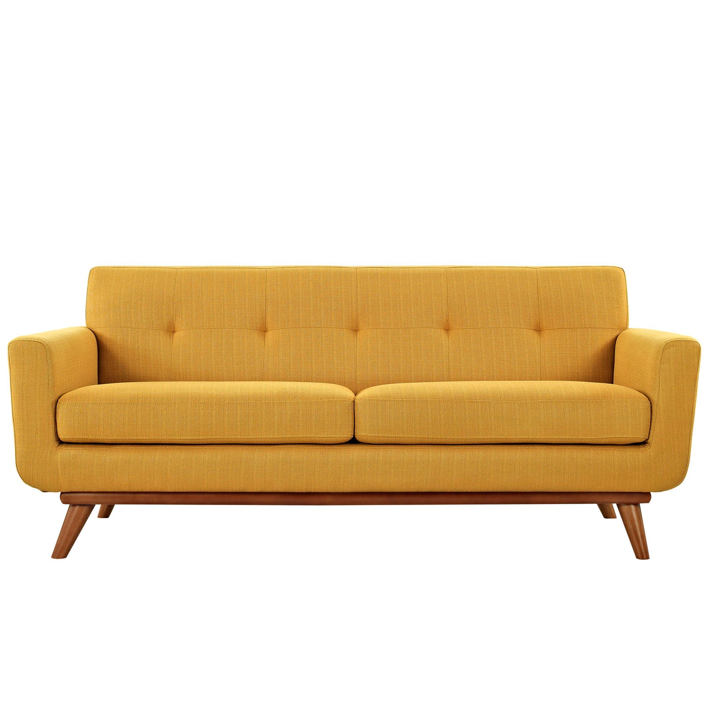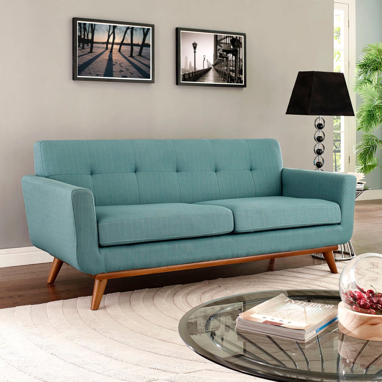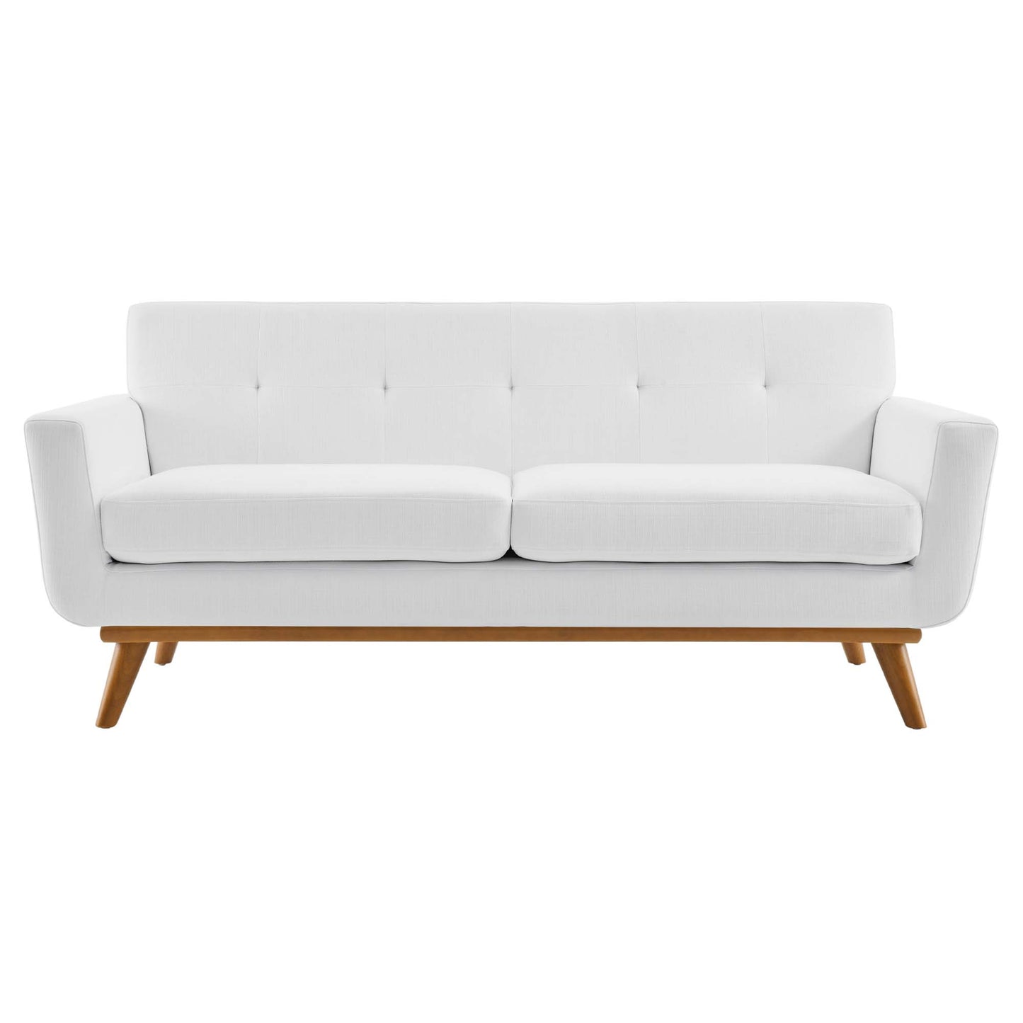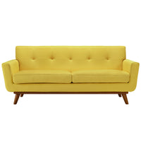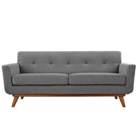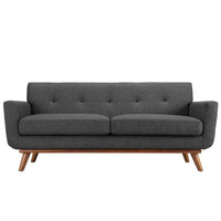 Gently sloping curves and large dual cushions create a favorite lounging spot. Whether relaxing after a long day at work, settling in with coffee and brunch, or entering a spirited discussion with friends, the Engage loveseat is a welcome presence in your home. Five tufted buttons create eye-catching appeal, adding depth that brings your sitting décor to center stage. Four cherry color rubberwood legs and frame supply a solid base to the comfortable upholstered material.