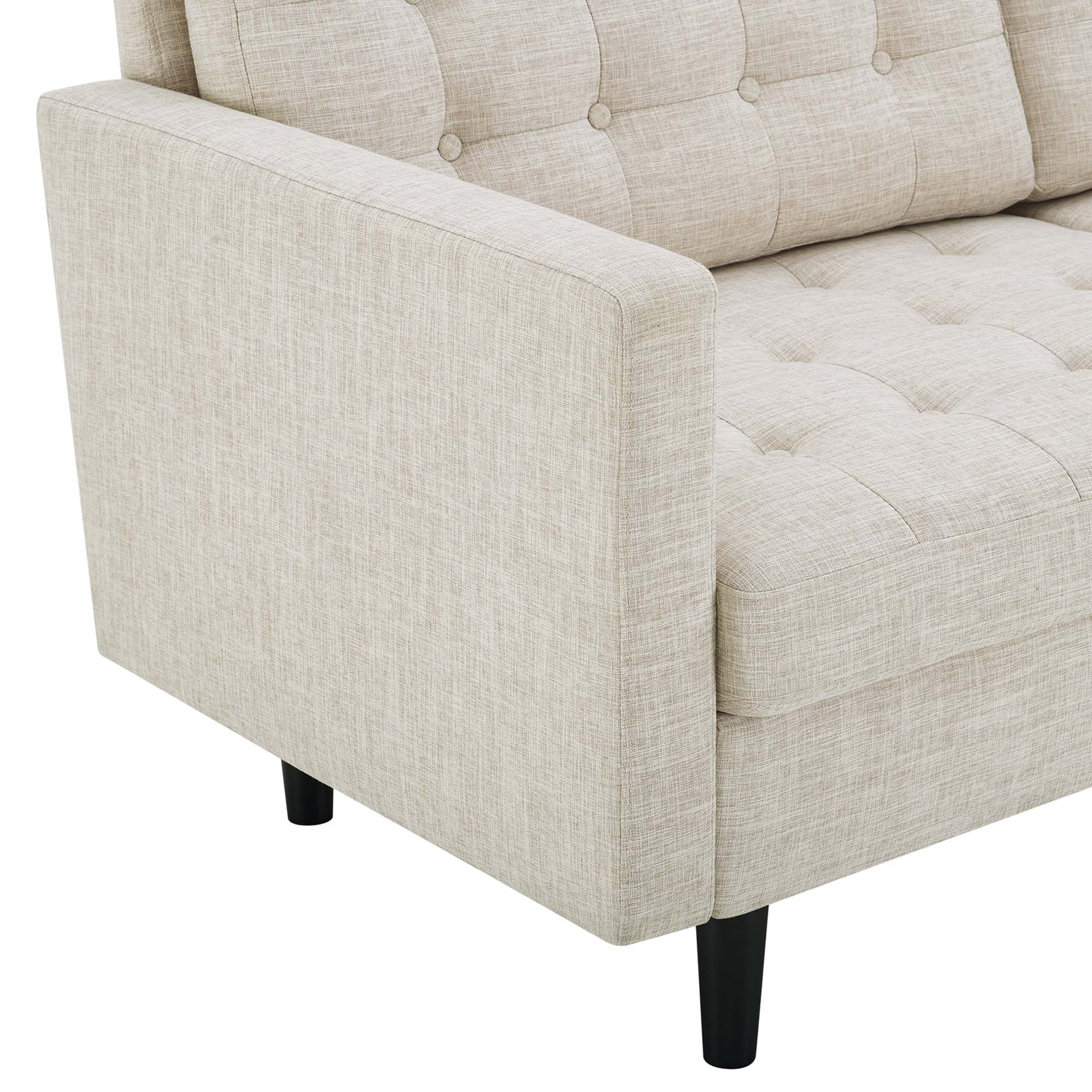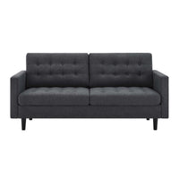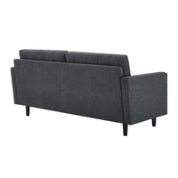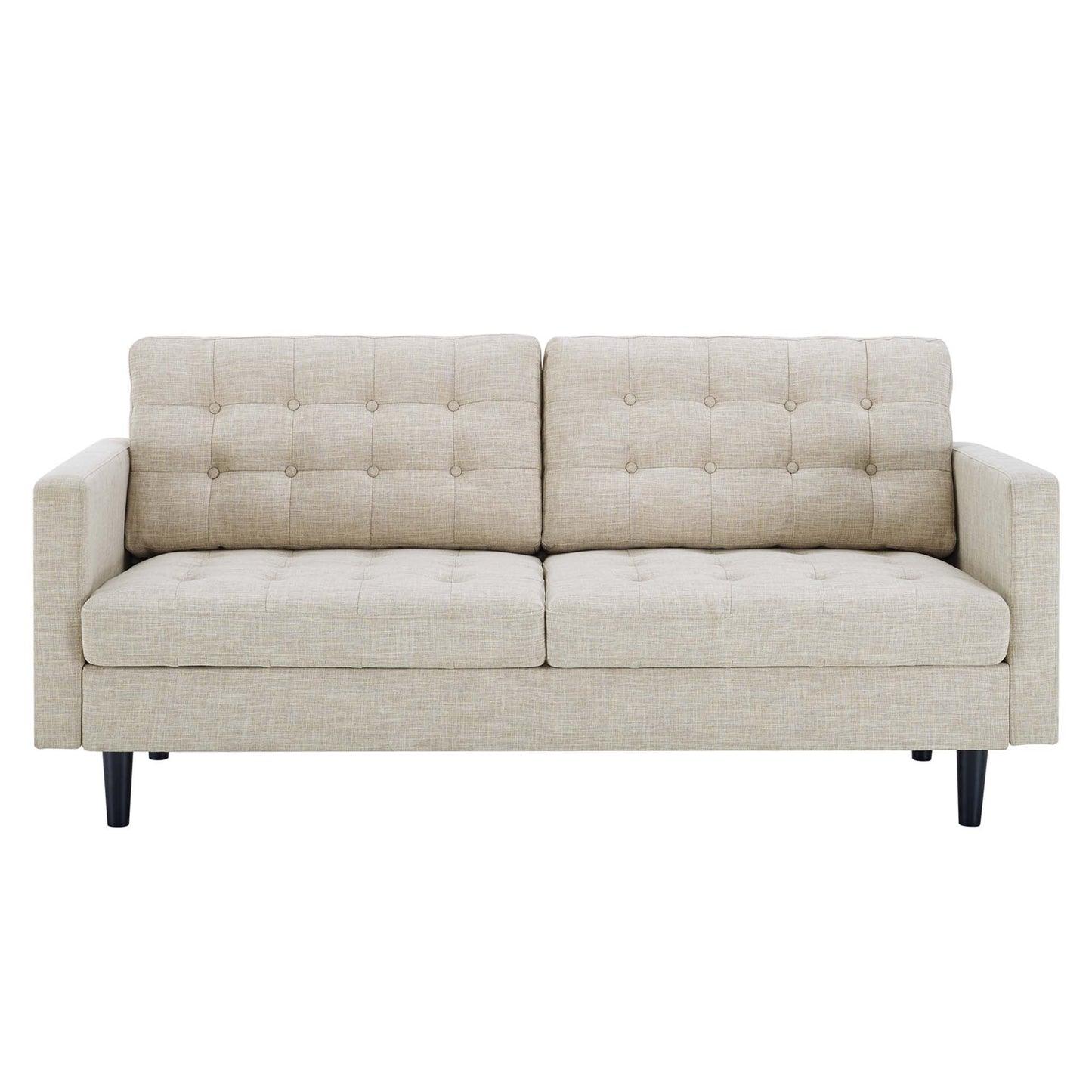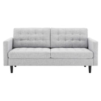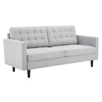 Reinspire decor in a home, office, or apartment with the Exalt Tufted Fabric Sofa. Featuring deep button tufting and rounded edges, this upholstered sofa abounds in contemporary style and mid-century modern design. Upholstered in soft polyester fabric, this tufted sofa is complete with dense foam padding and a sinuous spring support system for a premium seating experience. This fabric sofa is crafted with durable solid wood and rests on four black wood legs with foot pins to protect flooring. Bring retro modern charm to your living room, bedroom, lounge room, den, or home office with Exalt. Assembly required. Sofa Weight Capacity: 900 lbs.