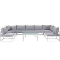 Nestled within close proximity to forests, rivers, valleys, and the Pacific Ocean rests the Fortuna Outdoor Patio Collection. Enjoy the good life with the versatile Fortuna Patio Sectional Sofa Set in an engaging arrangement that makes it easy to enjoy conversations together with friends and family. Made of powder-coated aluminum with all-weather polyester cushions, Fortuna Outdoor Patio Sofa Set appeals to the modern palate without overwhelming the senses. This installment of the Fortuna Outdoor Series is a 9 piece patio sectional sofa furniture set perfect for contemporary patios, backyards, poolside, and other outdoor lounge areas.