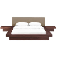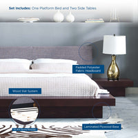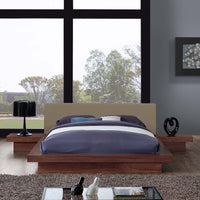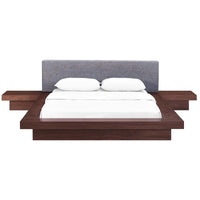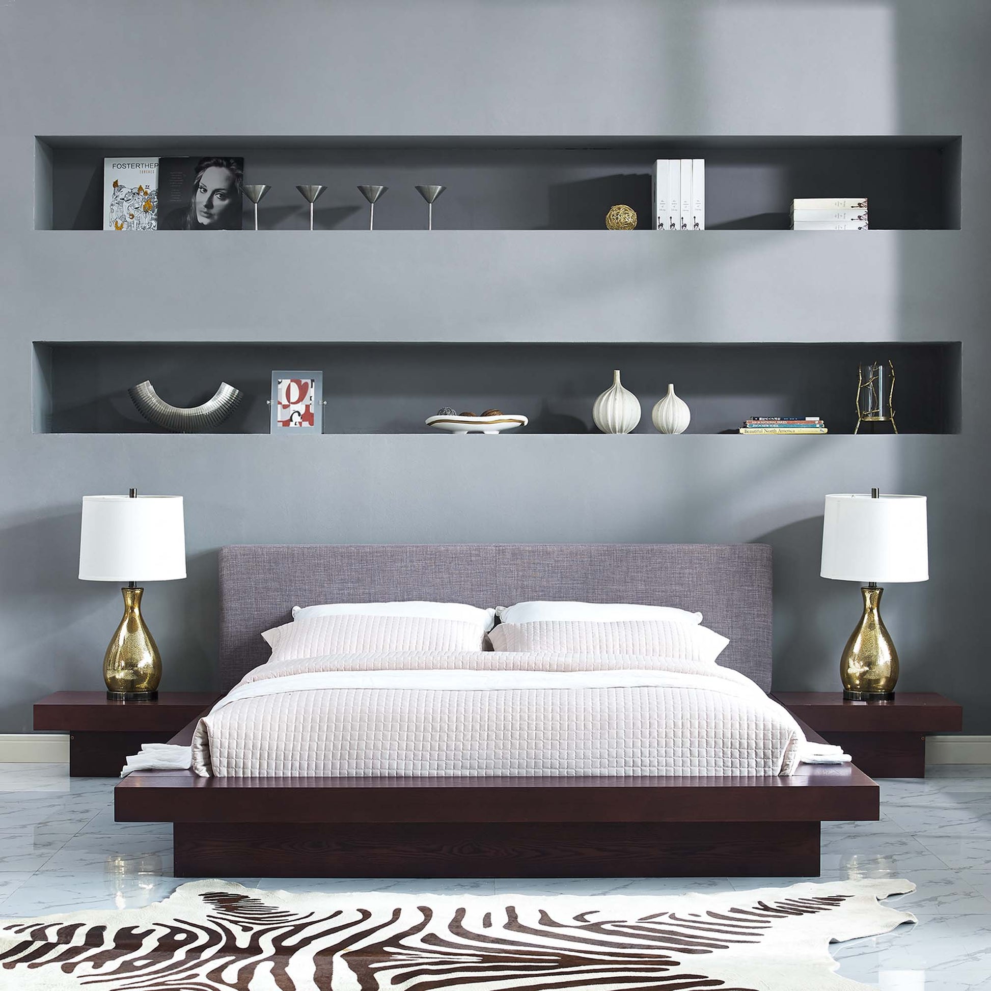 Instantly transform your bedroom landscape with the Freja Bedroom Set. Designed with clean straight lines and a compelling aesthetic, Freja features a sturdy laminated particleboard base with cappuccino veneer, foam-padded headboard upholstered in polyester fabric, slatted support that eliminates the need for a box spring, and a reinforced center beam with supporting legs for maximal stability. Update your bedroom décor with an engaging platform bed which evinces a refined look and striking design. Freja admirably supports mattress types such as memory foam, spring, latex, and hybrid. Mattress Not Included.