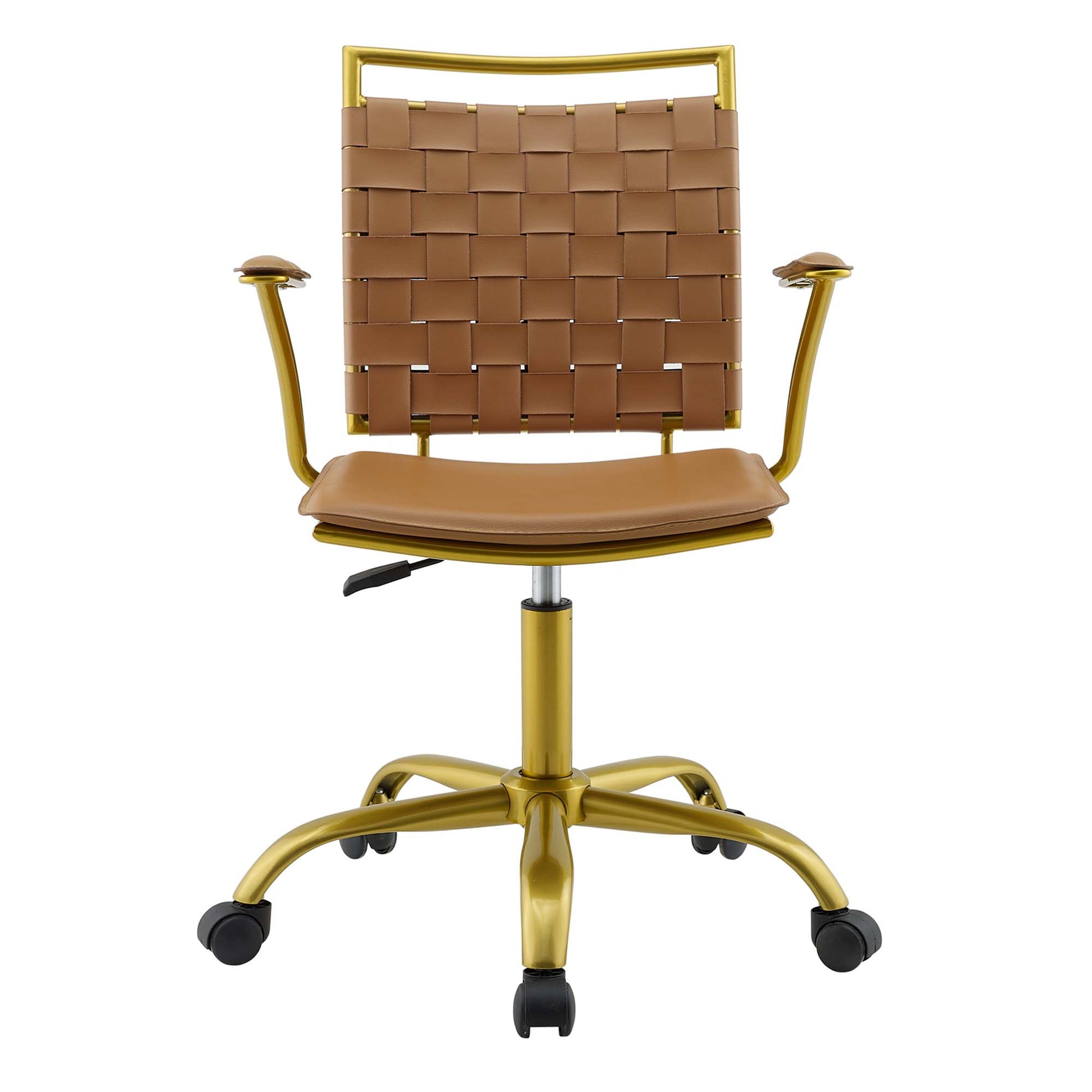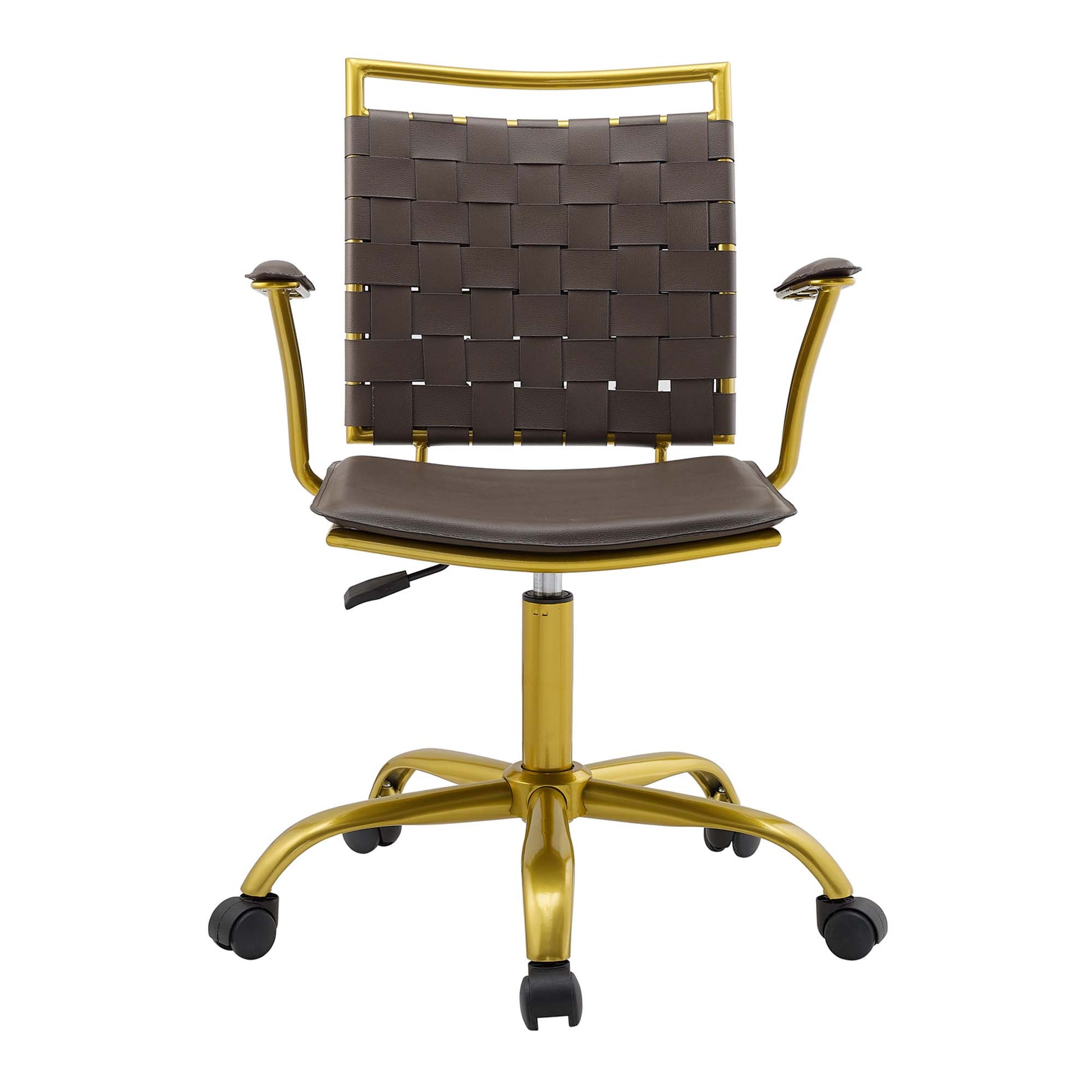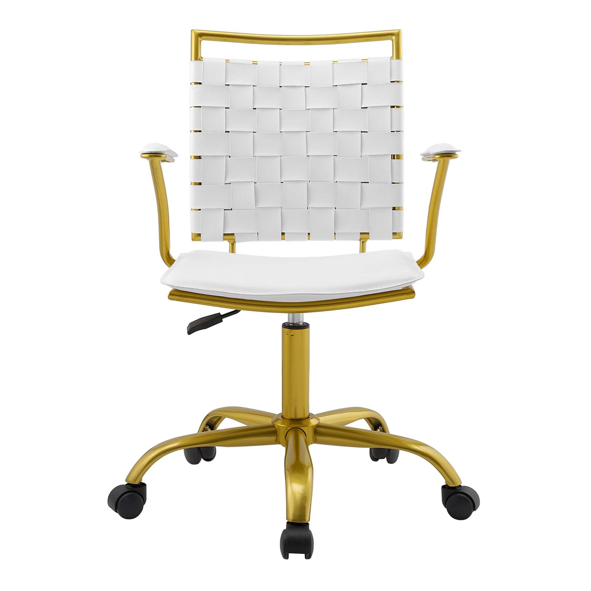 Take charge and speak up with a height adjustable modern office chair with just the right amount of panache. Fuse features a compact back of durable faux leather webbing, foam cushion and gold plated hooded base, to deliver an integrated design that doesn’t work too hard to be something its not. Fuse’s armrests come padded and present an edgy look that never fades, while five dual wheeled casters assist for easy gliding over carpeted surfaces.