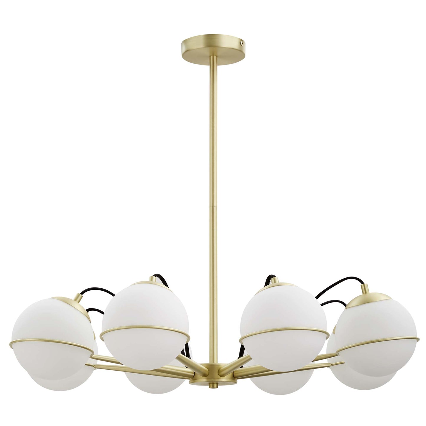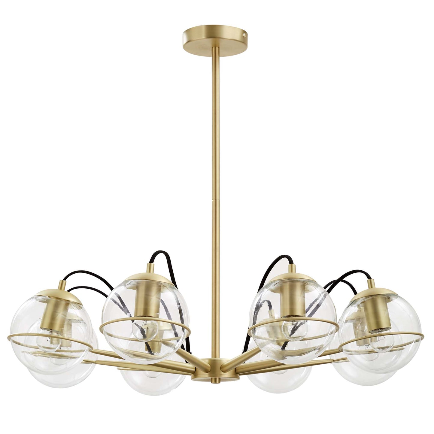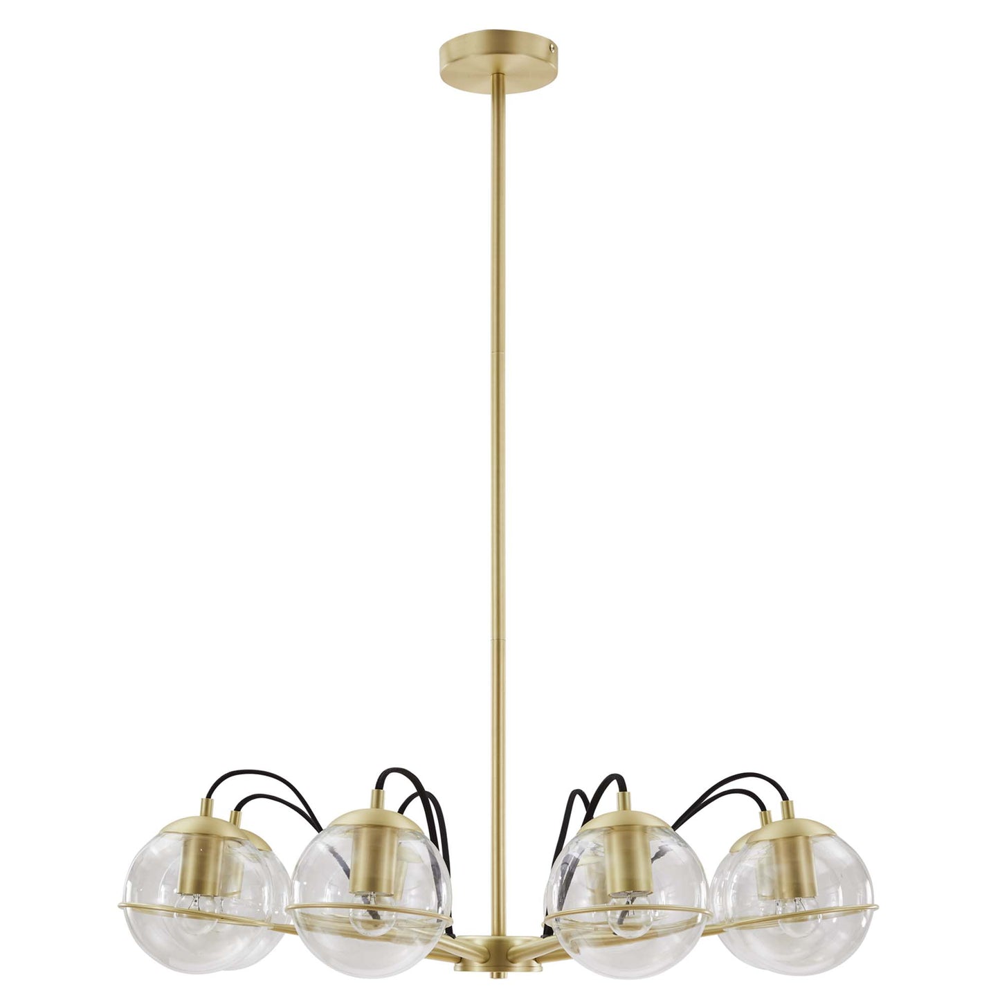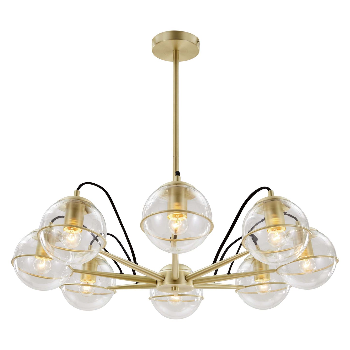The Hanna 8-Light Chandelier brings relaxed grandeur into your living, bedroom, dining room, or kitchen. The organic intrigue of this satin brass chandelier delights as much as it illuminates. Glass globes suspended in satin brass rings extend from a star-shaped constellation of rods and convey movement and light in this enchanting hanging light fixture. This globe chandelier requires professional installation and is compatible with dimmer switches (not included). Hanna Pendant Light requires 8 E26 bulbs, 25W max, G45, or LED equivalent (not included).