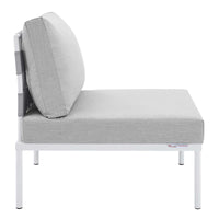 Engage life with Harmony. Enjoy casual conversation under the open sky with an all-weather waterproof furniture set that delivers an exceptional outdoor porch, patio, balcony or garden experience. An exceptional modern furniture set that exceeds expectations, Harmony comes with long-lasting machine washable Sunbrella® cushions, silk polyester seat back weave, square powder coated aluminum bases, tempered glass top tables, and non-marking foot caps. A sectional that arranges according to the spontaneous needs of your guests, set your sights on open and inspired moments with the Harmony Outdoor Patio Collection. Set Includes: 5 Armless Chairs, 2 Corner Chairs, 1 Coffee Table