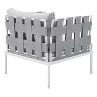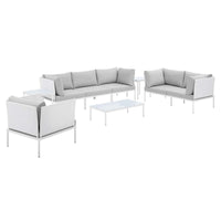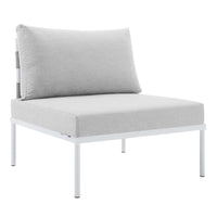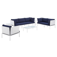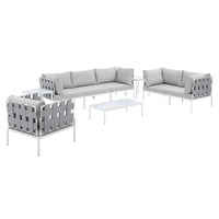Engage life with Harmony. Enjoy casual conversation under the open sky with an all-weather waterproof furniture set that delivers an exceptional outdoor porch, patio, balcony or garden experience. An exceptional modern furniture set that exceeds expectations, Harmony comes with long-lasting machine washable Sunbrella® fabric cushions, soft and durable polyester Textiline® panels, square powder coated aluminum bases, tempered glass top tables, and non-marking foot caps. A sectional that arranges according to the spontaneous needs of your guests, set your sights on open and inspired moments with the Harmony Outdoor Patio Collection. Set Includes: 1 Loveseat, 1 Armchair, 2 Corner Chairs, 1 Armless Chair, 2 Side Tables, 1 Coffee Table