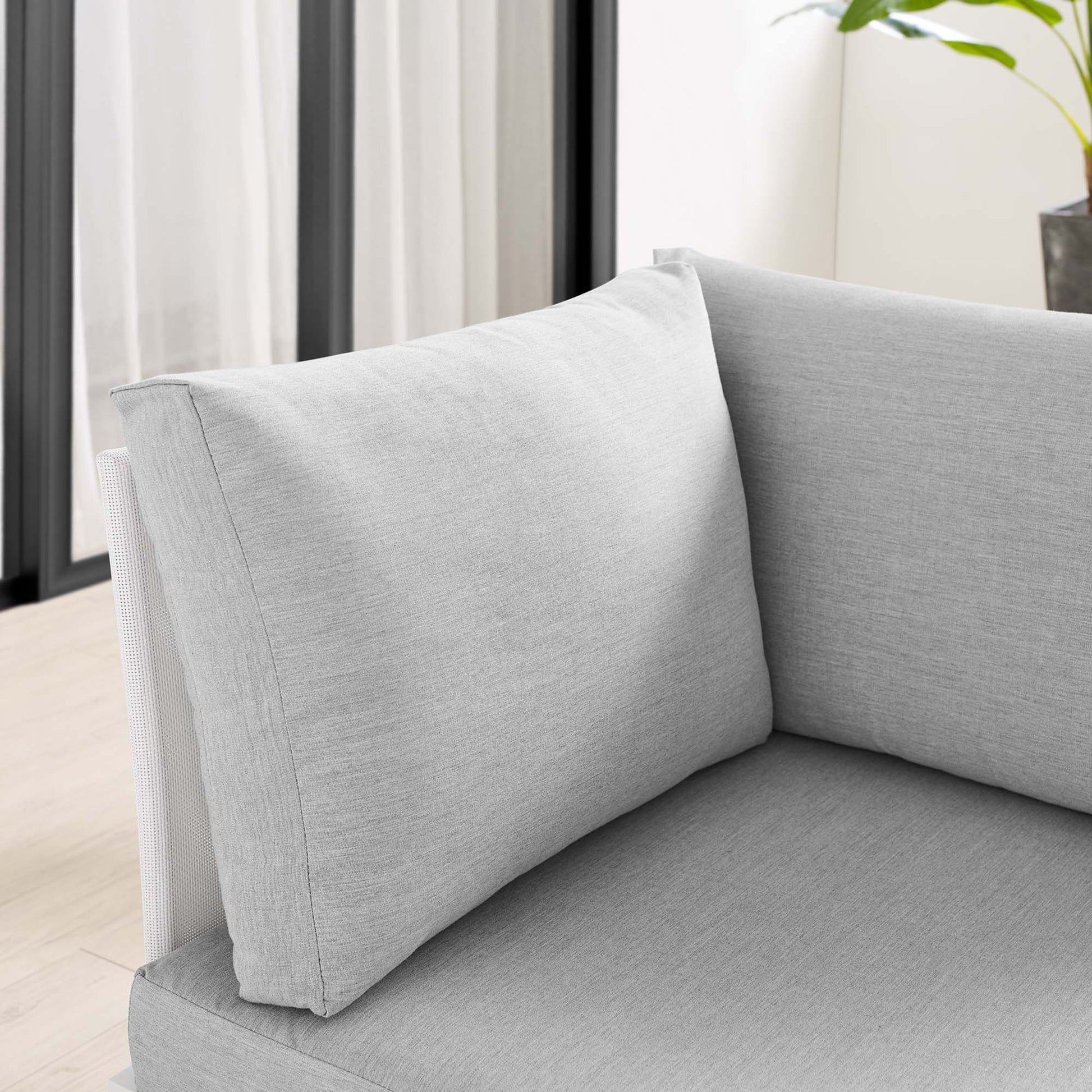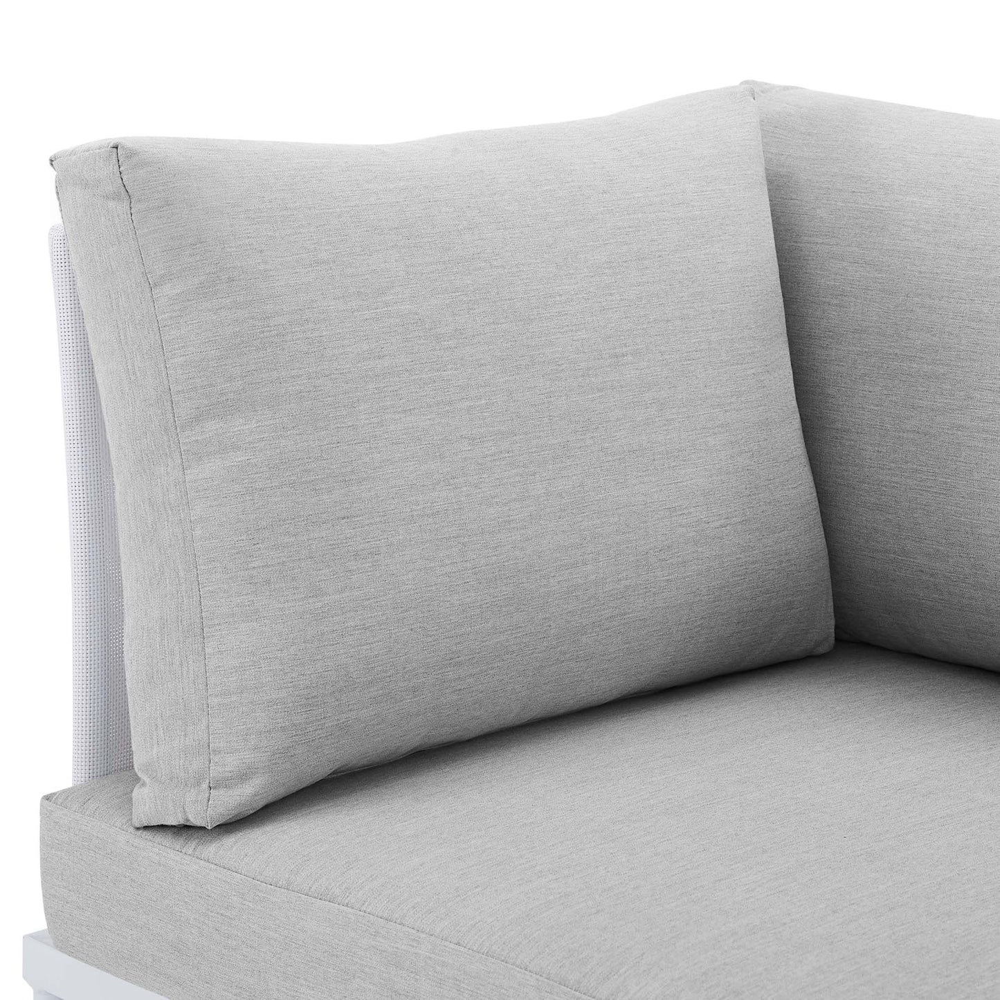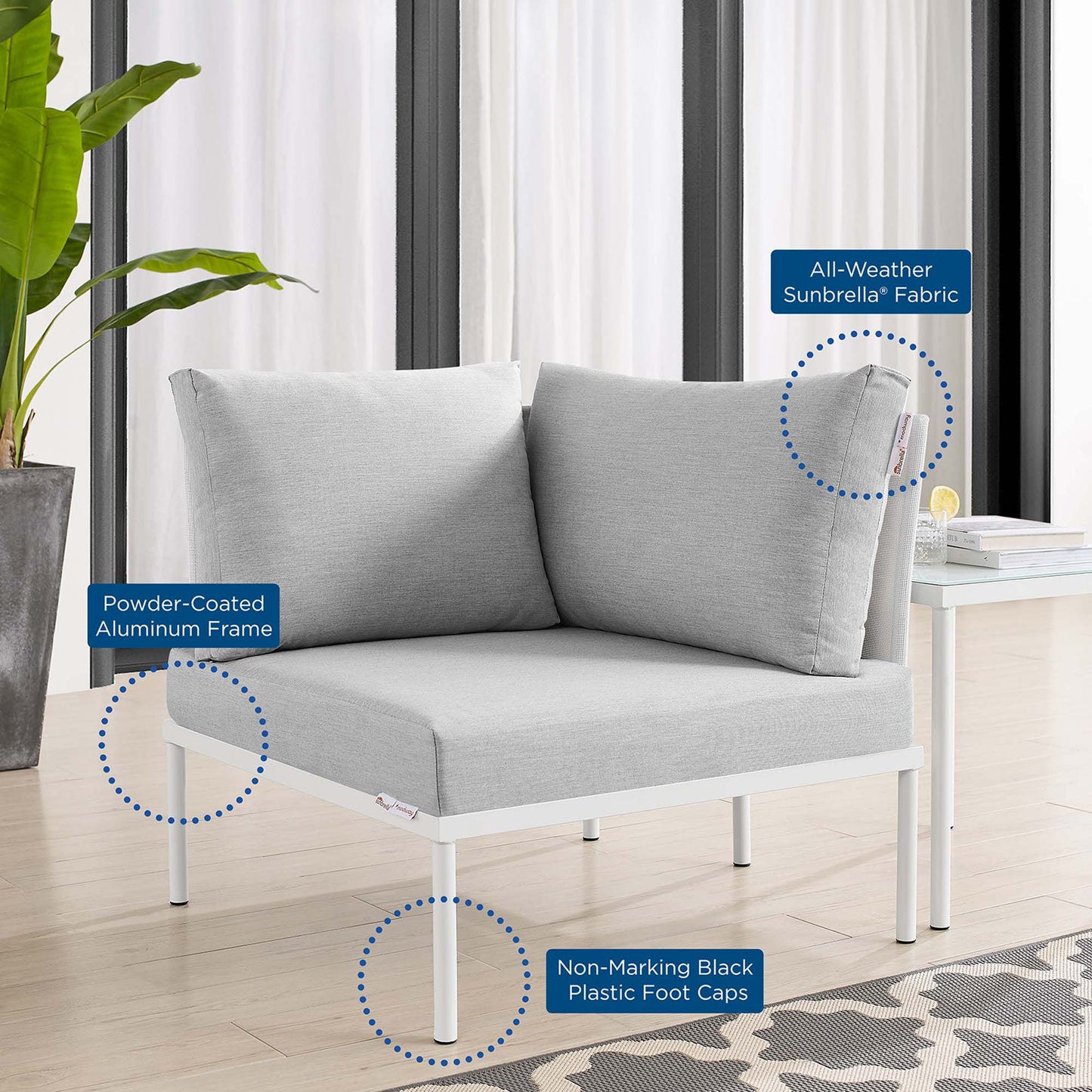 Engage life with Harmony Outdoor Patio Corner Chair. Enjoy casual conversation under the open sky with an all-weather waterproof outdoor sofa chair from a versatile furniture set that delivers an exceptional outdoor porch, patio, balcony or garden experience. An exceptional modern outdoor furniture set that exceeds expectations, Harmony Patio Corner Chair comes with soft and durable polyester Textiline® panels, square powder coated aluminum bases, Sunbrella® cushions, and non-marking foot caps. An outside sectional corner chair that arranges according to the spontaneous needs of your guests, set your sights on open and inspired moments with the Harmony Outdoor Patio Collection.
