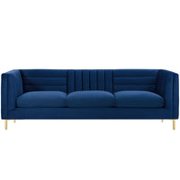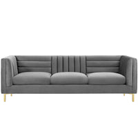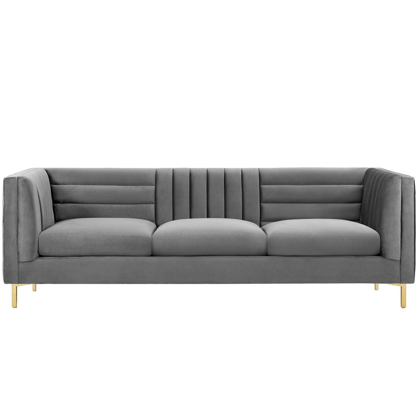 Regale visitors from the exquisite comfort of Ingenuity's luxe perimeters. This retro-modern sofa features a visually contrasting channel tufting that introduces an energetic and lively welcome for your living room or lounge area. Soft, stain-resistant performance velvet upholstery covers the sofa's solidly constructed wood frame. Ingenuity features dense foam cushions for a premium seating experience. Four stylish gold stainless steel legs offer solid support in this comfortable centerpiece for the modern home.