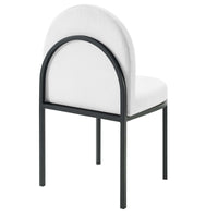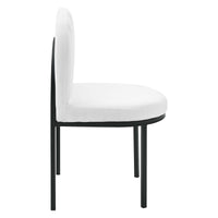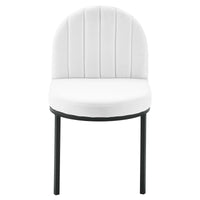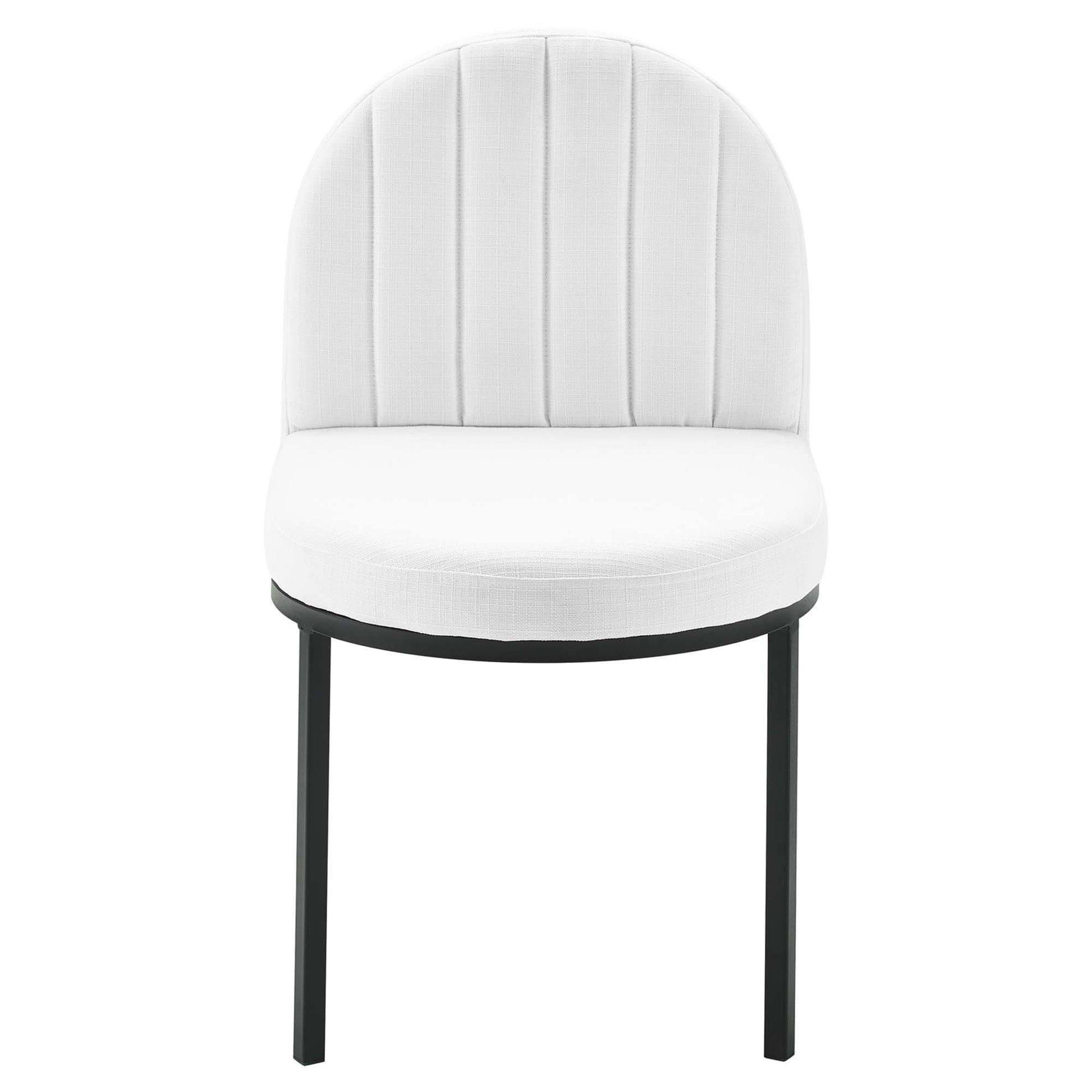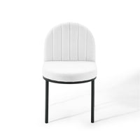 Reinvent your dining room decor with the vintage glamour of the Isla Channel Tufted Upholstered Fabric Dining Room Side Chair. Featuring a vintage clamshell design and the bold lines of channel tufted accents, the Isla Dining Accent Chair is a piece to be remarked upon by guests and friends. Dense foam padding provides a comfortable seat, while soft and durable polyester fabric upholstery creates a luxe elegance for long-lasting use. The curved matte black stainless steel frame on the Isla Side Chair has four legs with non marking foot caps to protect flooring. Chair Weight Capacity: 331 lbs.