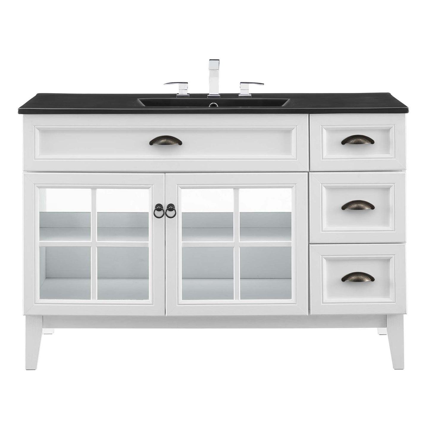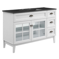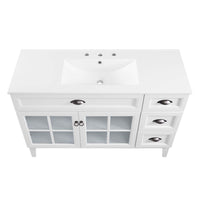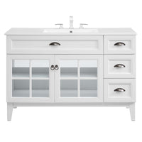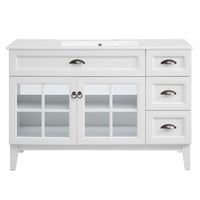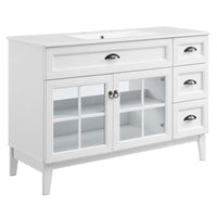 Invite the provincial charm of the Isle 48" Bathroom Vanity Cabinet to transform your bathroom space. Made of sturdy particleboard and MDF, Isle’s coastal contemporary design features a fixed drawer, three side drawers, and an adjustable shelf for under-sink storage behind two glass windowpane doors. A curved ceramic sink basin with an integrated countertop and 8" centerset faucet holes brings stylish functionality to this bathroom vanity. With a solid construction, this bathroom vanity cabinet brings contemporary design and coastal style to your bathroom space. Assembly required and fixtures not included.