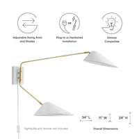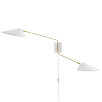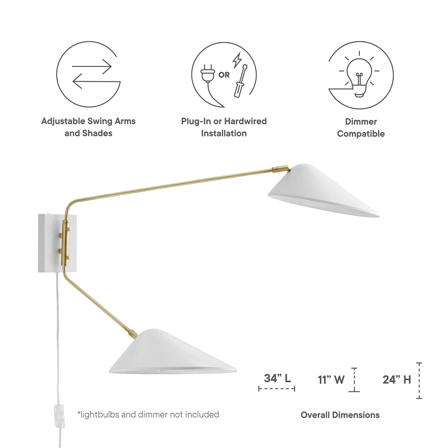 Experience visual comfort and pleasant reflections in your living room, bedroom, or hallway with the Journey 2-Light Swing Arm Wall Sconce. This mid-century modern wall lamp features a compact metal backplate and sleek matte shades anchored on satin brass rods. With left-right adjustable swing arms and complete swivel lampshades, Journey is a multi-directional luminary in the entryway. The Journey Wall Lamp features an innovative 2-in-1 design that allows you to plug it in anywhere or create a sleek cordless look with the hardwire option, professional installation required. Clear power cord with On/Off switch. Requires 2 E26 bulbs, 40W max, or LED equivalent (not included). Compatible with dimmer switches (not included).
