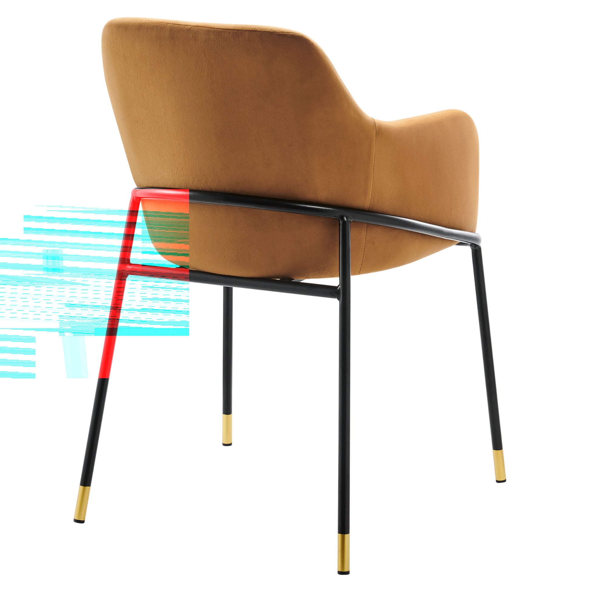 The clean lines and smooth curves of the Jovi Performance Velvet Dining Armchair unite to make this a stylish addition to your dining room or an alluring accent in your living room or hallway. Minimalism meets glam deco style to create this tasteful dining chair that complements your mid-century, modern, or transitional decors. This retro modern dining chair rests on black powder-coated metal legs with gold accents that blend beautifully with the stain-resistant performance velvet upholstery. The captivating curves of the arms and back convey movement while the padded seat cushion evokes restfulness. The Jovi Performance Velvet Dining Armchair comes with non-marking foot pins to protect your flooring.